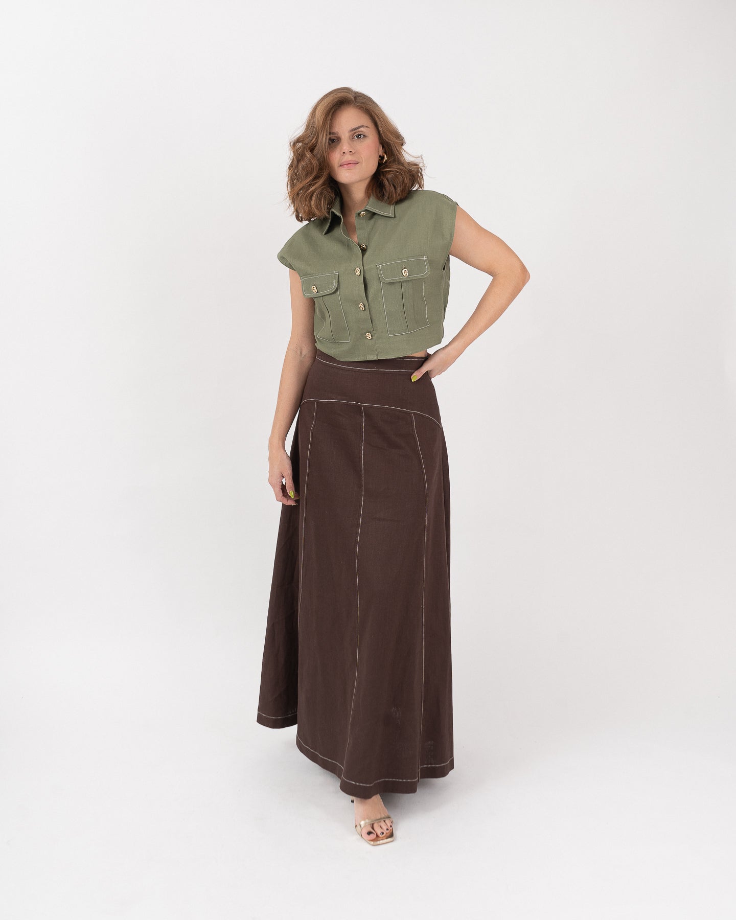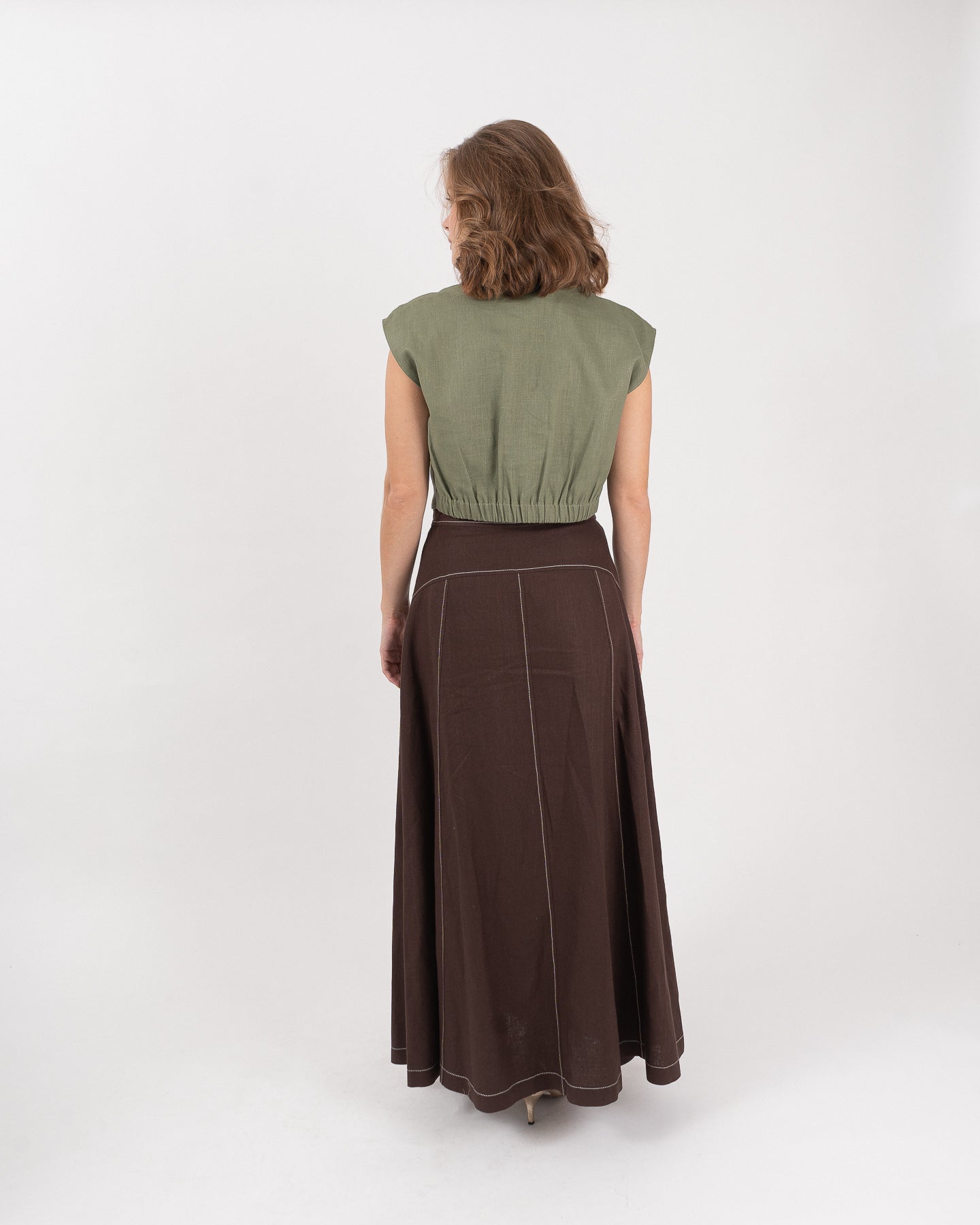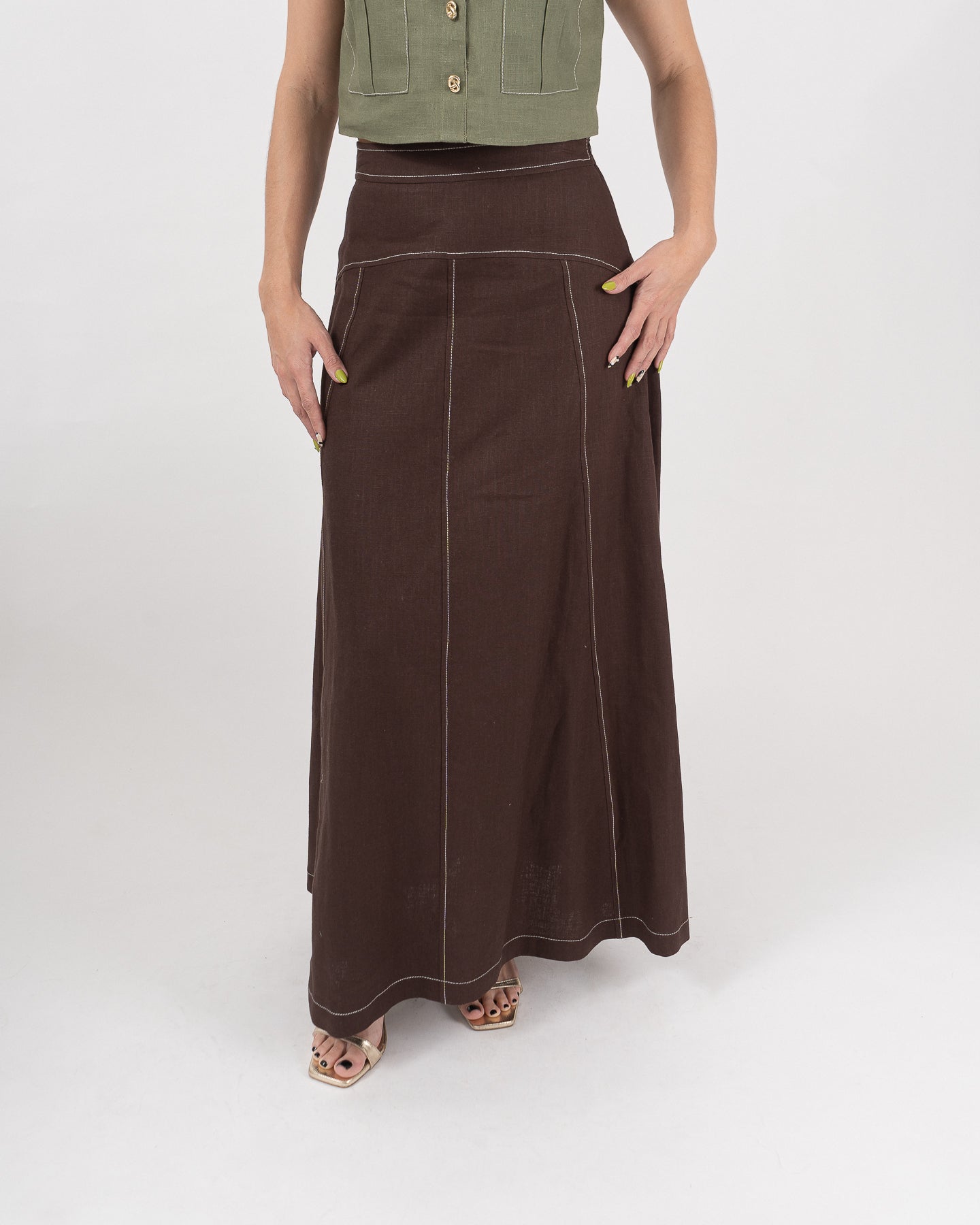 Falda amplia con detalle de cortes y sobrecosturas con hilo en contraste