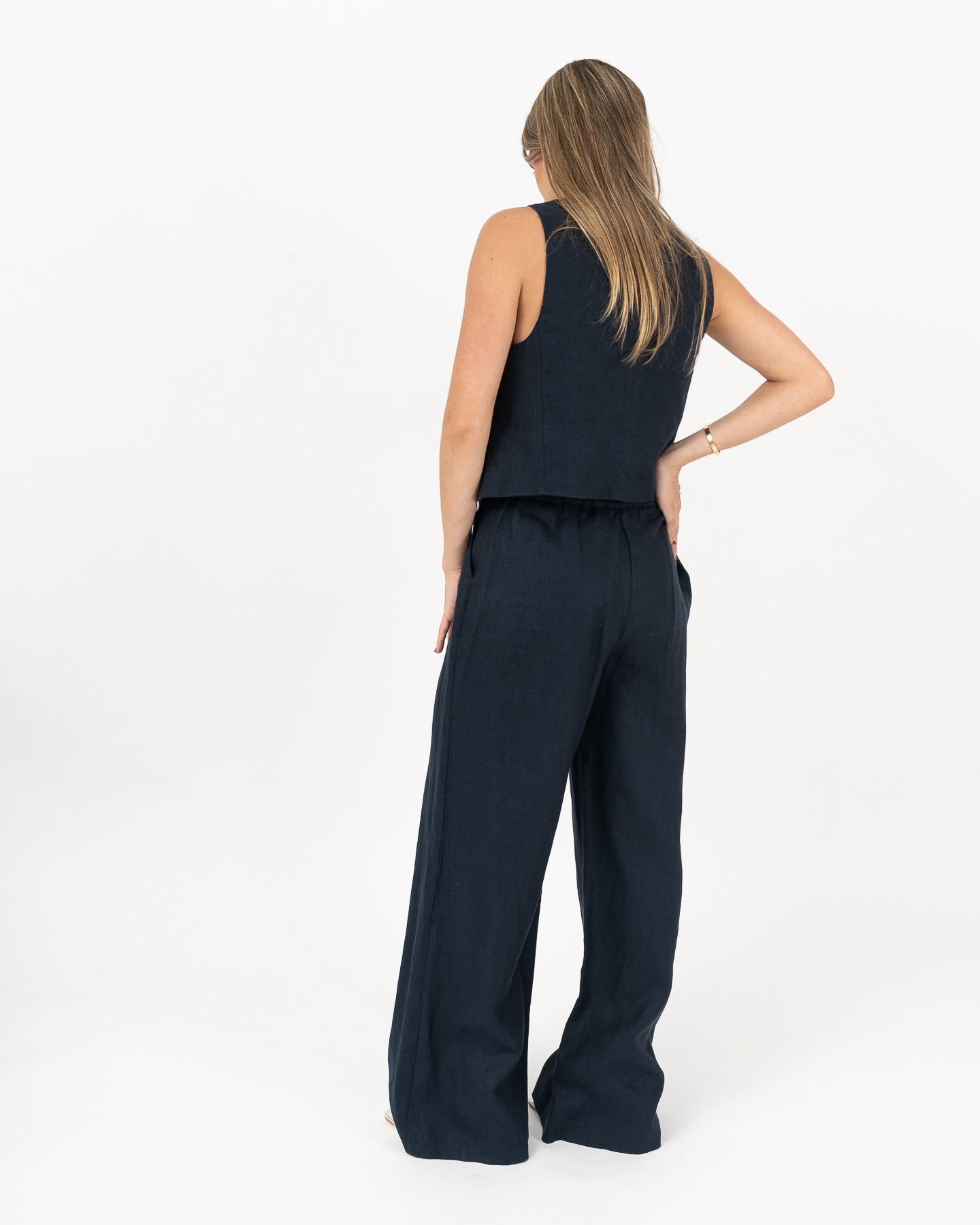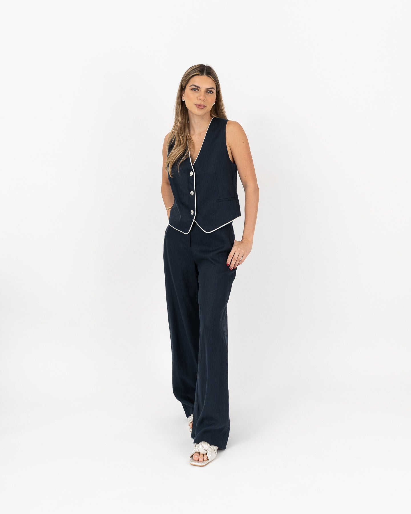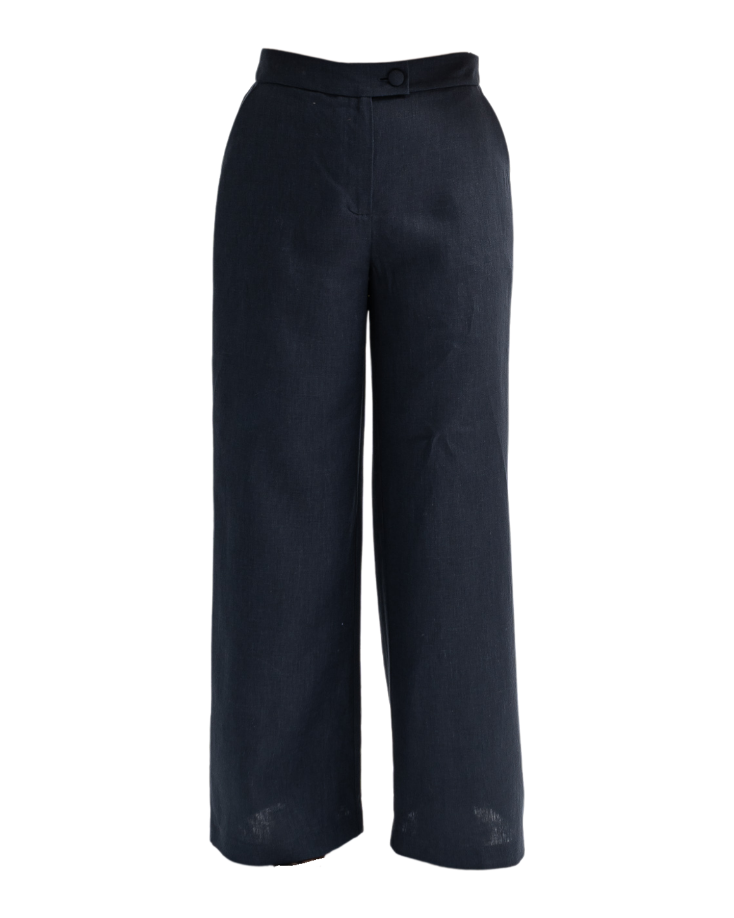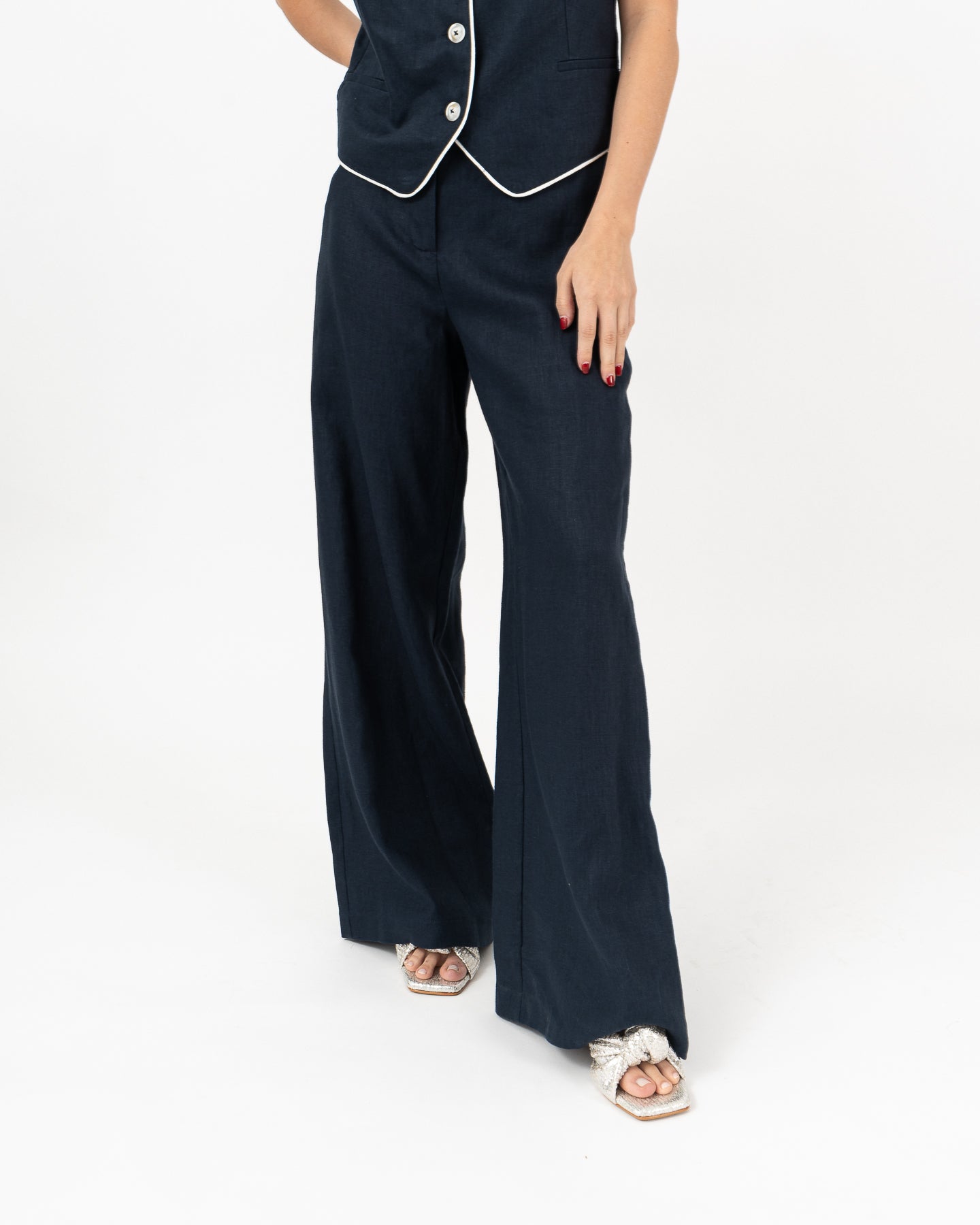 Pantalón de tiro alto, corte recto, con bolsillos en los costados y cintura elástica en la parte trasera.