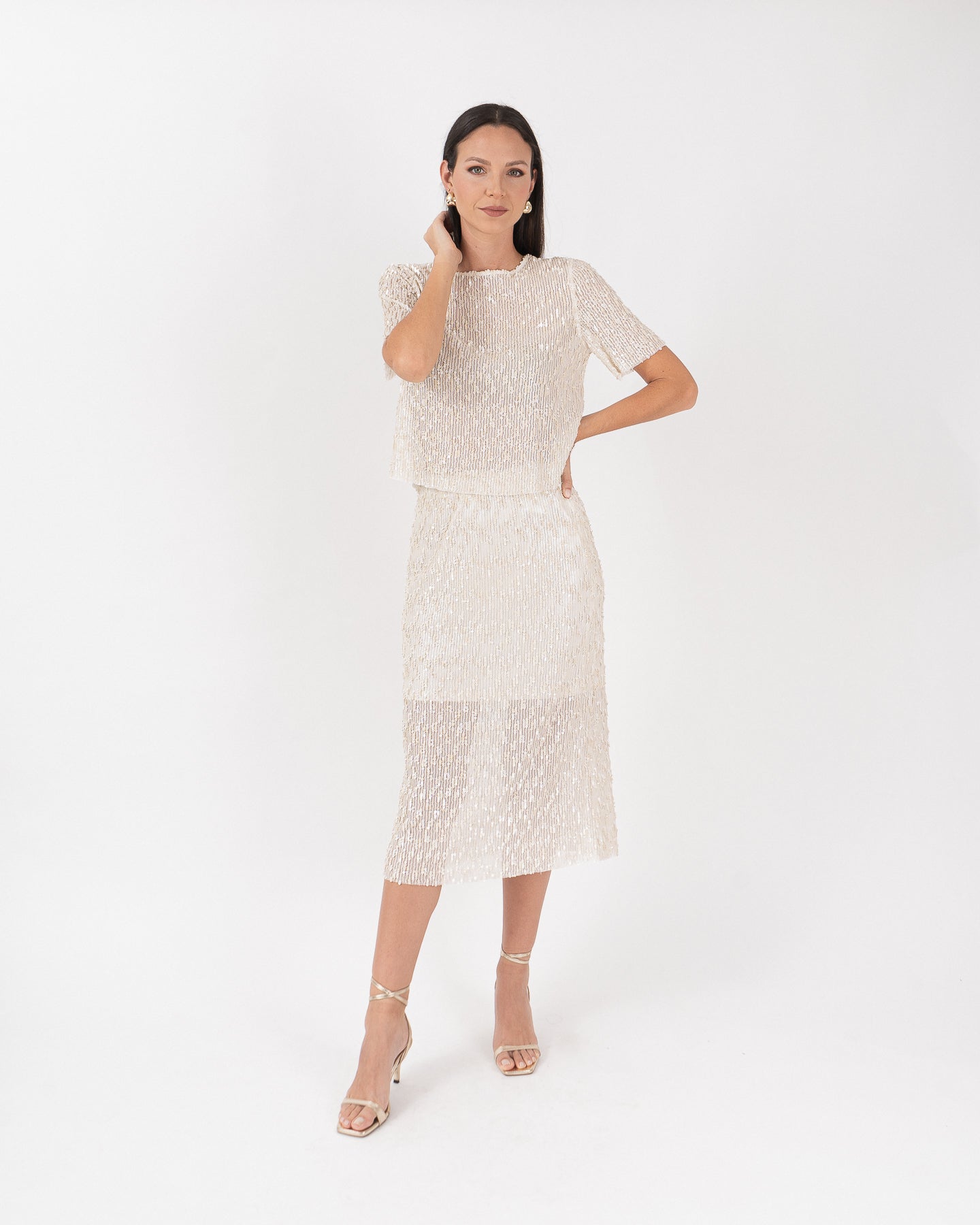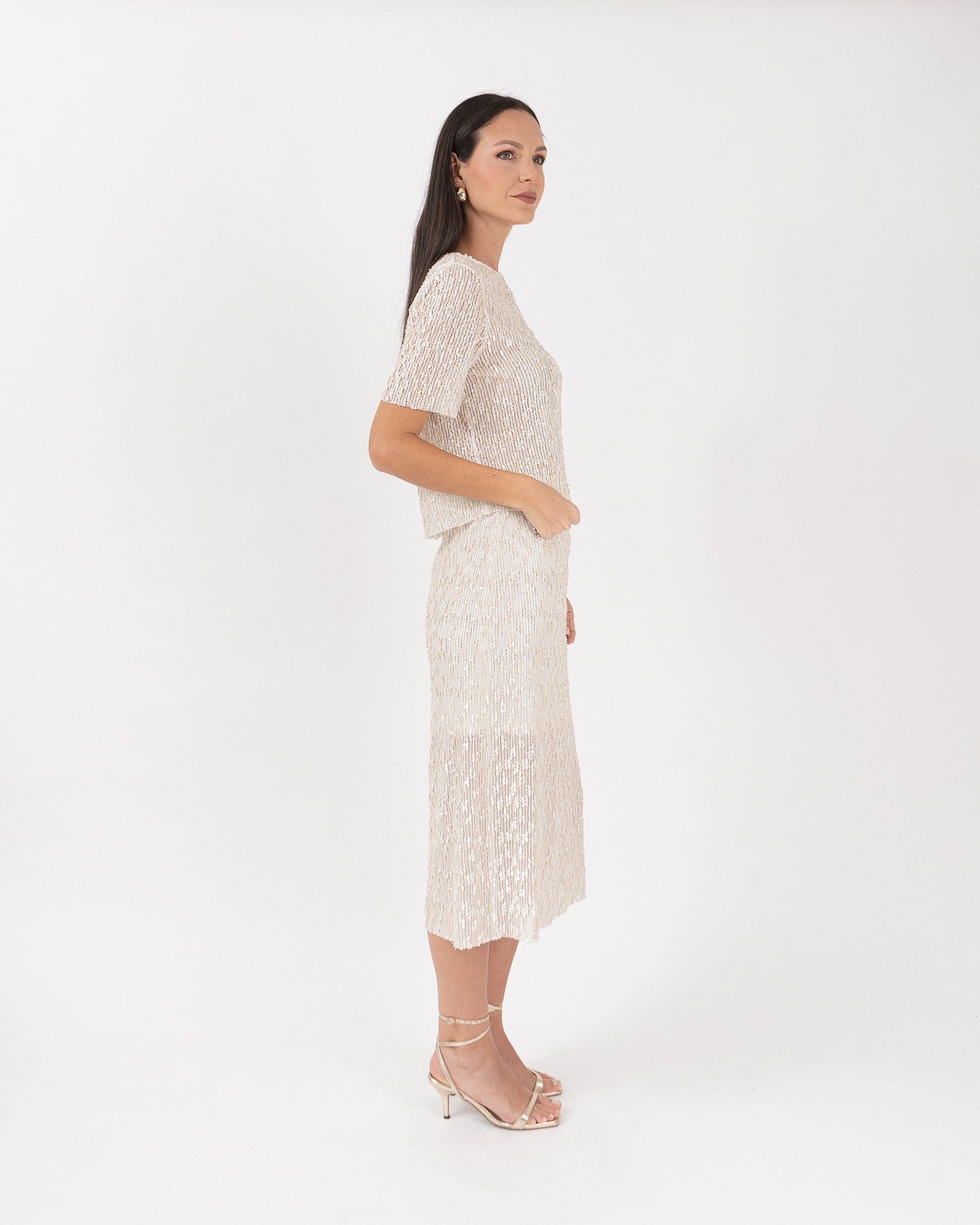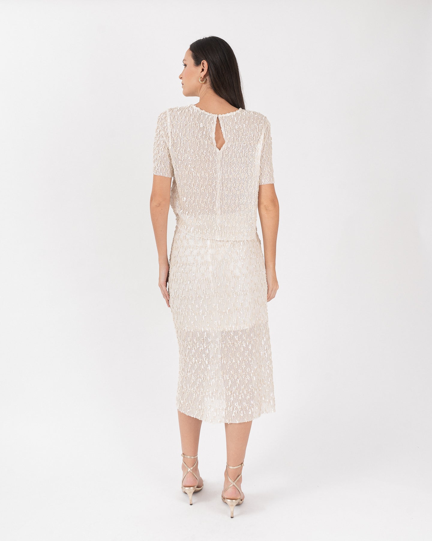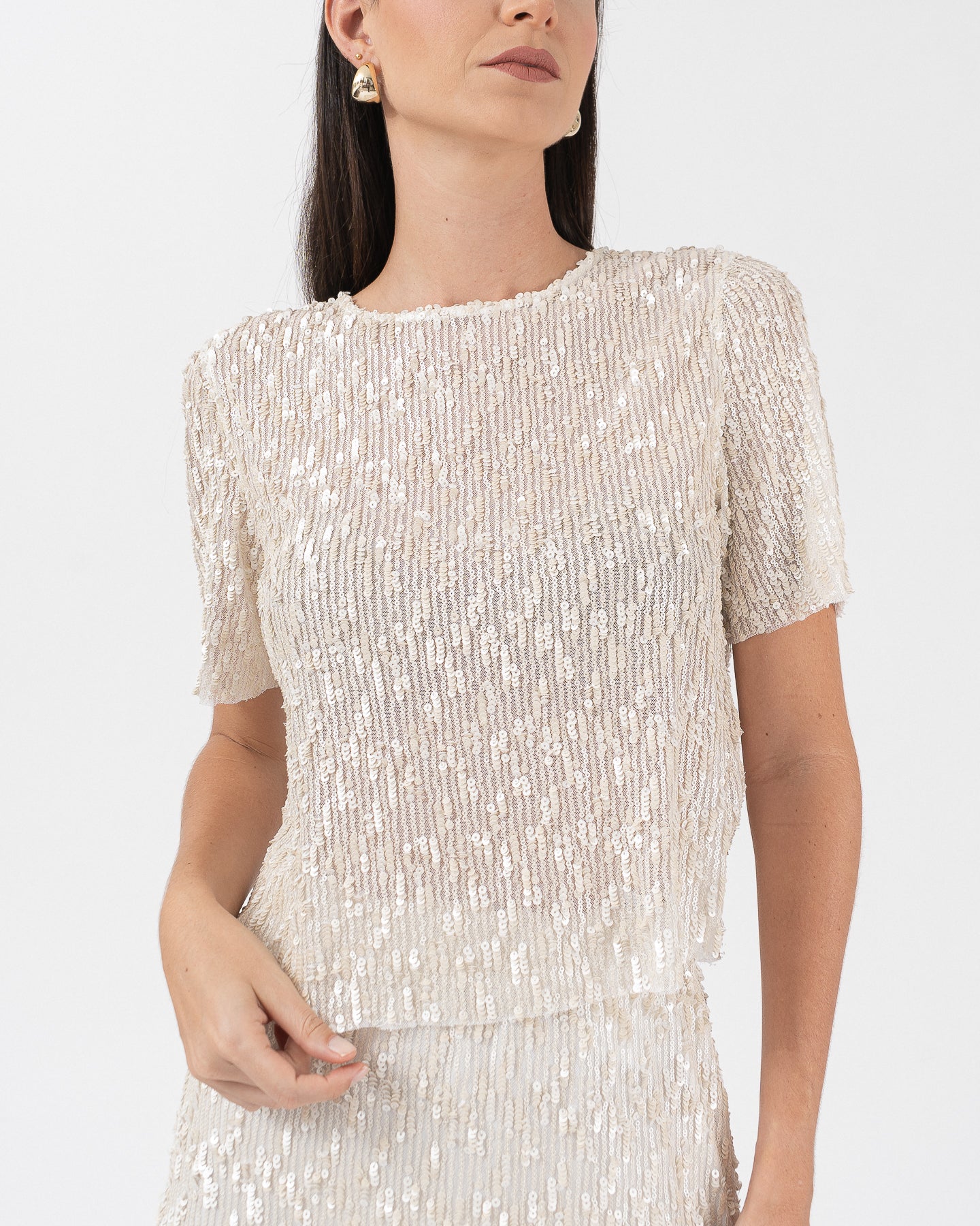 Blusa de lentejas manga corta escote redondo. Con abertura funcional en centro posterior.