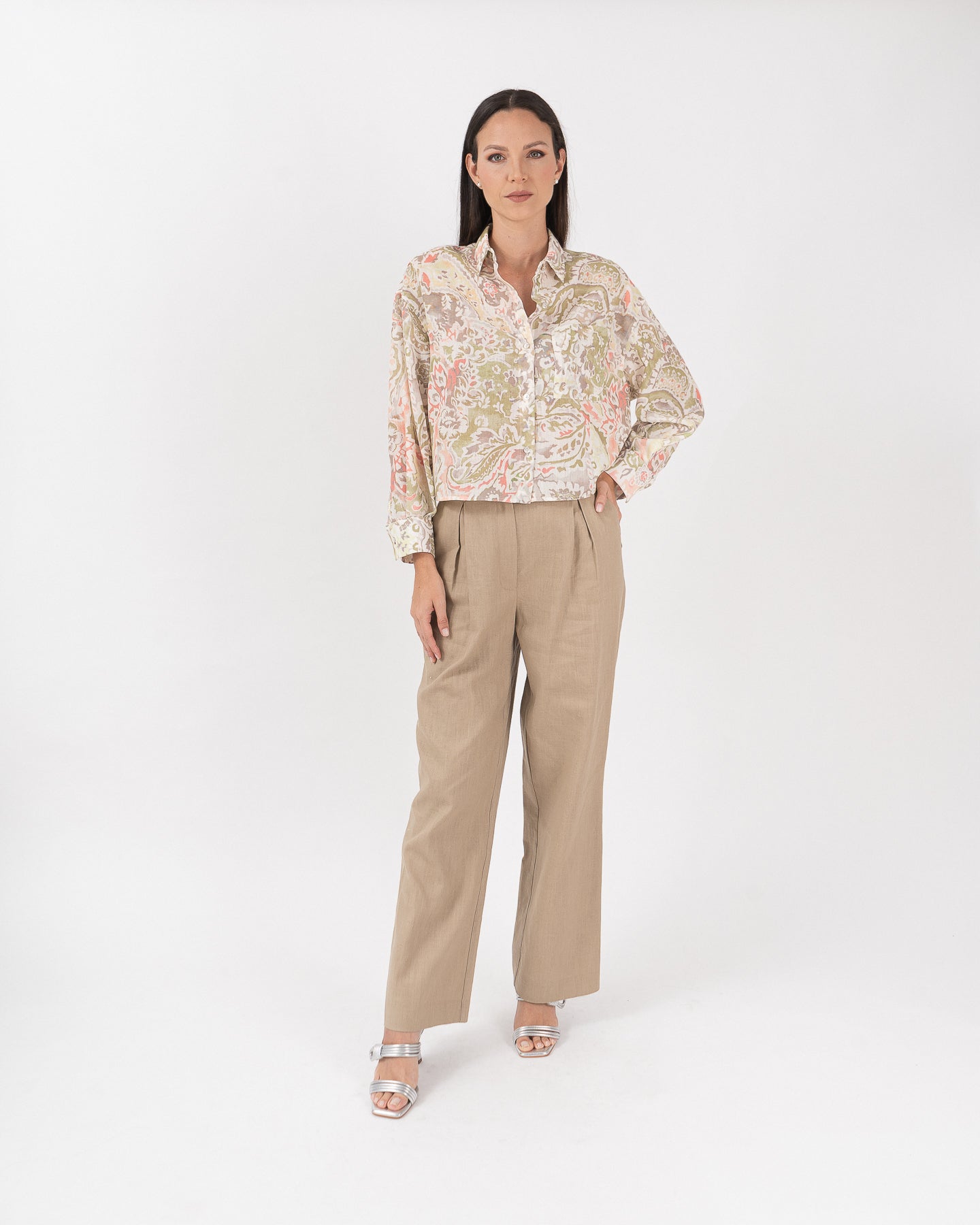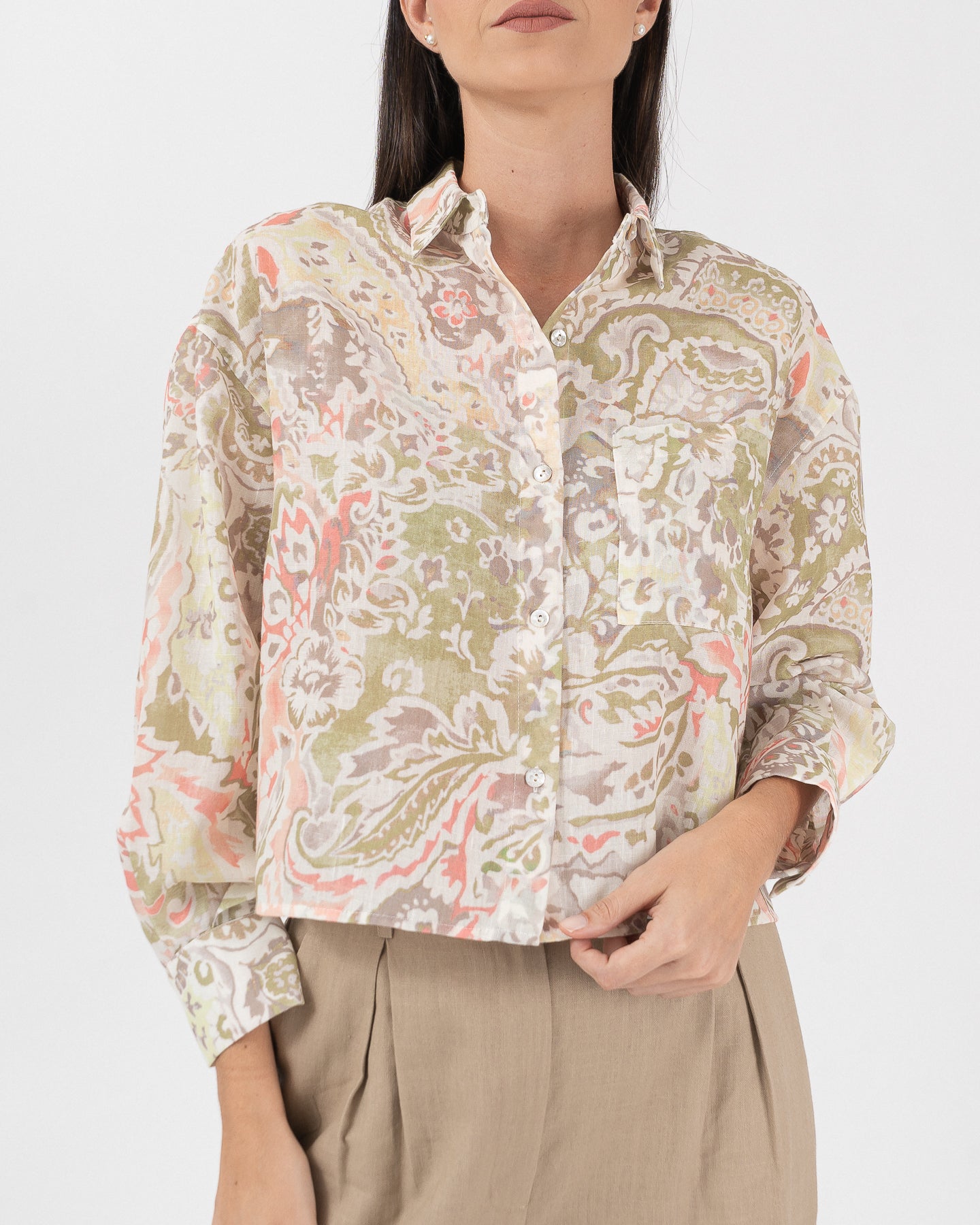 Blusa semi oversize cuello camisero con bolsillo funcional.