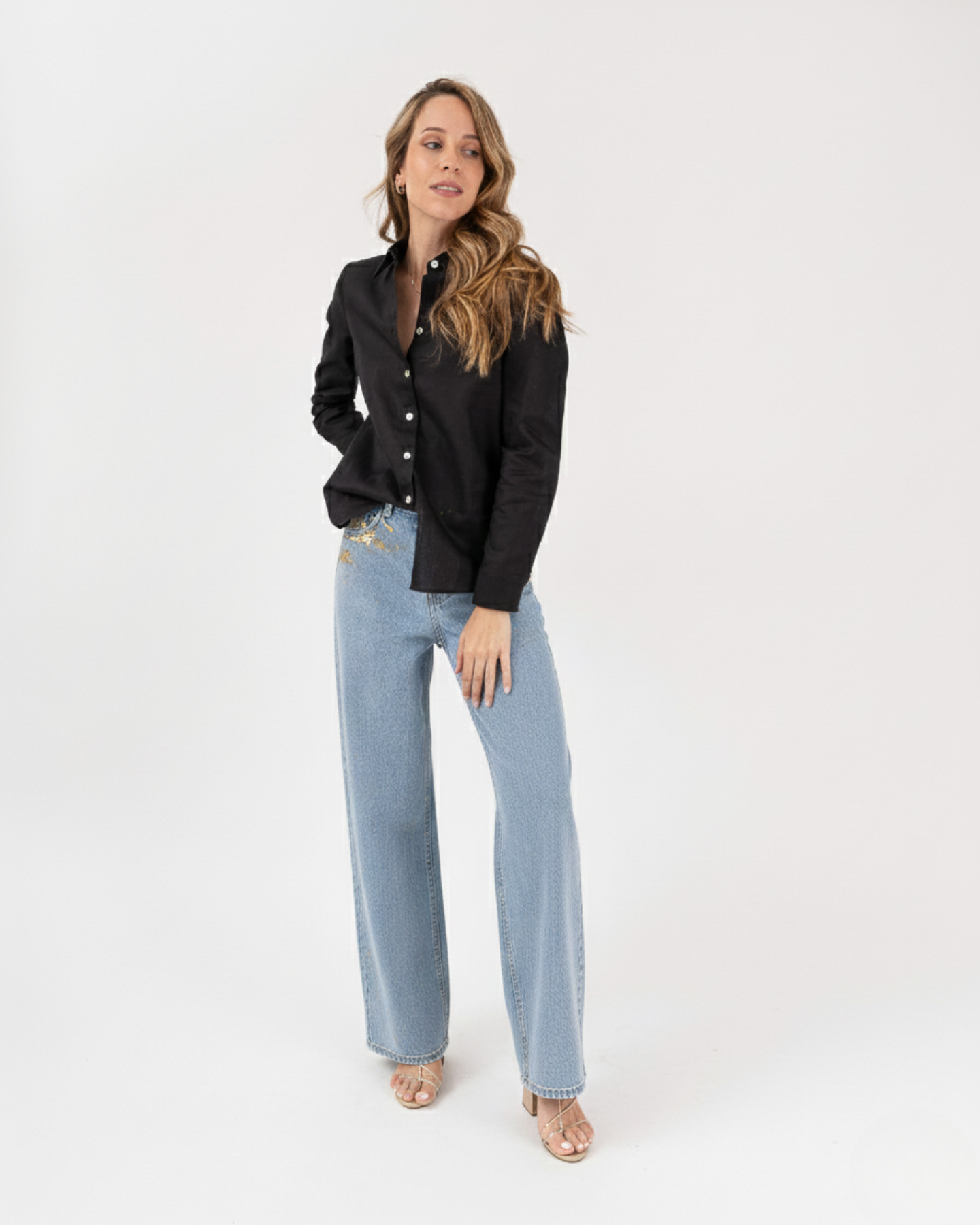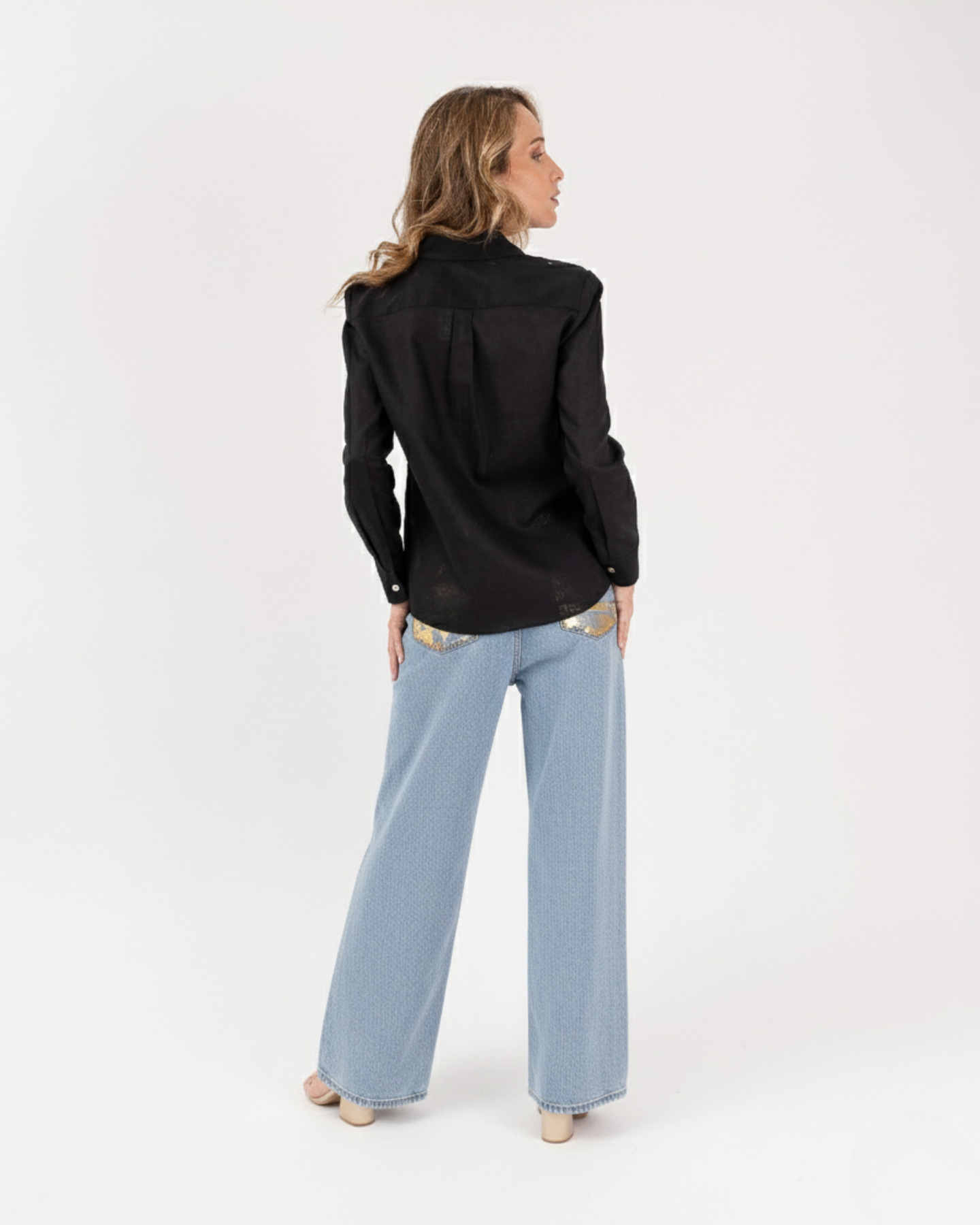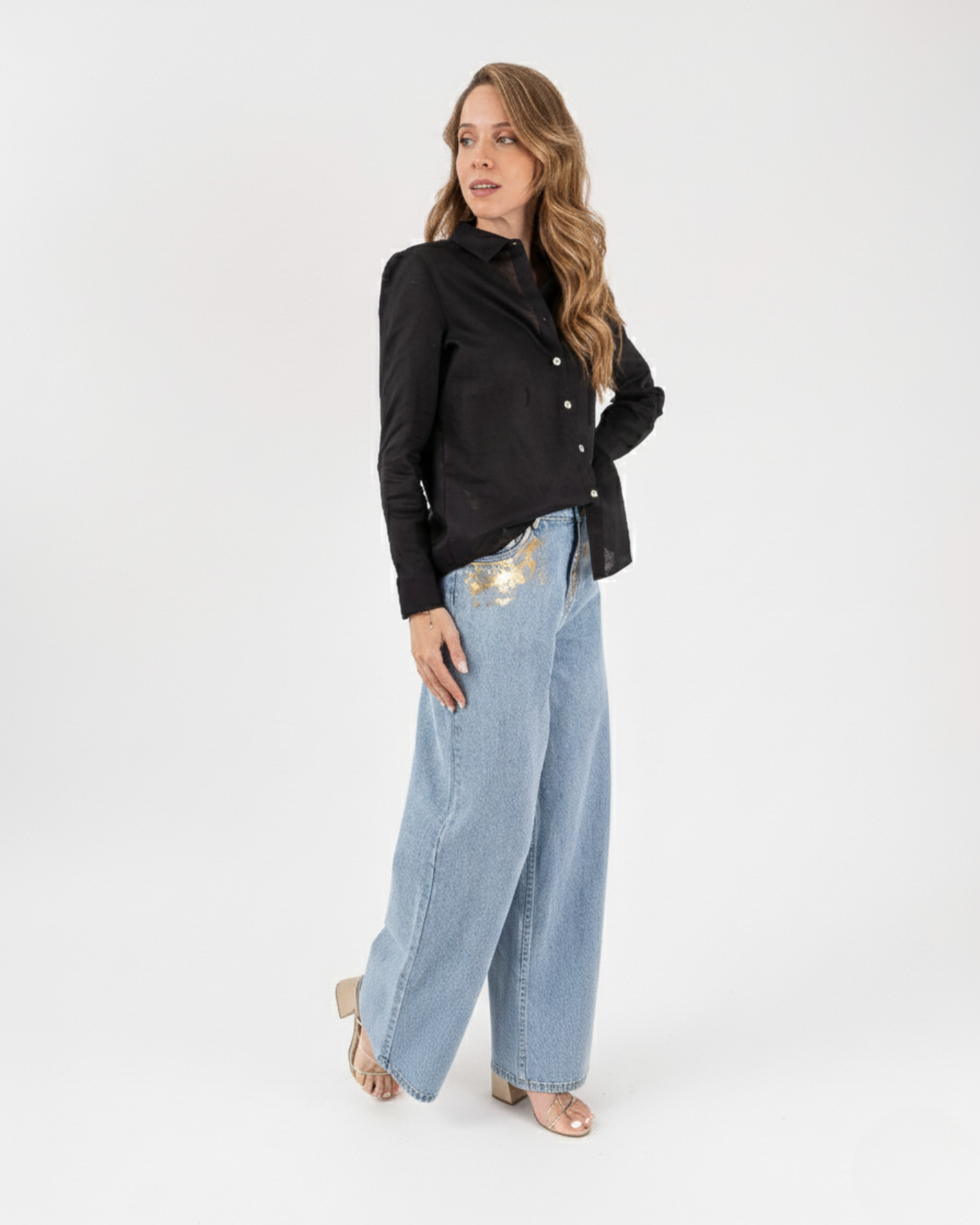 Blusa cuello camisero manga larga con puños, cierre frontal delantero con botones funcionales.