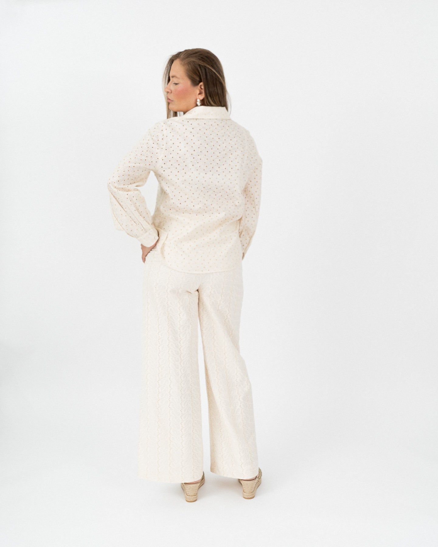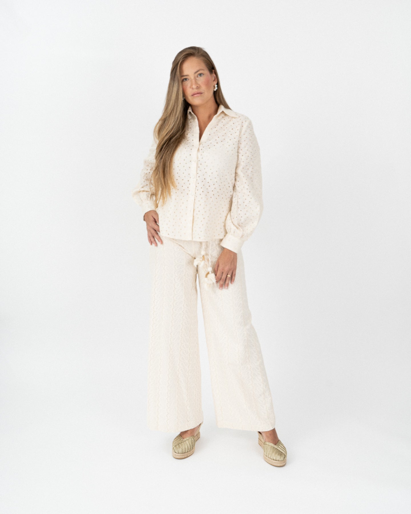 Blusa cuello camisero manga larga con puños funcionales, cierre frontal con botones forrados a tono.