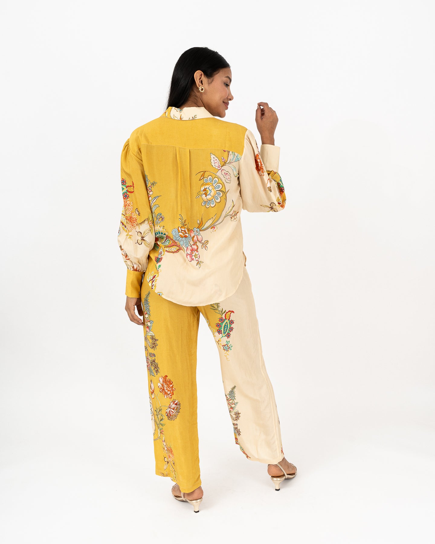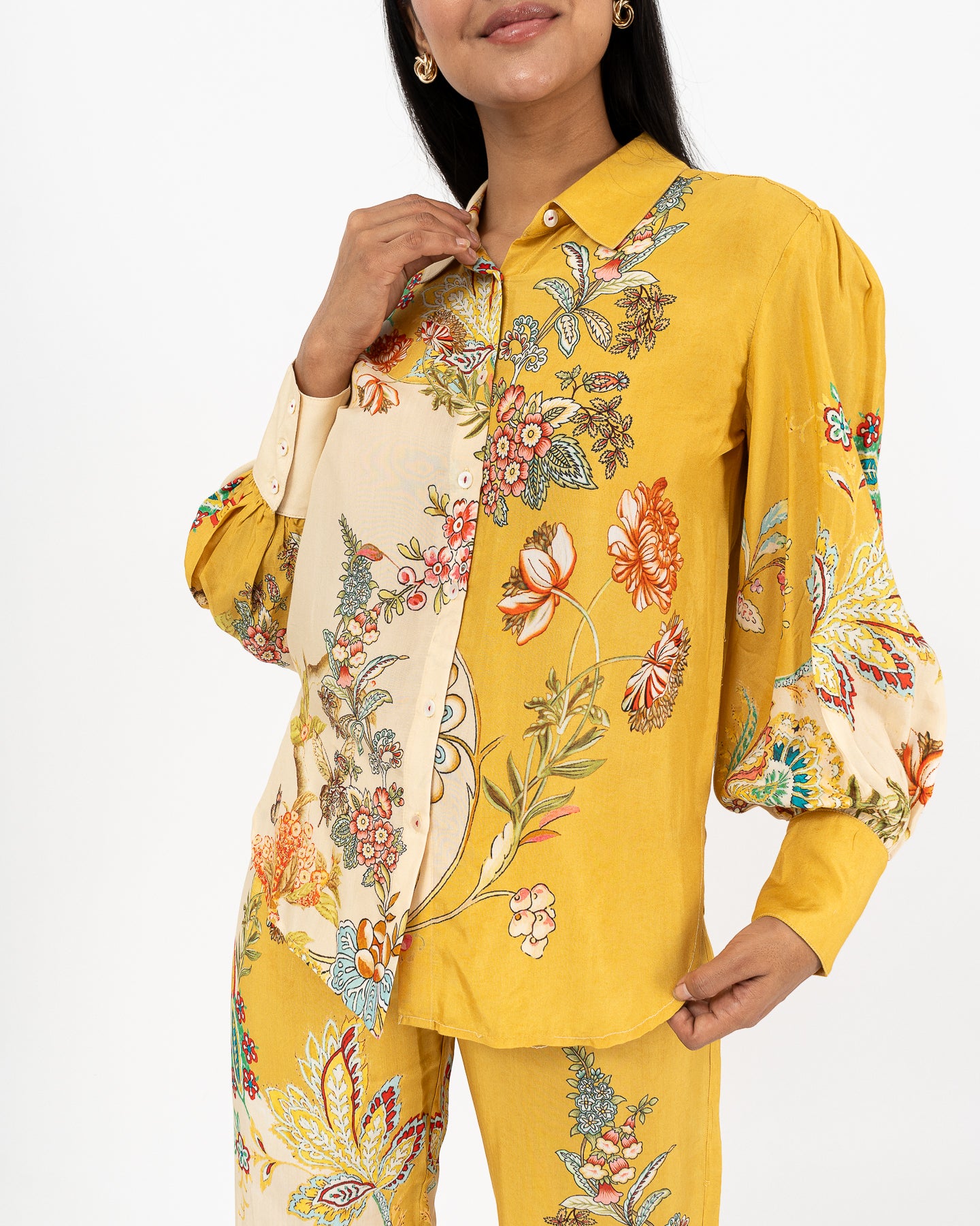 Blusa estampada floreada de cuello camisero, manga larga acabada en puño con cierre frontal de botones ocultos