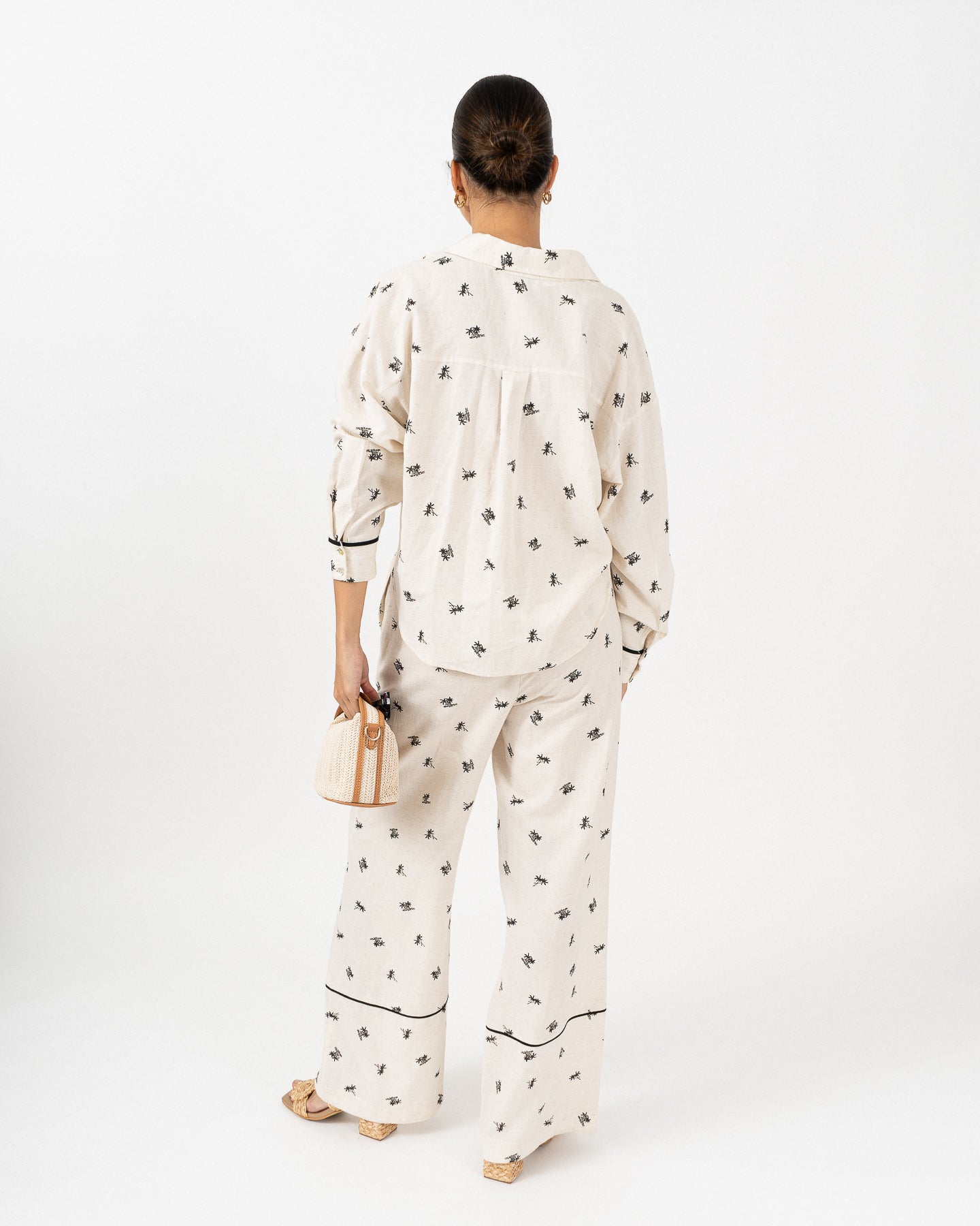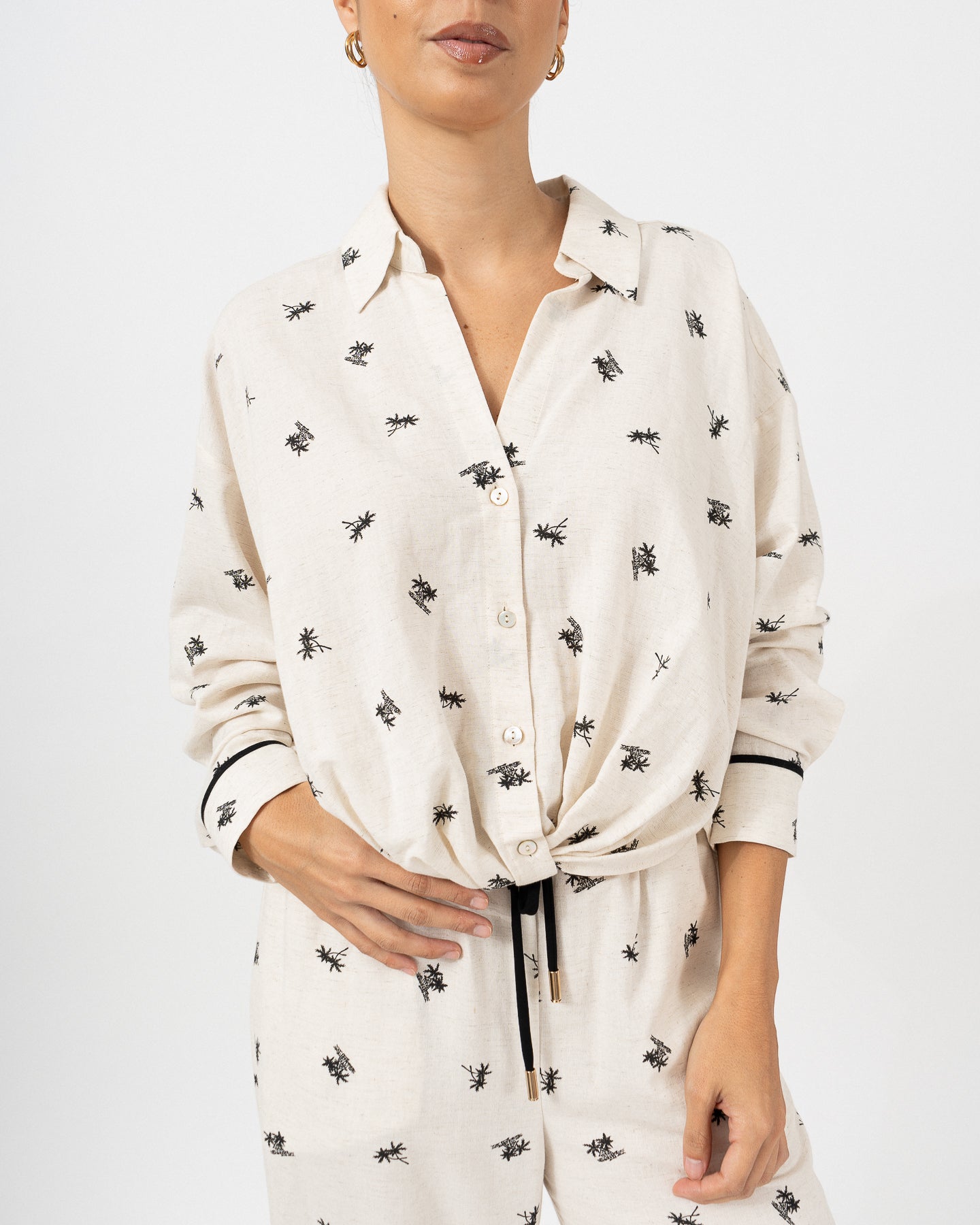Blusa cuello camisero manga larga con drapeado en ruedo delantero y colita en posterior. Detalle de sesgo combinado en puños.