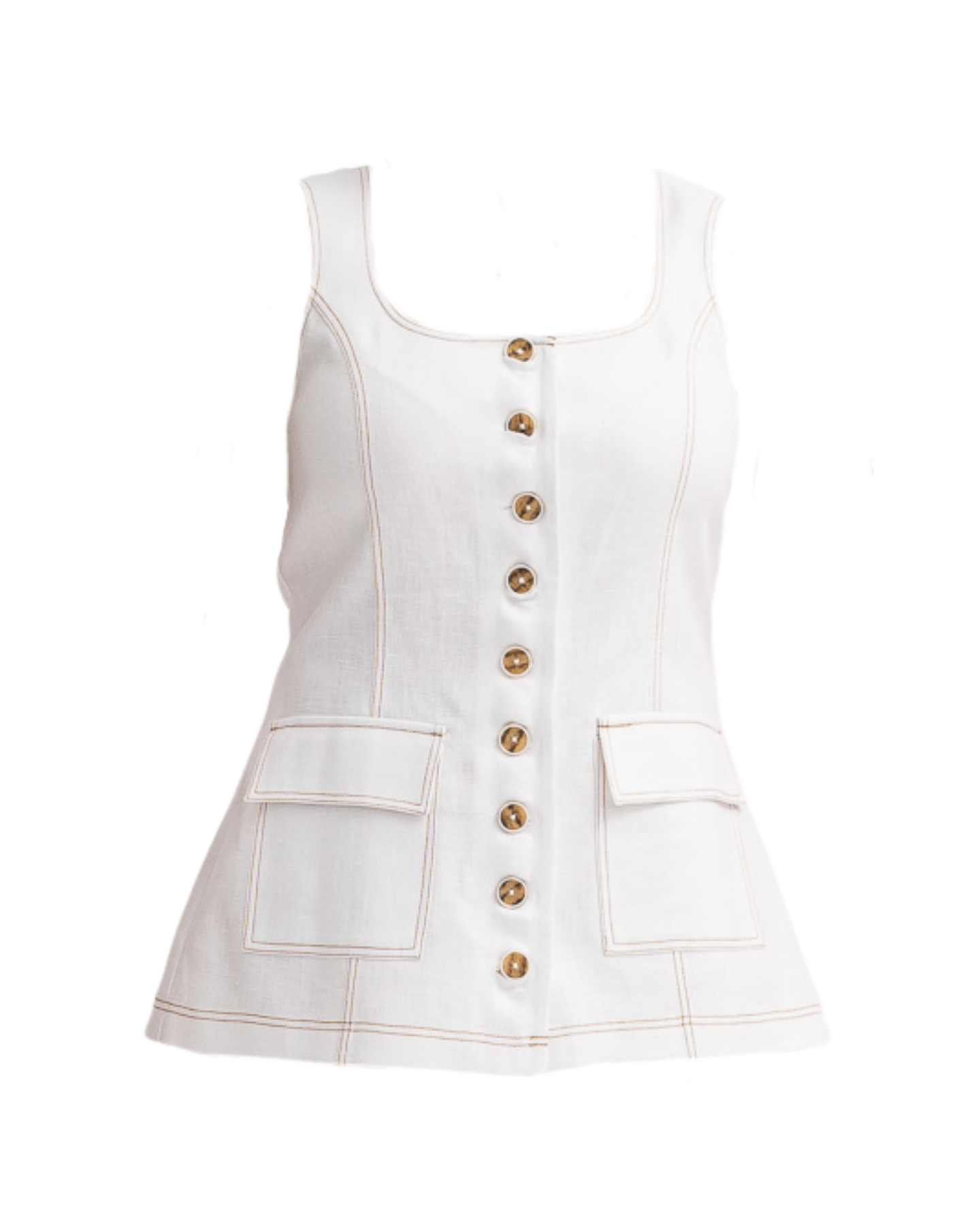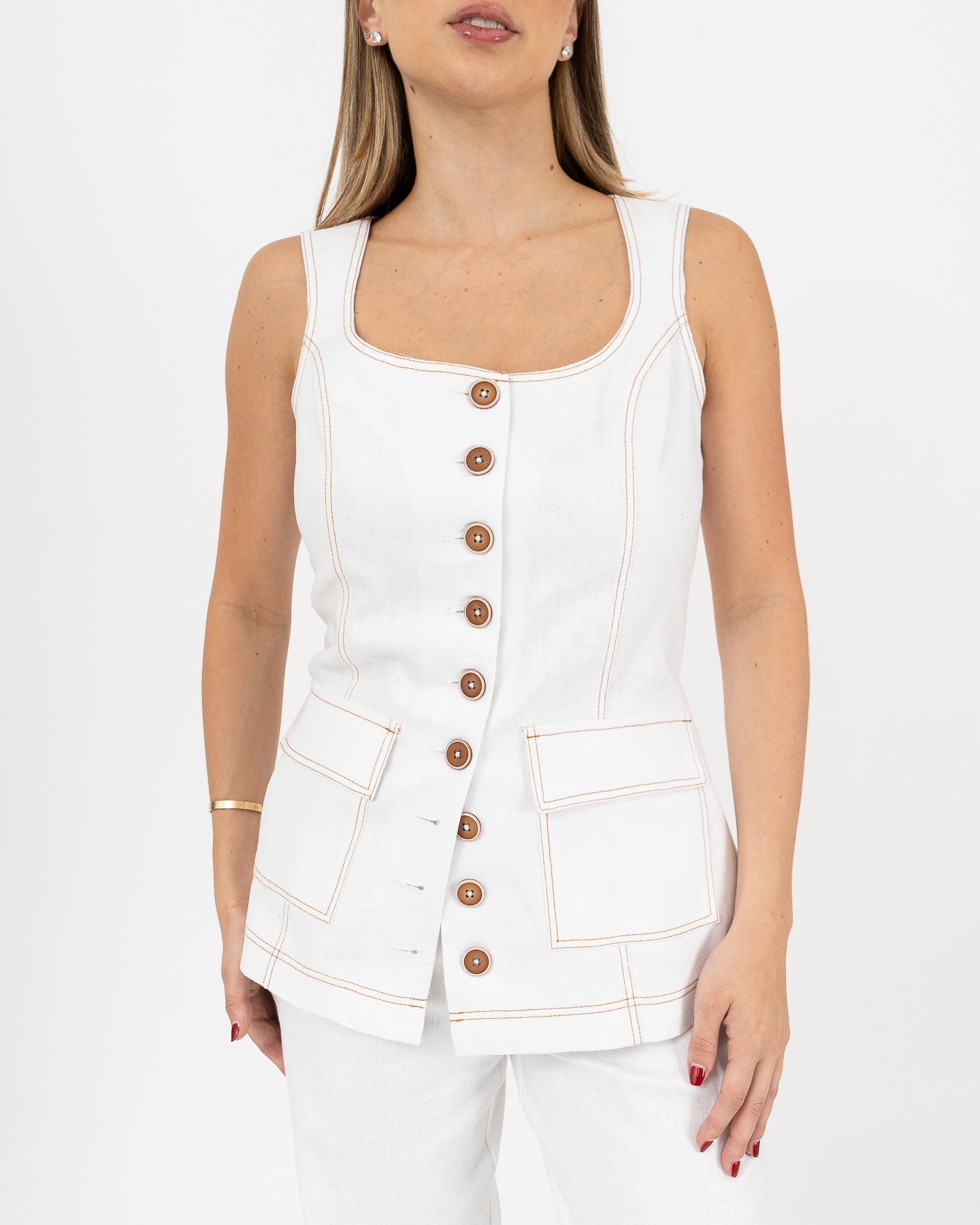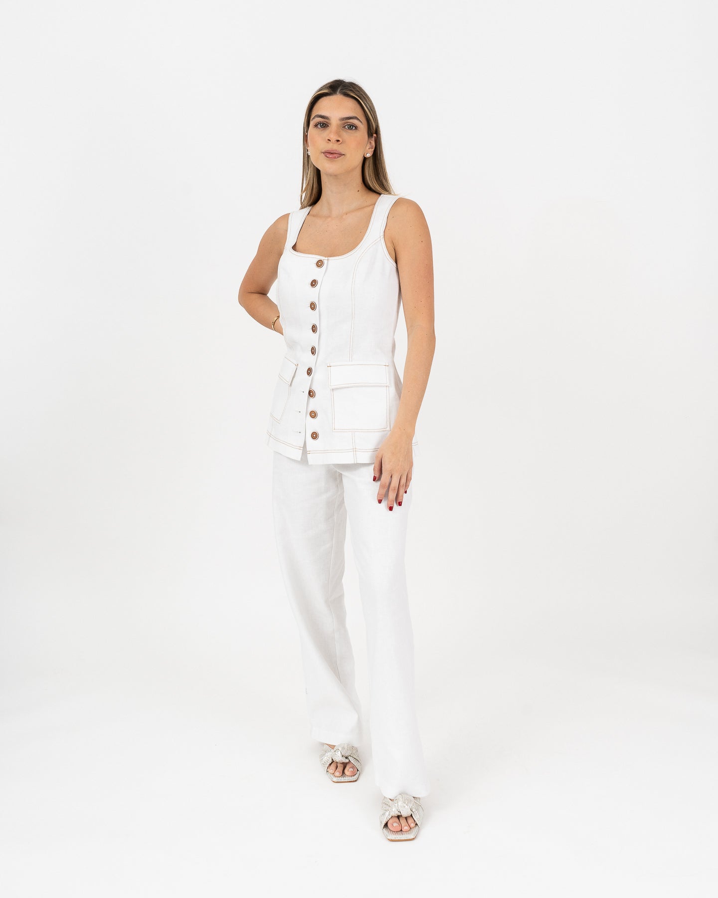 Chaleco manga sisa escote profundo  con detalle de costuras en contraste, cierre frontal con botones y tira de amarre en cintura posterior.