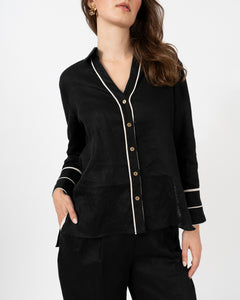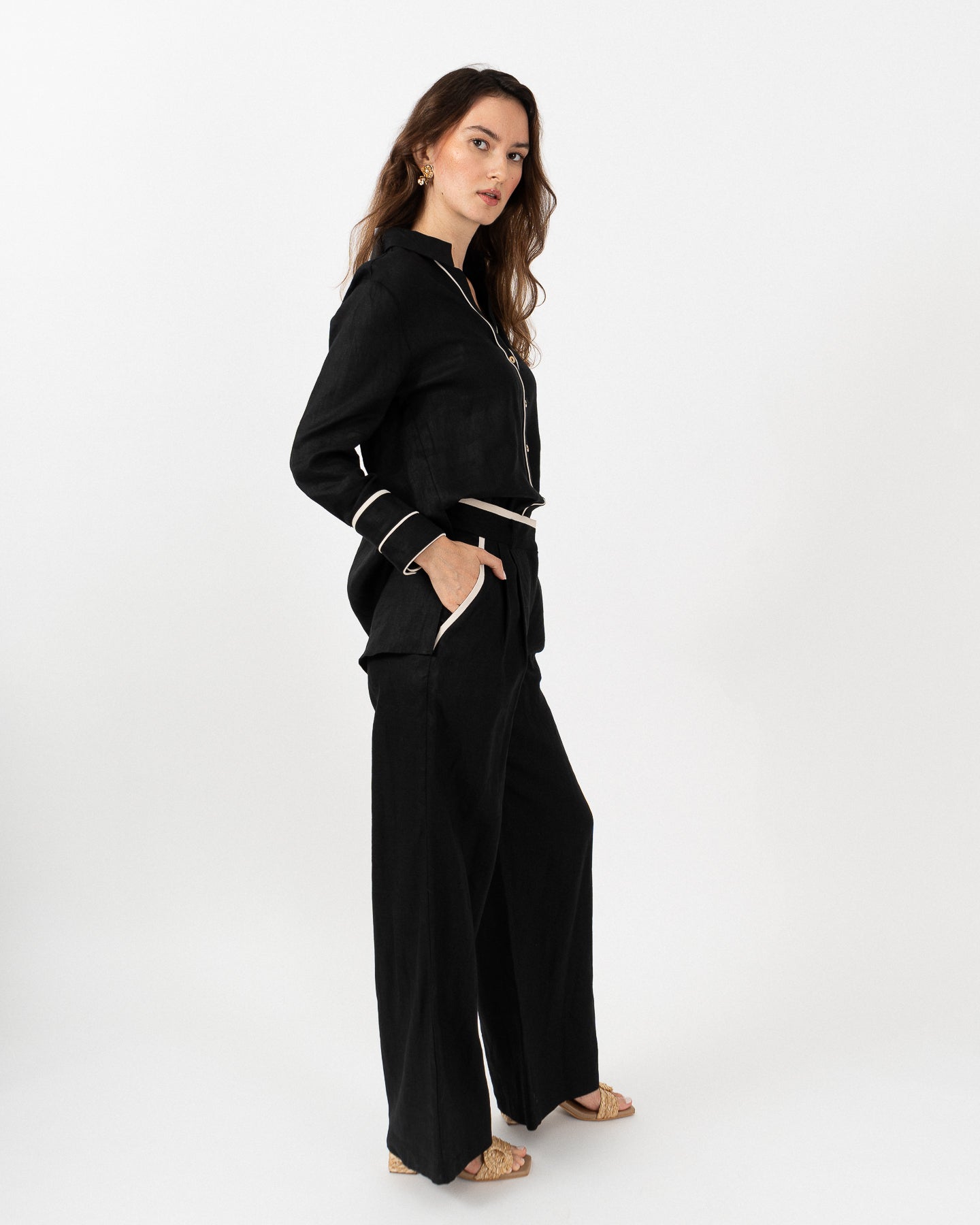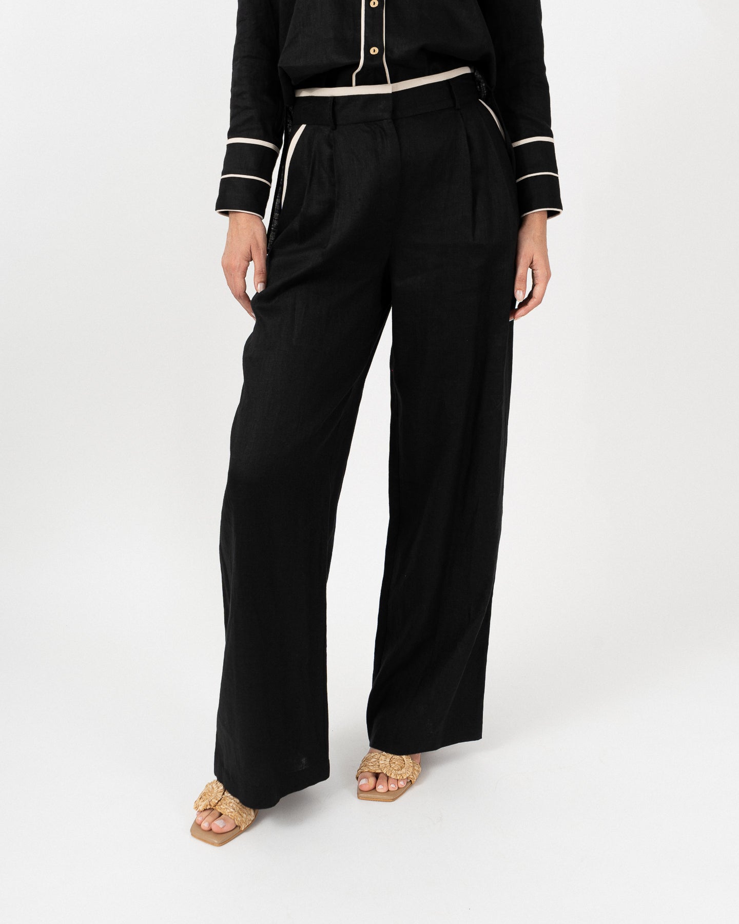 Pantalón de tiro alto combinado en contraste al filo de bolsillos y contorno de pretina.