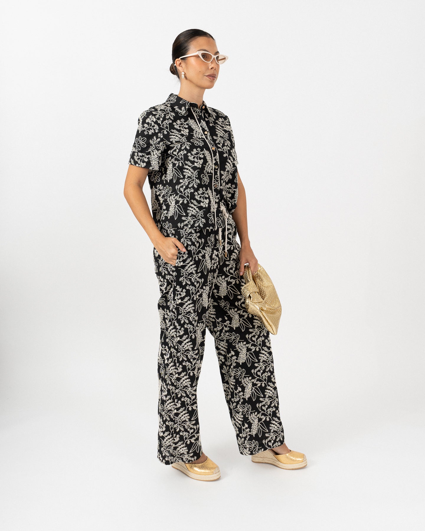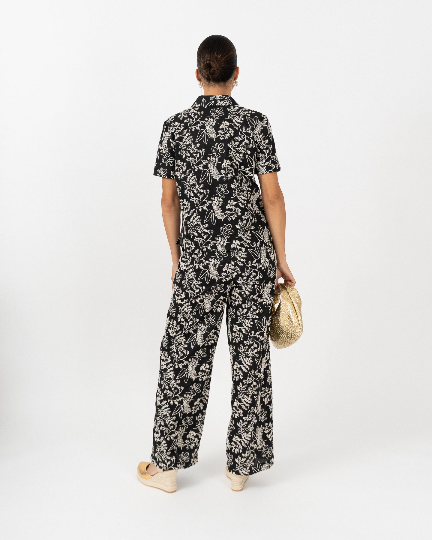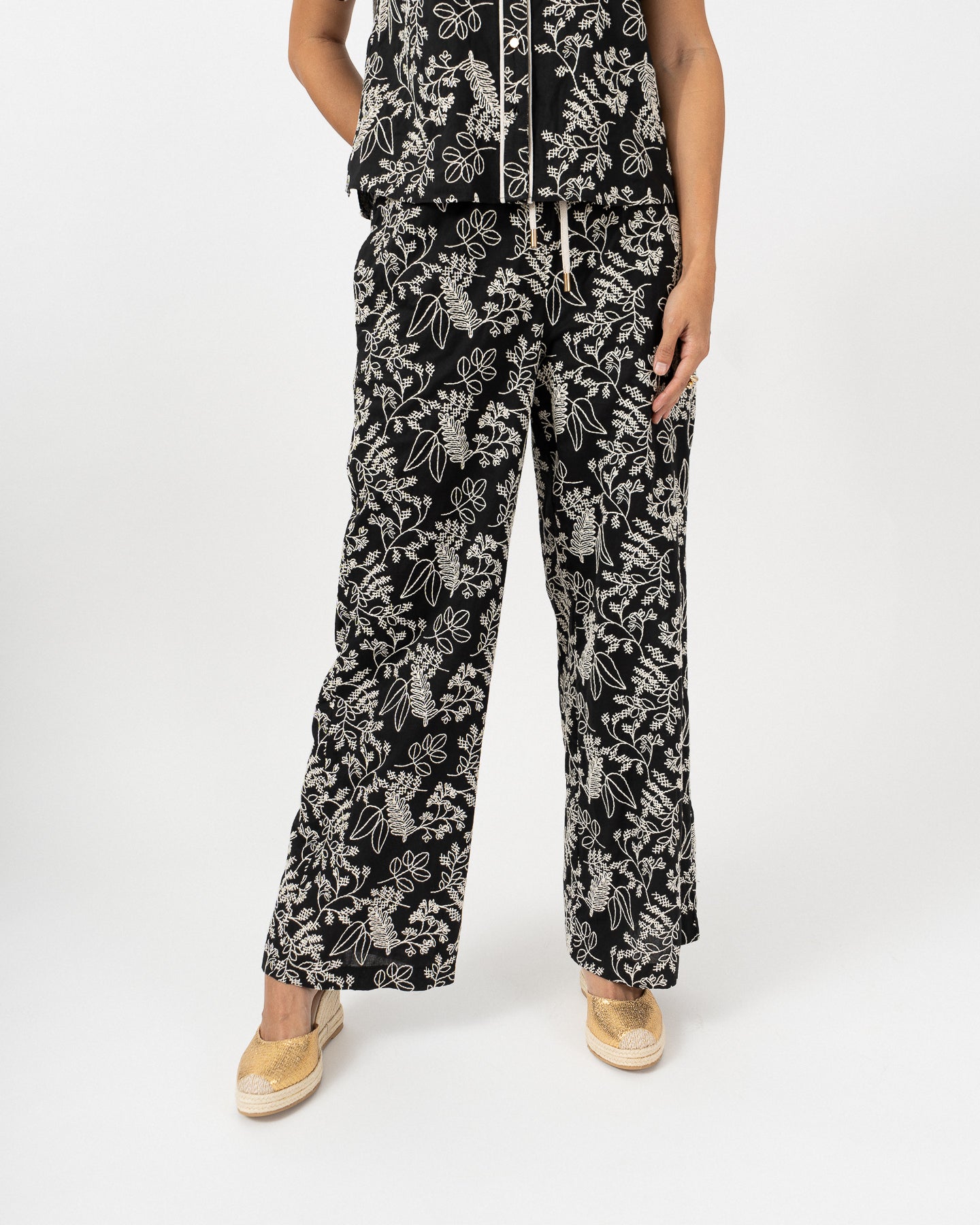 Pantalón de tiro de alto con elástico pasado en contorno de cintura y tira funcional para ajustar amarre.