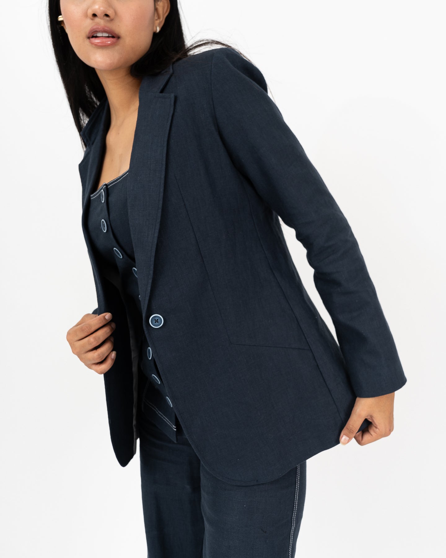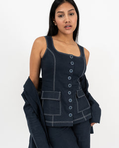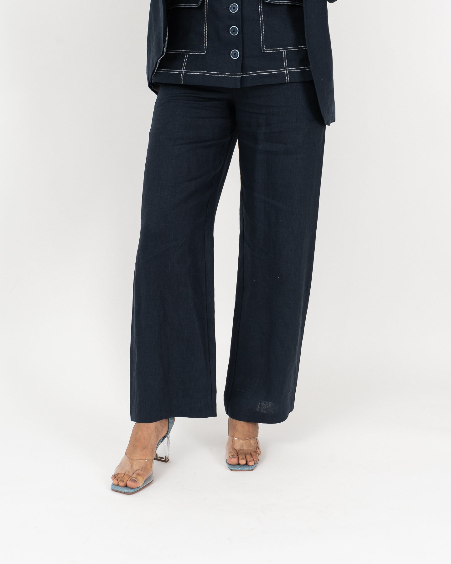Pantalón de tiro alto con bolsillos funcionales, pretina con botón. costuras decorativas con hilo en contraste, elástico pasado en cintura posterior.