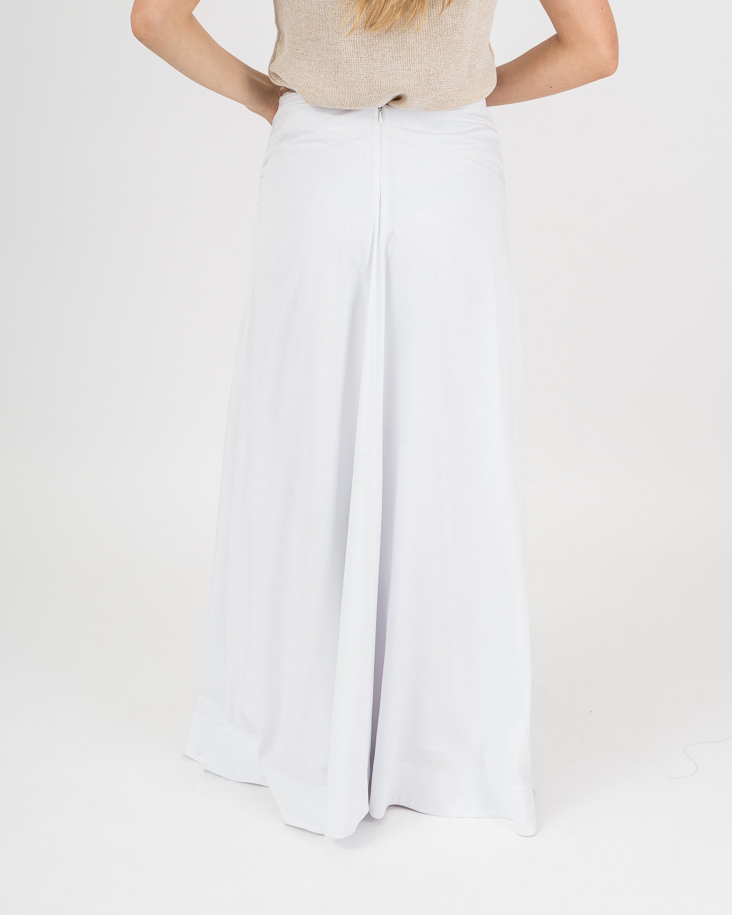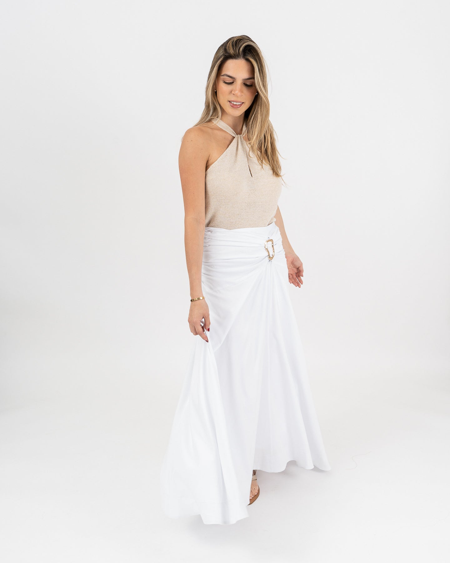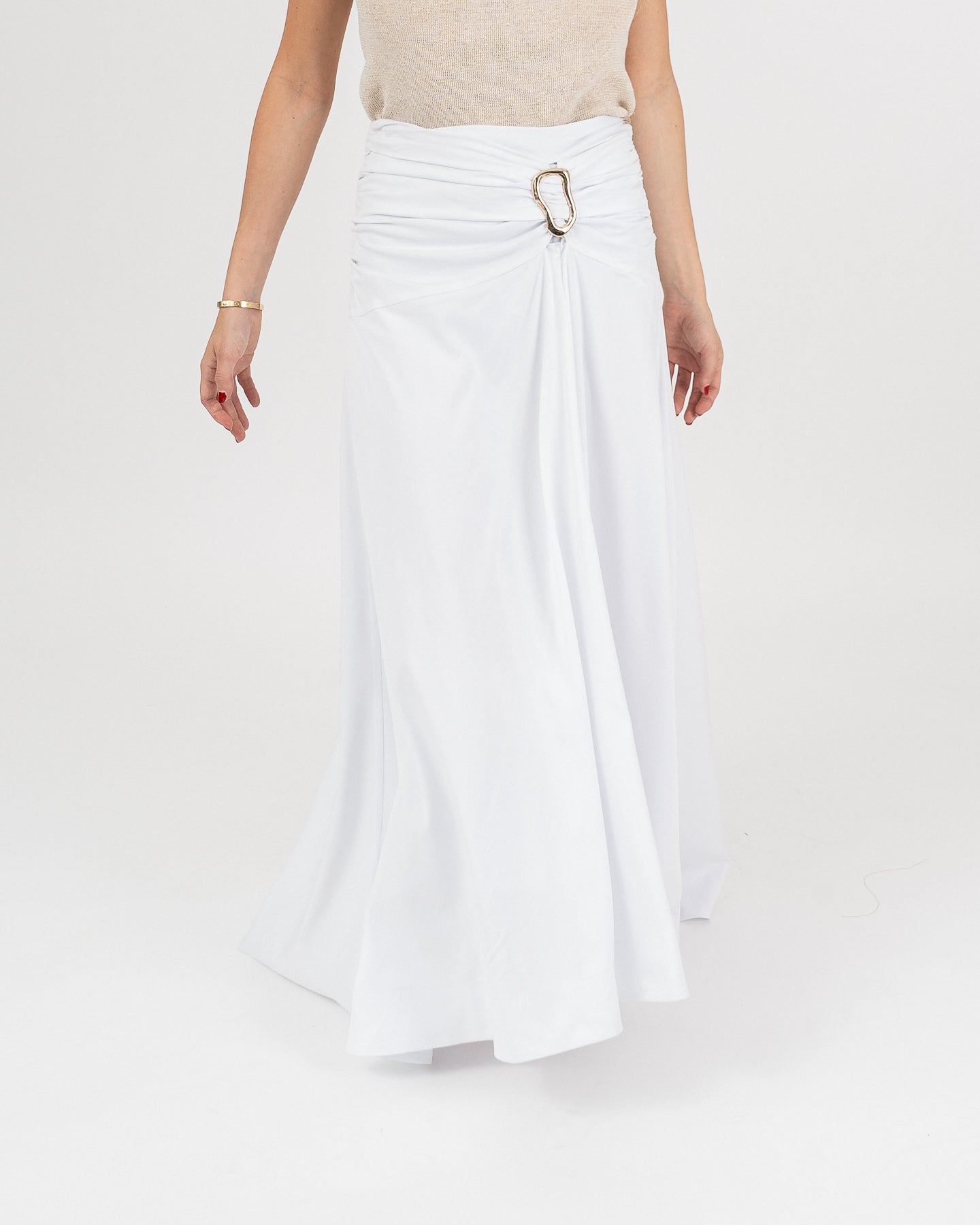 Skirt lined with draping at the hip and decorative buckle, functional invisible closure at the center back.