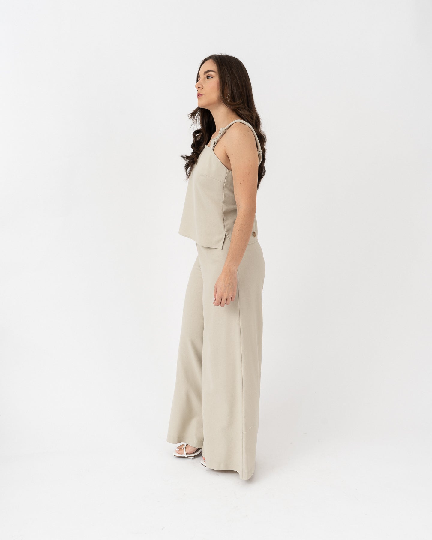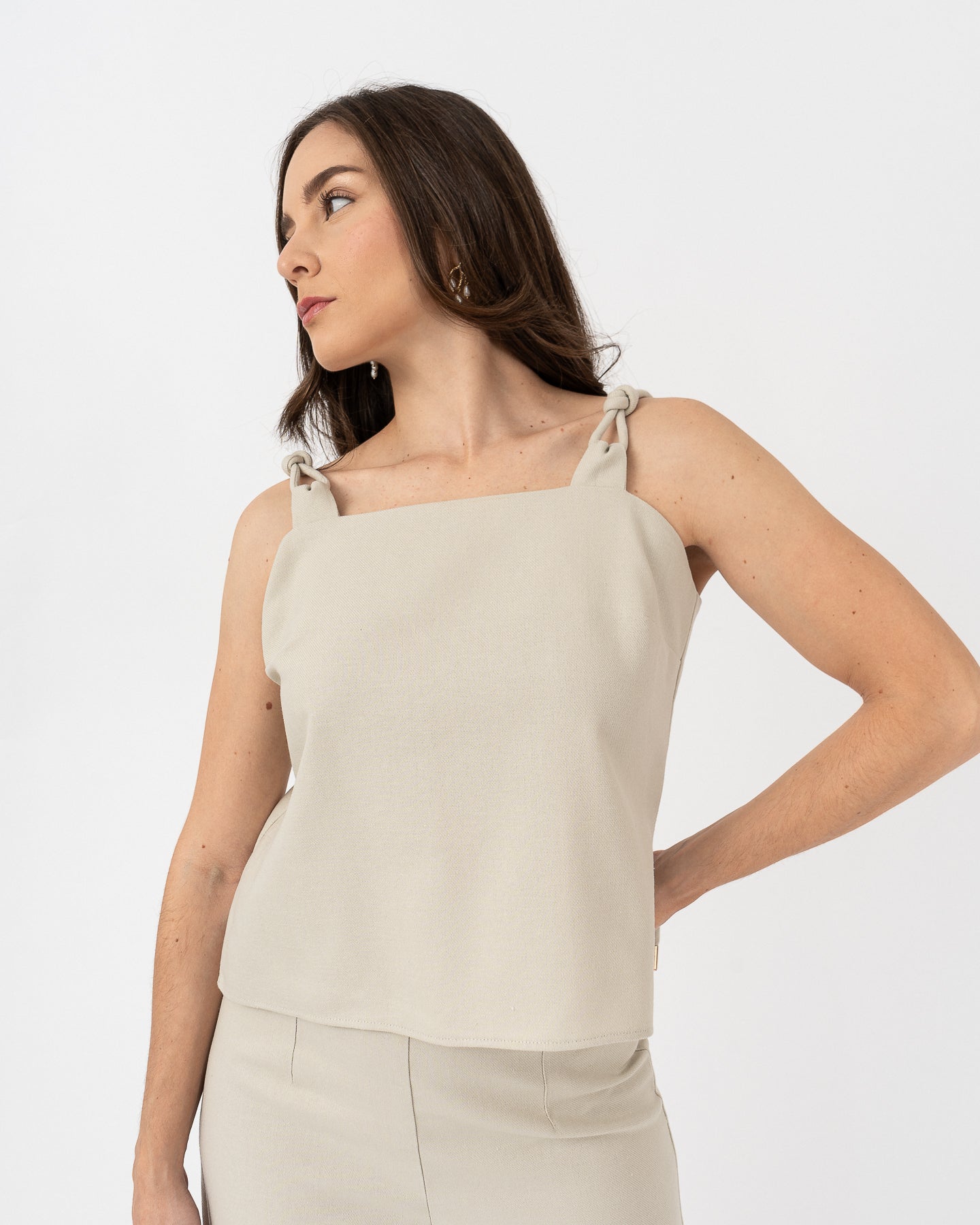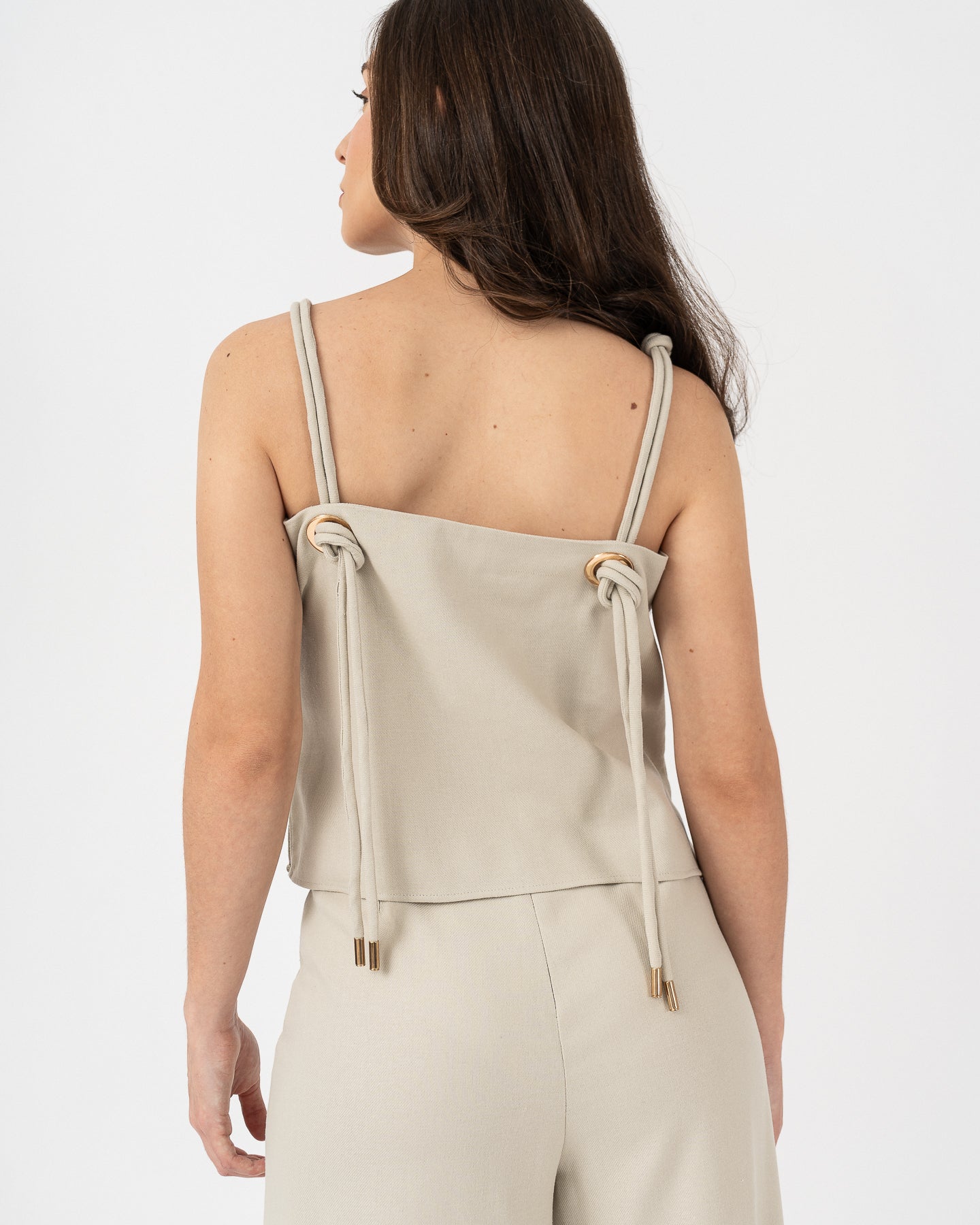 Strappy top with laces made of the same fabric, tied at the front and back with gold eyelets.