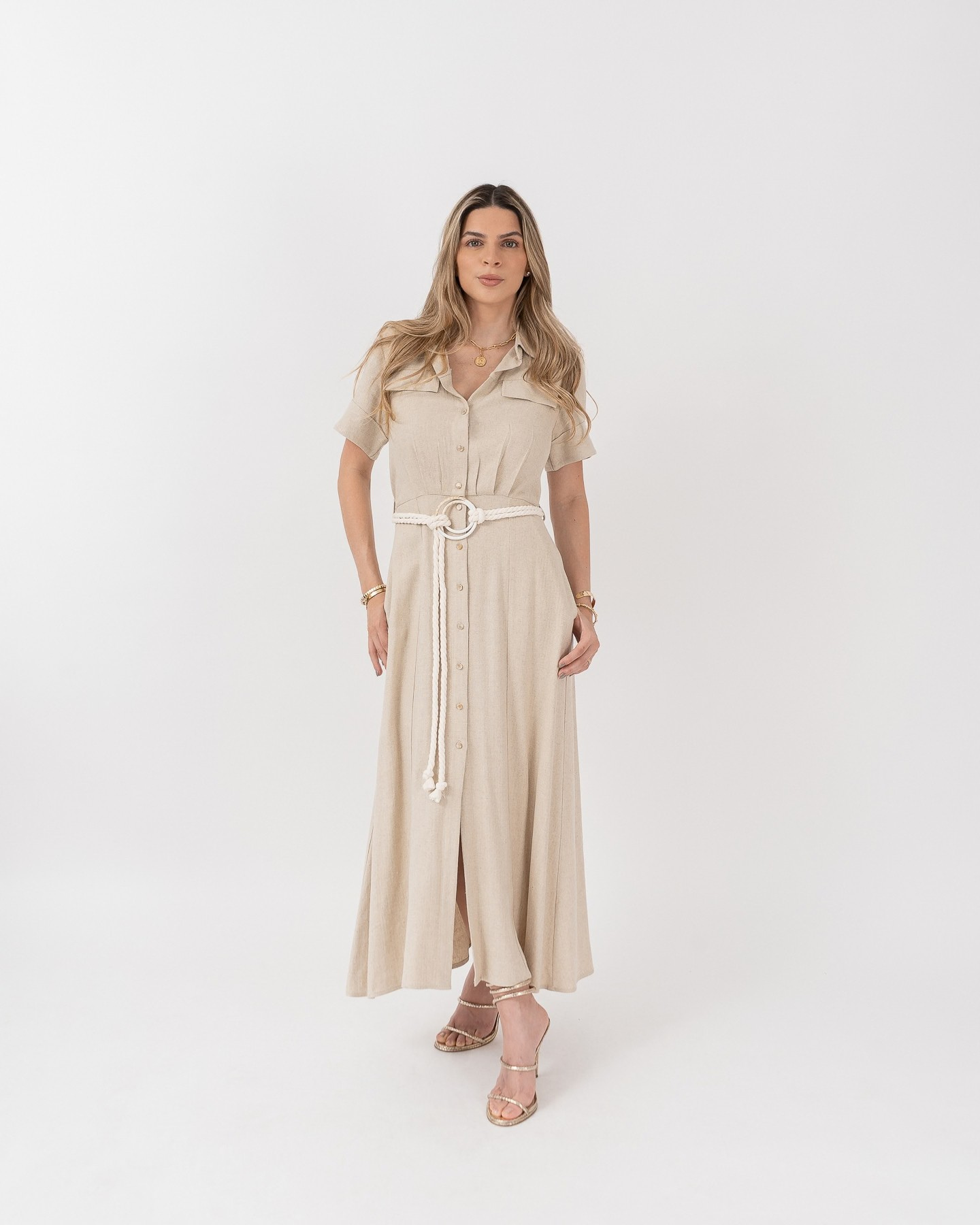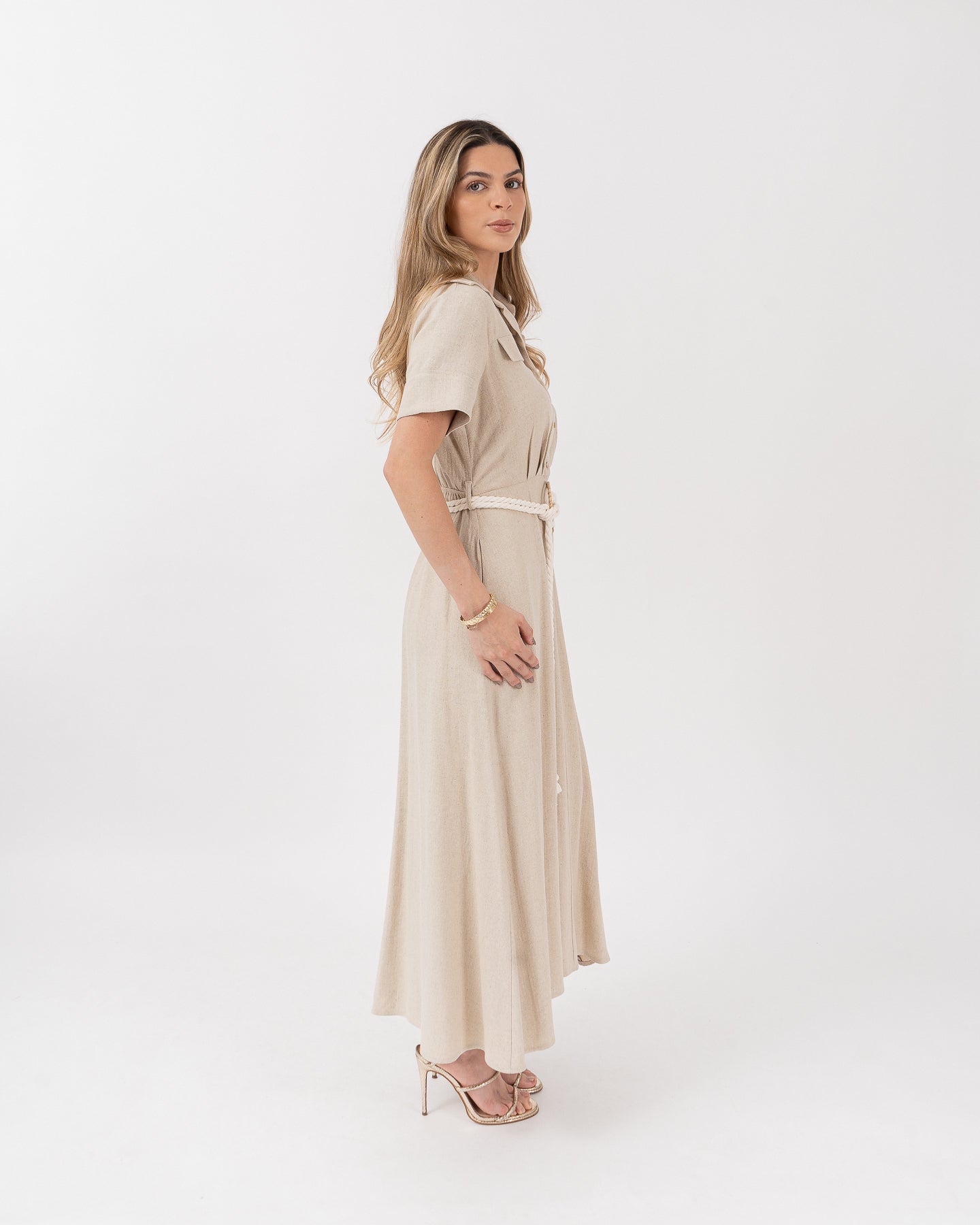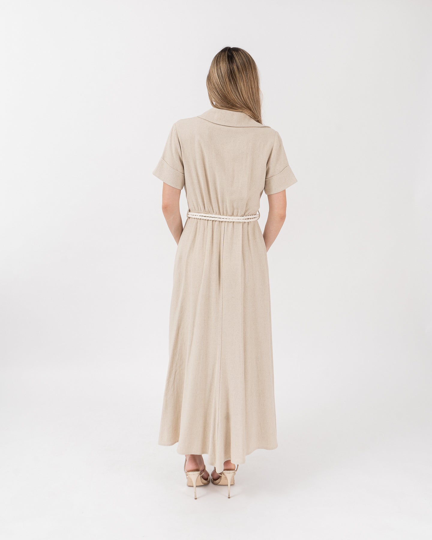 Midi dress with a shirt collar, short sleeves with pleat detail at the waist cut, front closure with placket and buttons, belt with ring and twisted cotton cord.