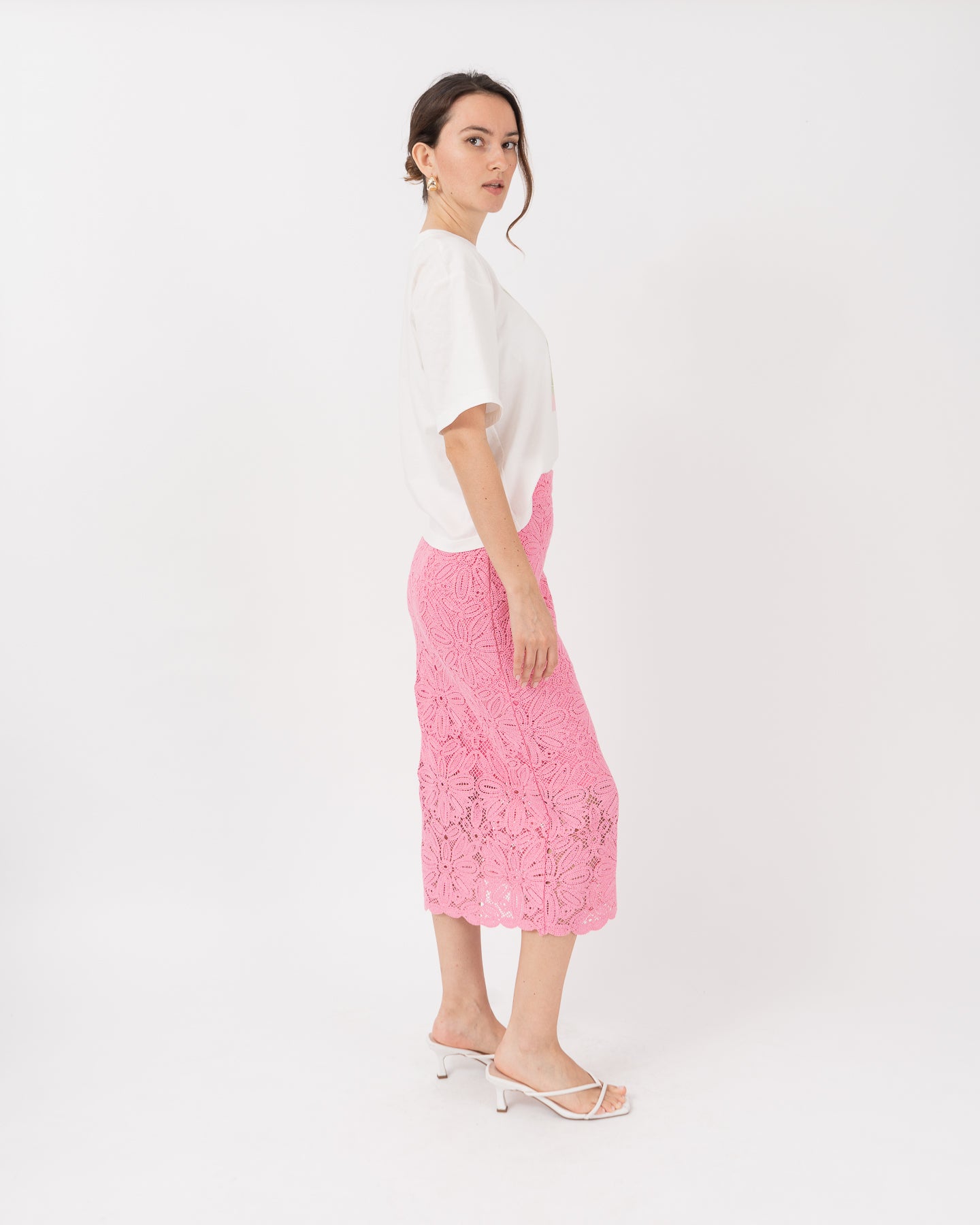Falda forrada con cierre invisible en costado y guarda en contorno de ruedo.