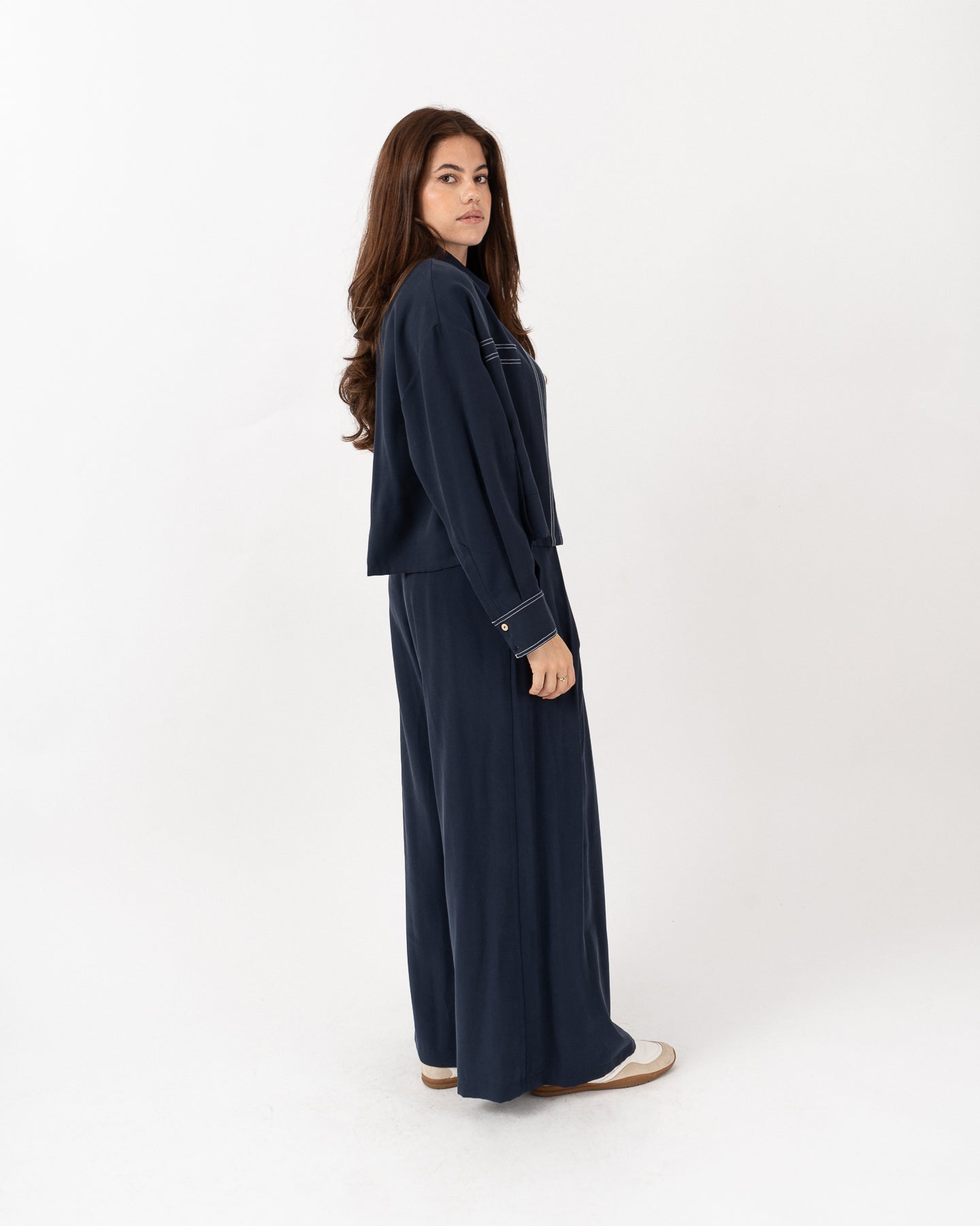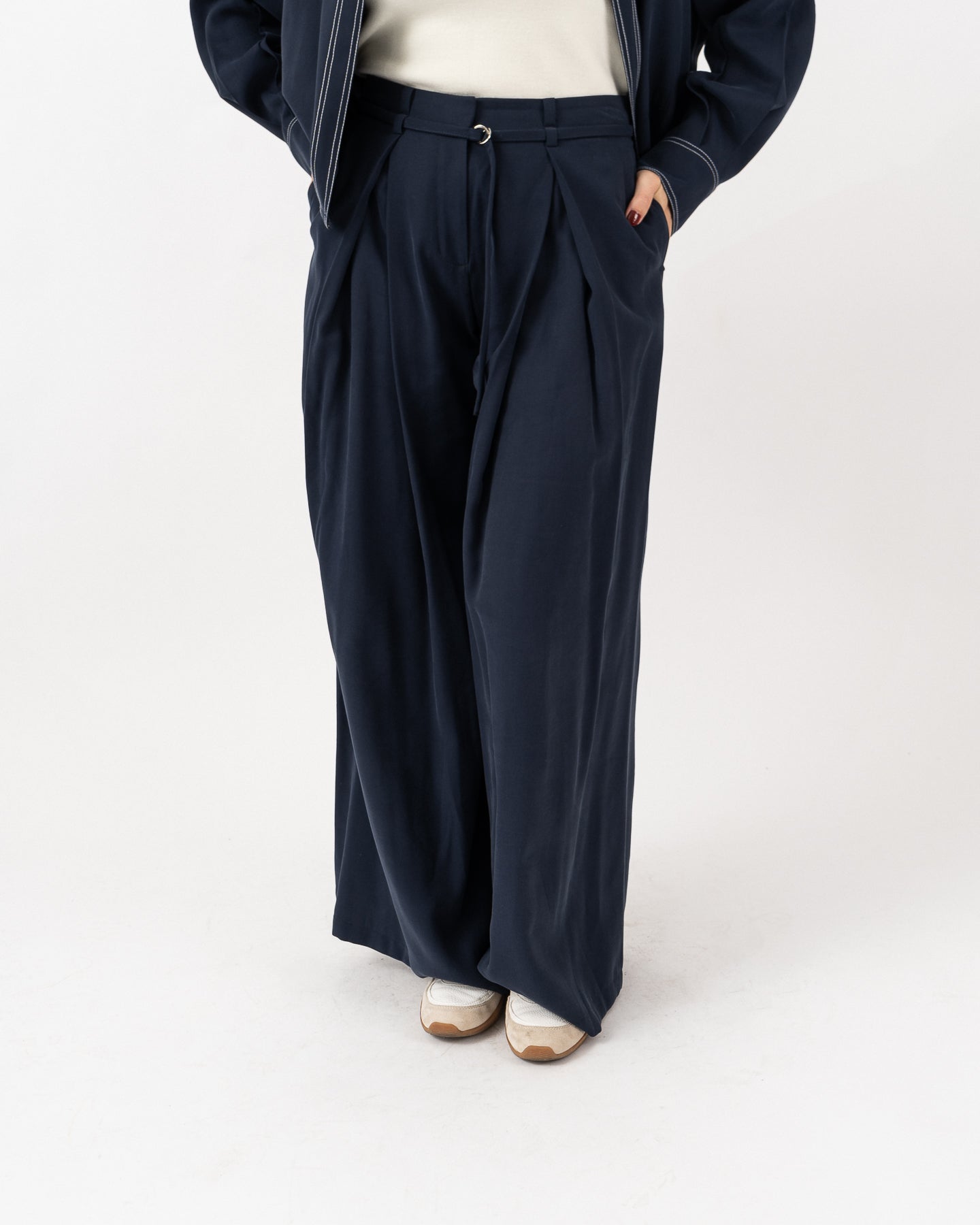 High-waisted trousers with pleats at the front, a functional waistband and fly. A delicate belt in the same fabric.