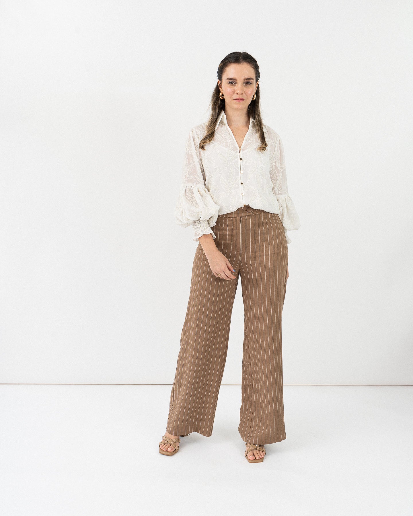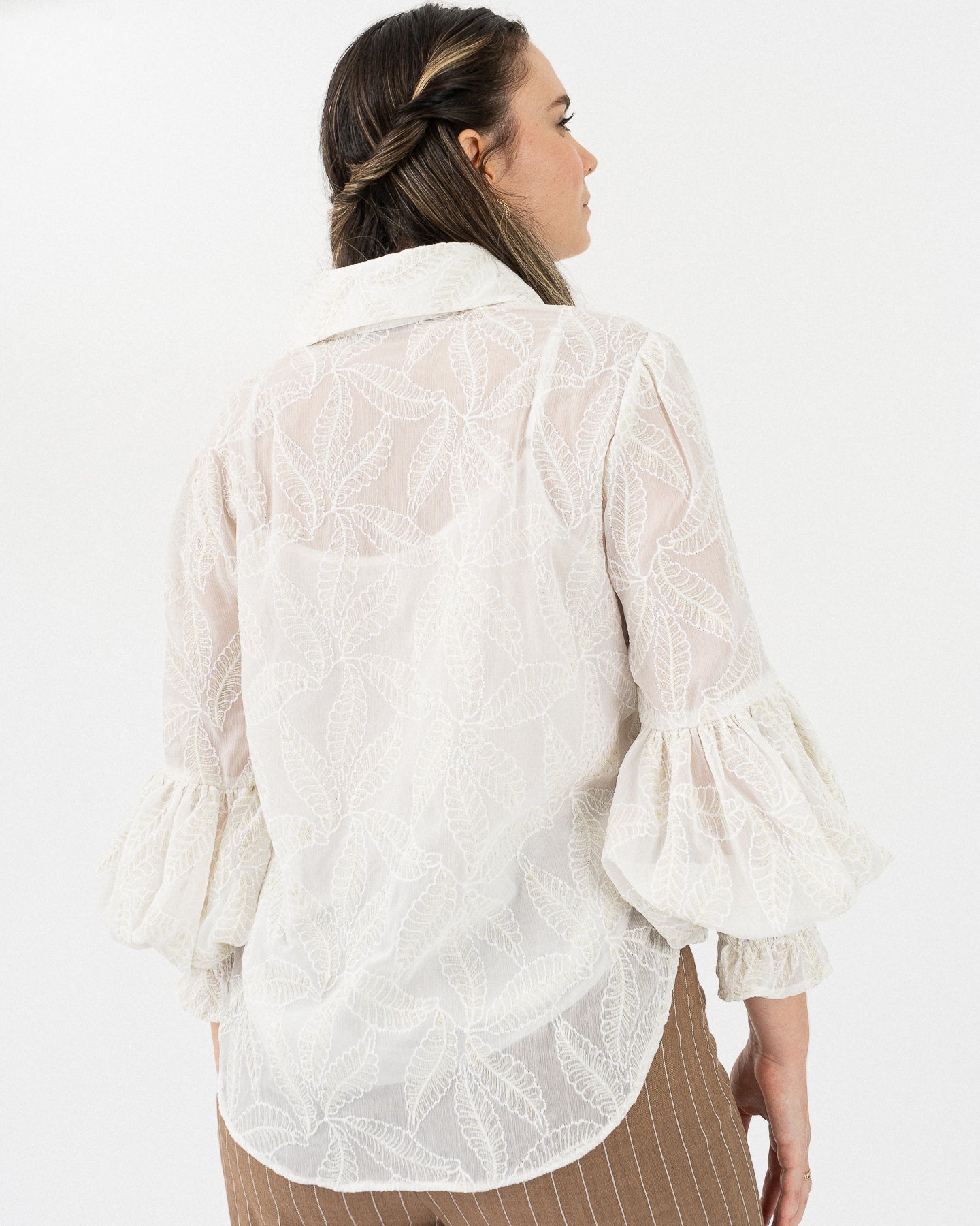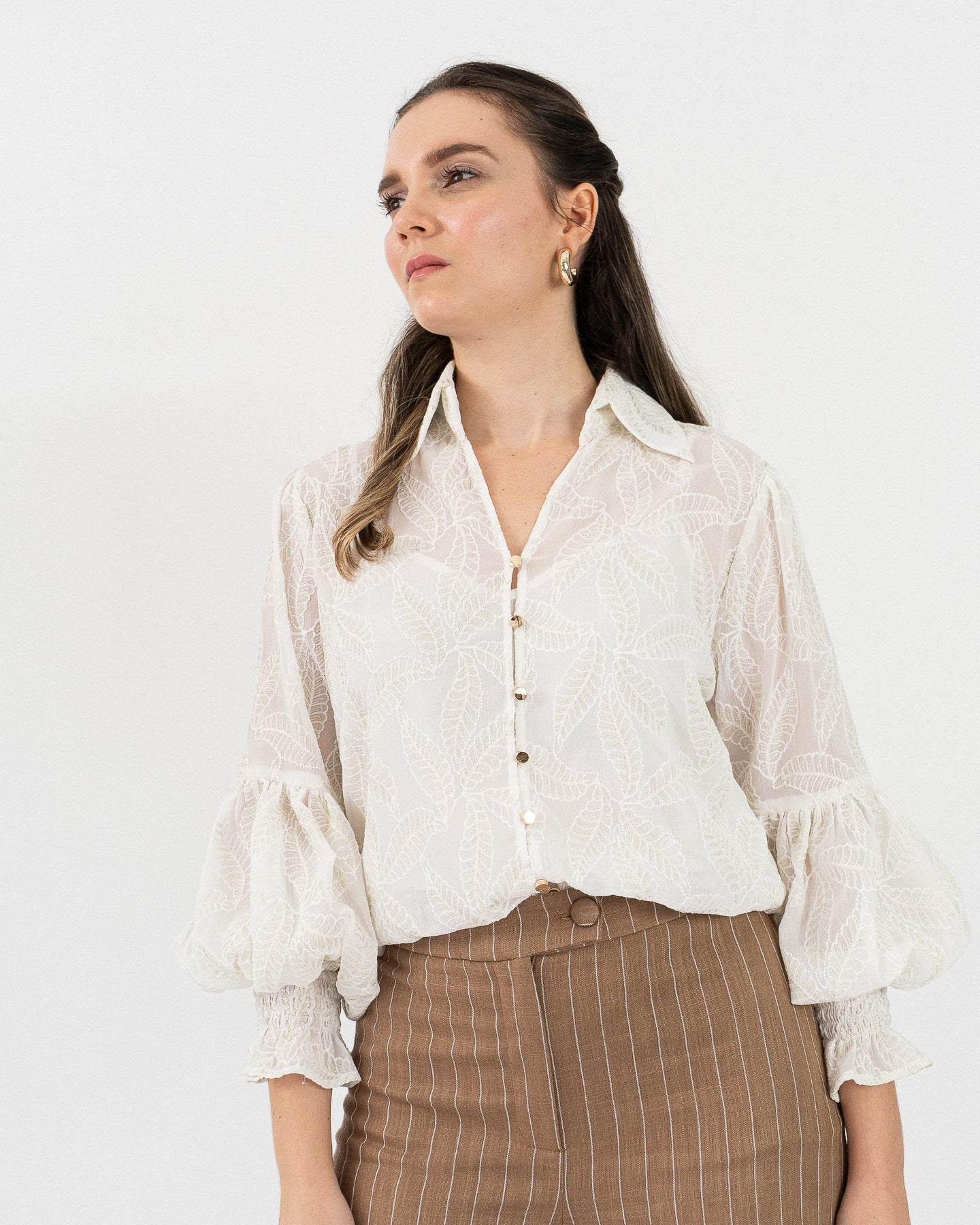 Shirt collar long sleeve blouse with gathers at elbow height and elastic at cuffs forming a ring, front closure with golden buttons