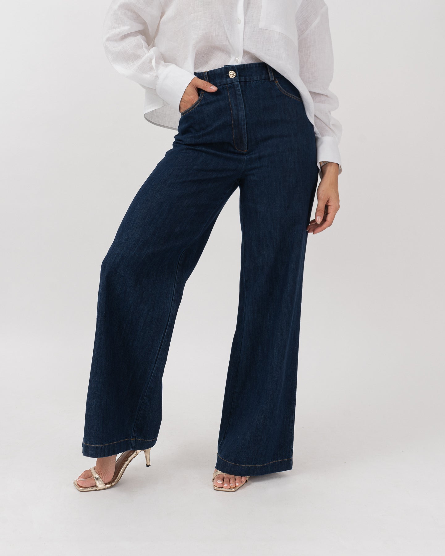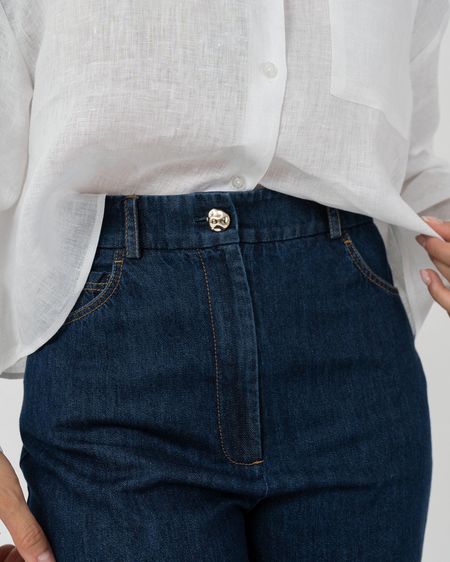 Pantalón de tiro alto en denim liviano con detalle de costuras en contornos.