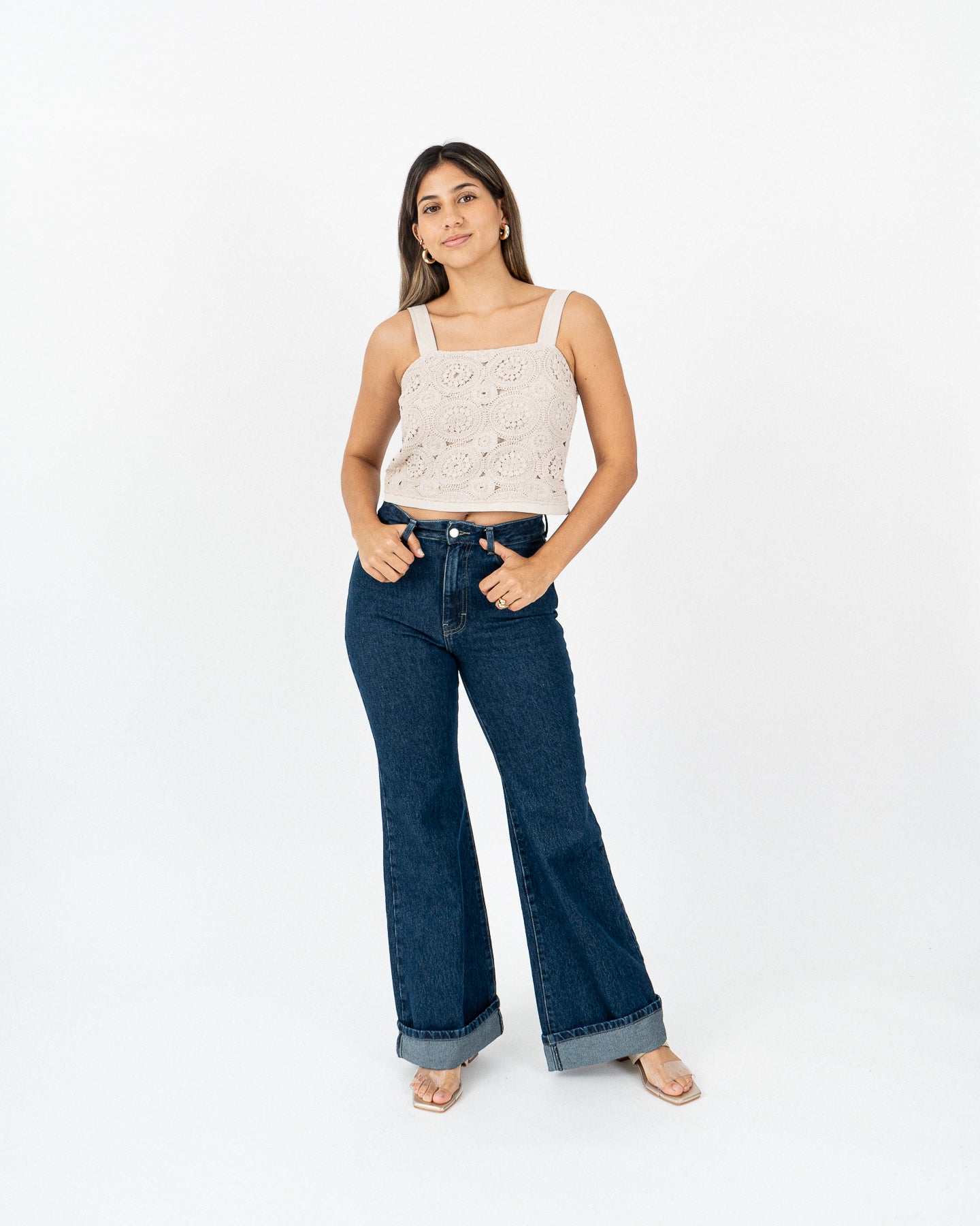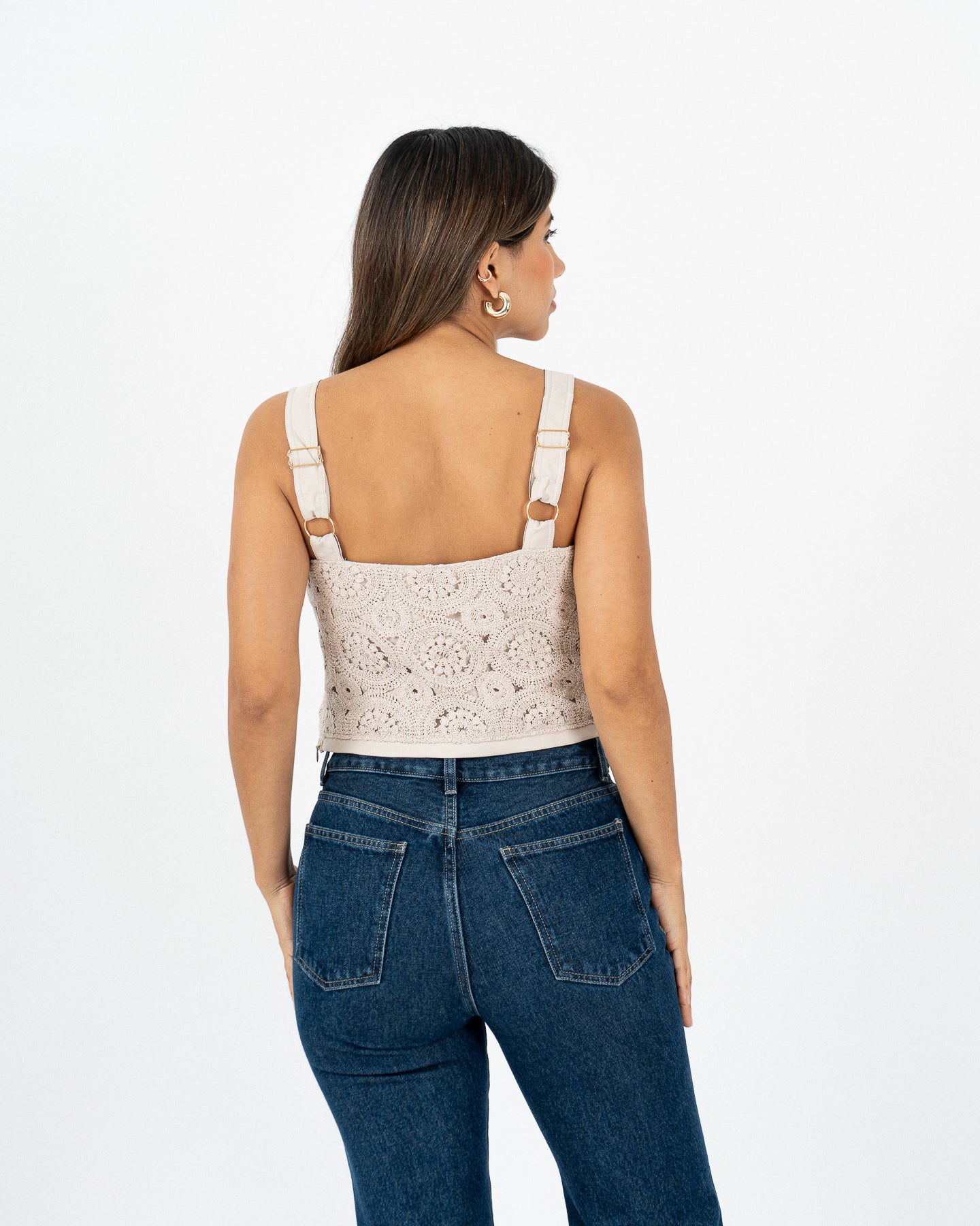 Top lined with straps with golden regulators, invisible closure on the left side.
