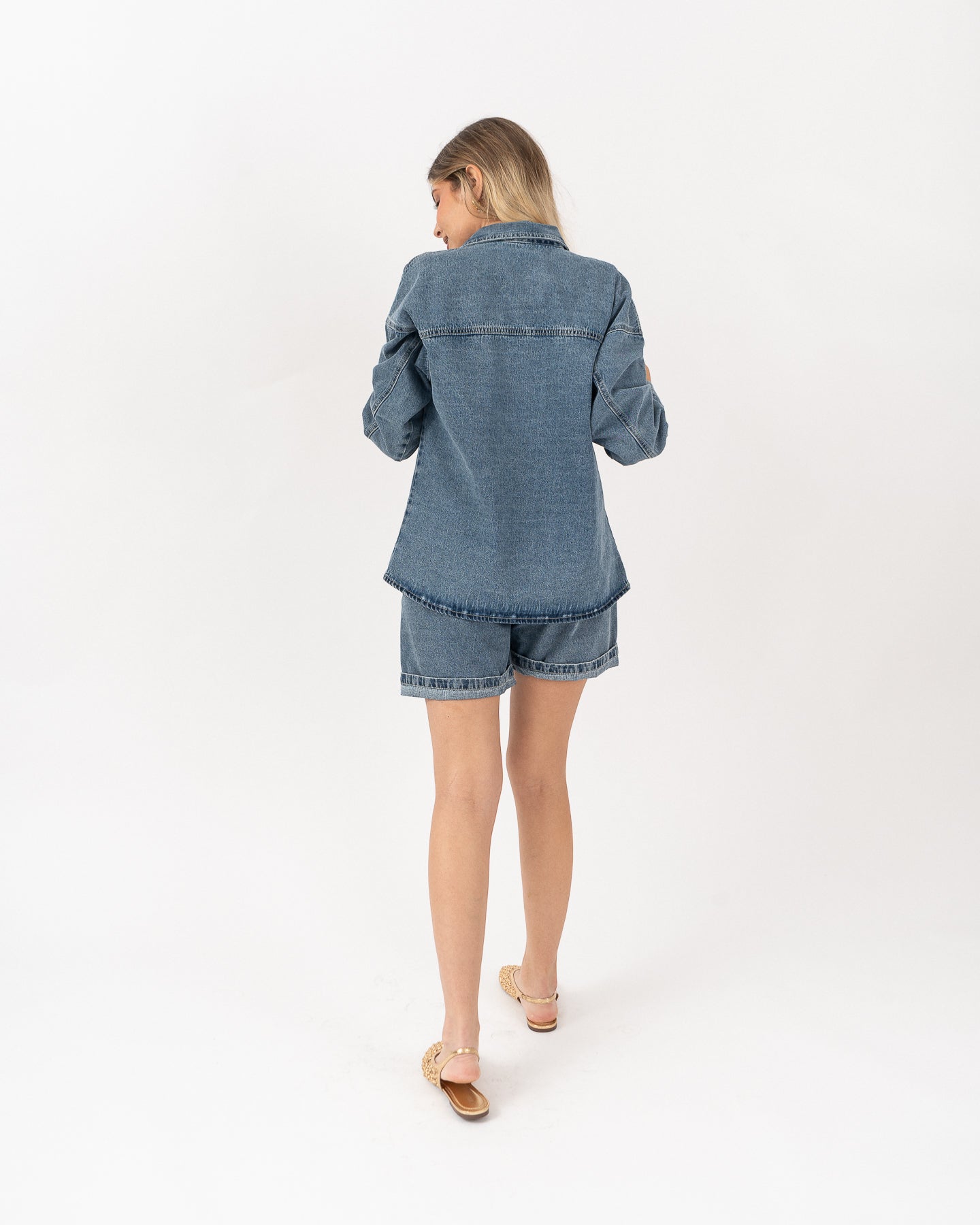High-waisted denim shorts with dust cover.