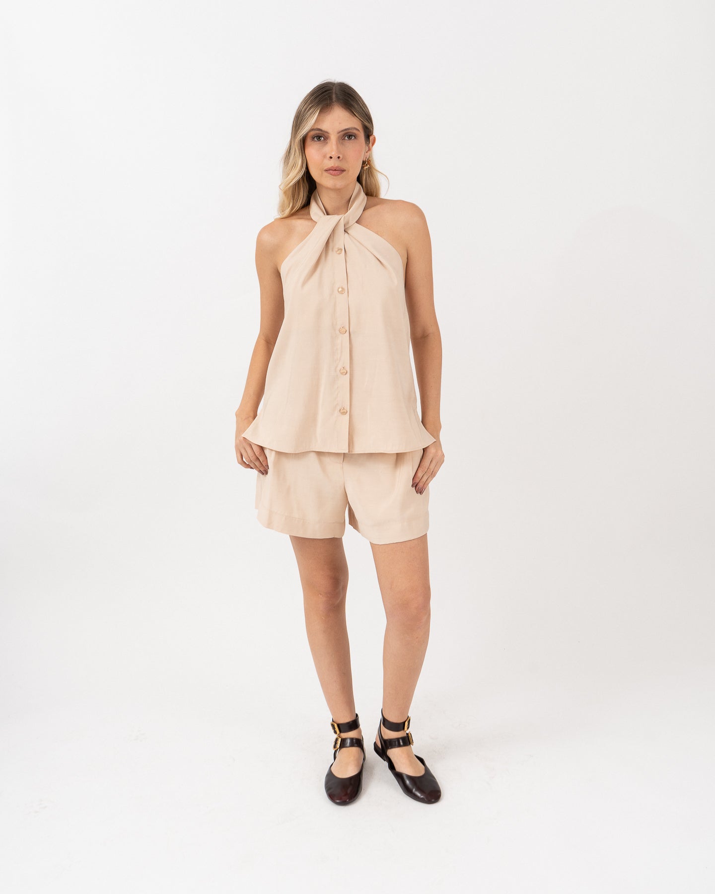 Lined shorts with a functional waistband and fly, front pleats, and side pockets.