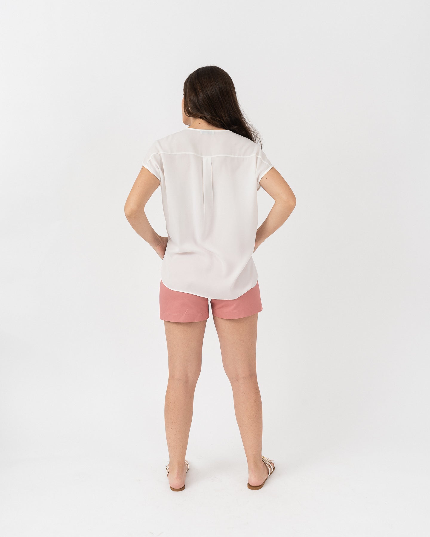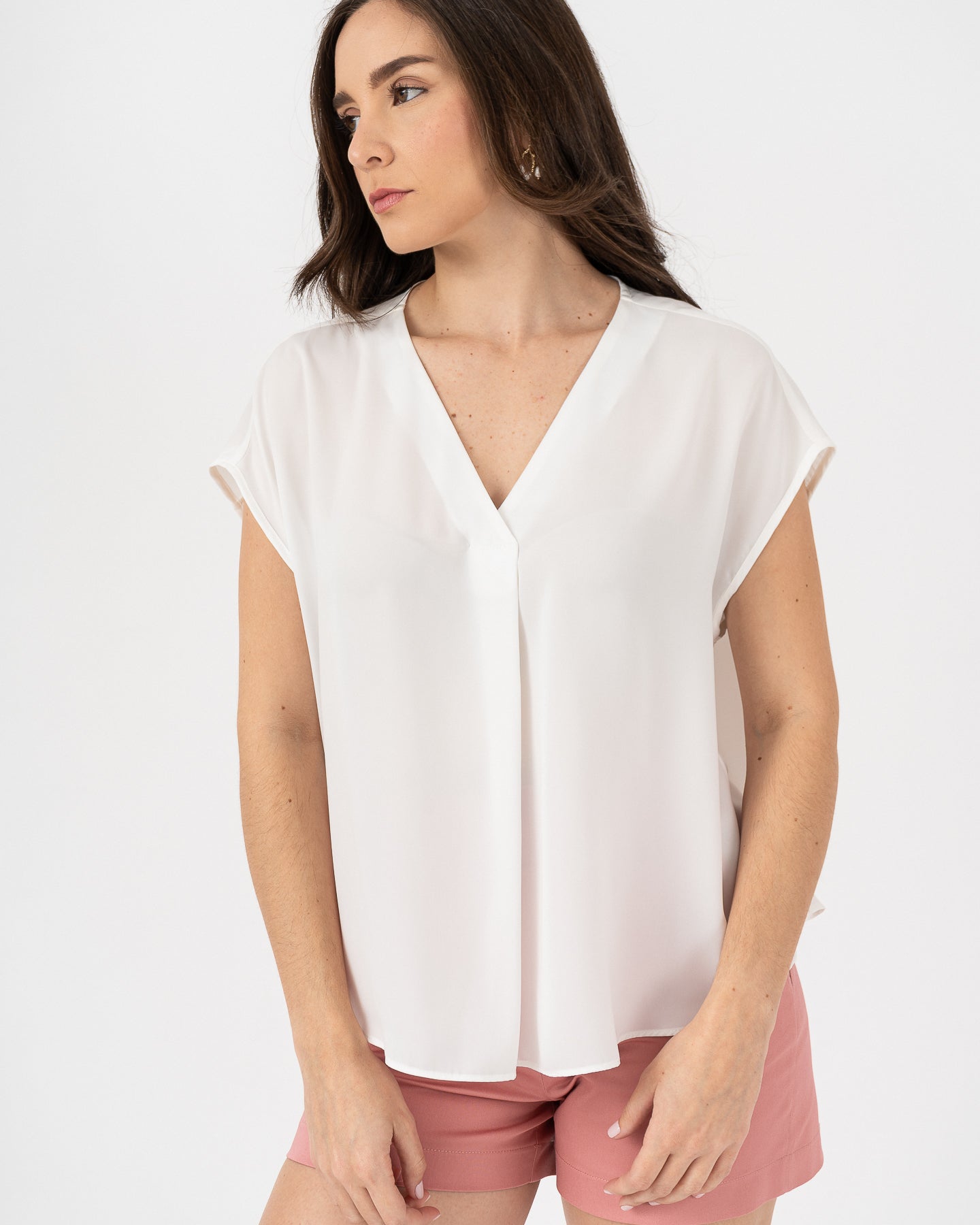 Kimono sleeve blouse with a V-neckline and a pleat at the center front and slits on the sides.