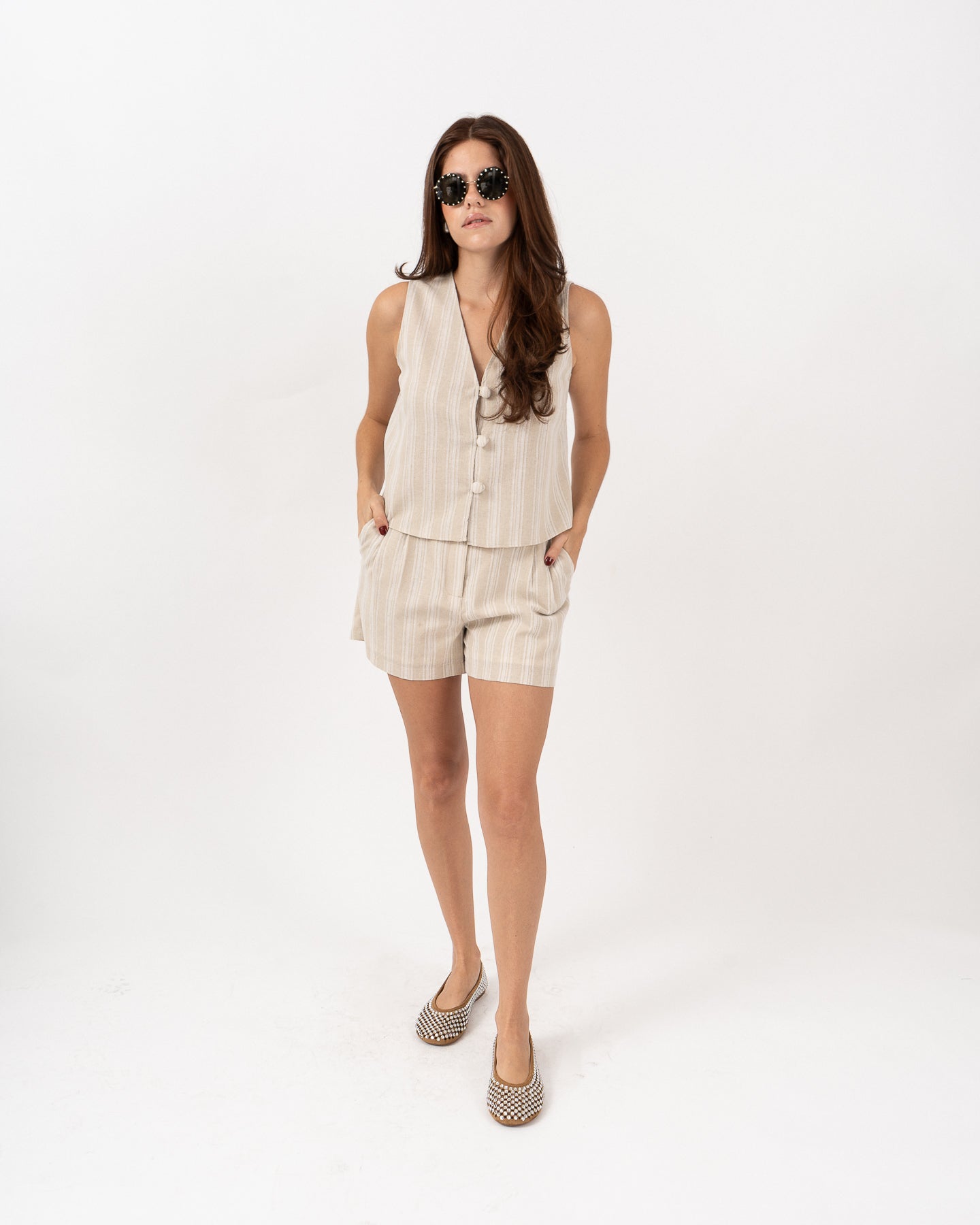V-neck sleeveless blouse with gingham and functional covered buttons.