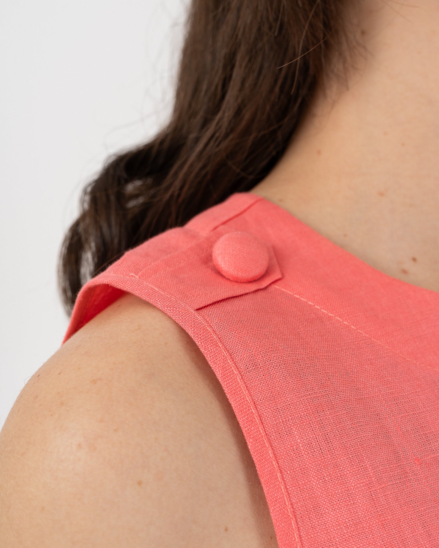 Round-neck sleeveless blouse with epaulettes decorated with covered buttons. Back neckline with slit and functional button.