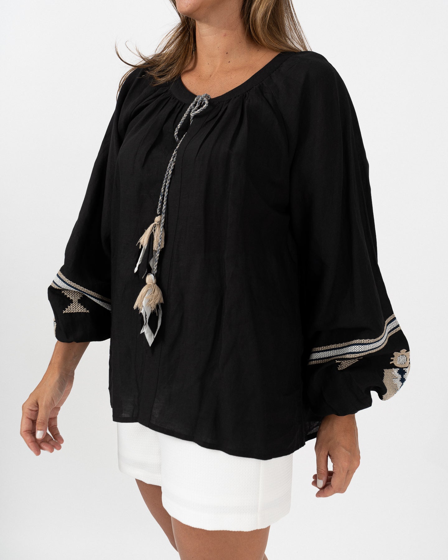 Black blouse, long sleeves with sleeve detail, neck with adjustable strap