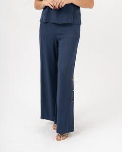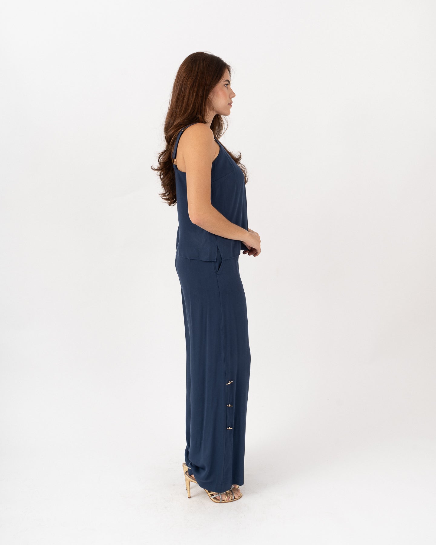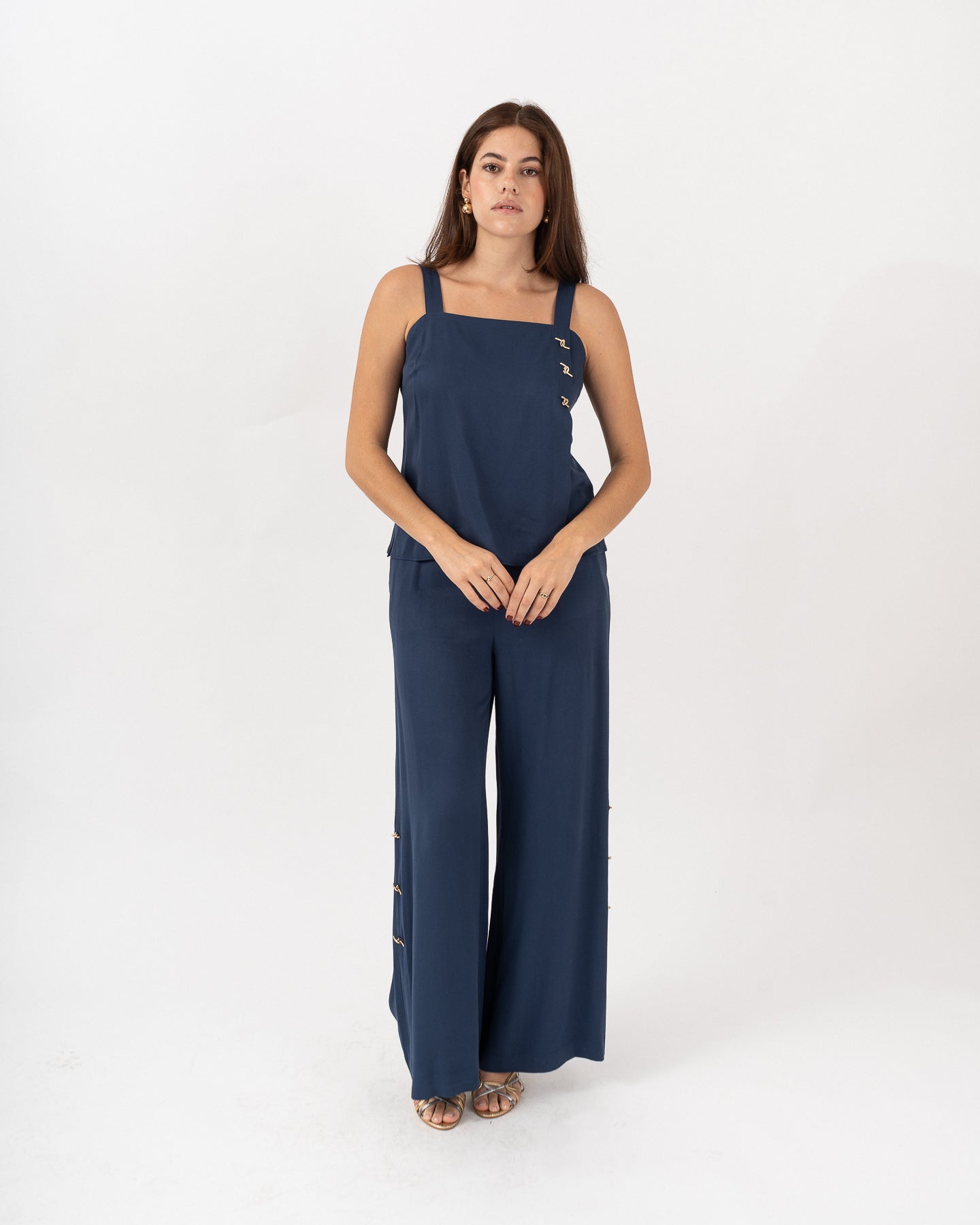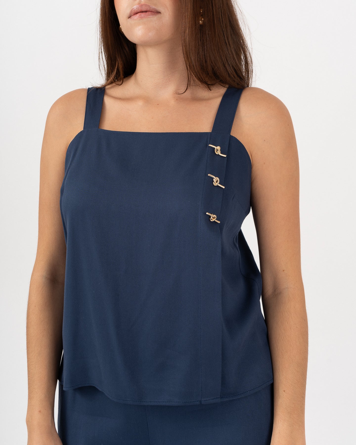 Strappy top with gold adjusters, a front panel with decorative buttons, and slits on the sides.