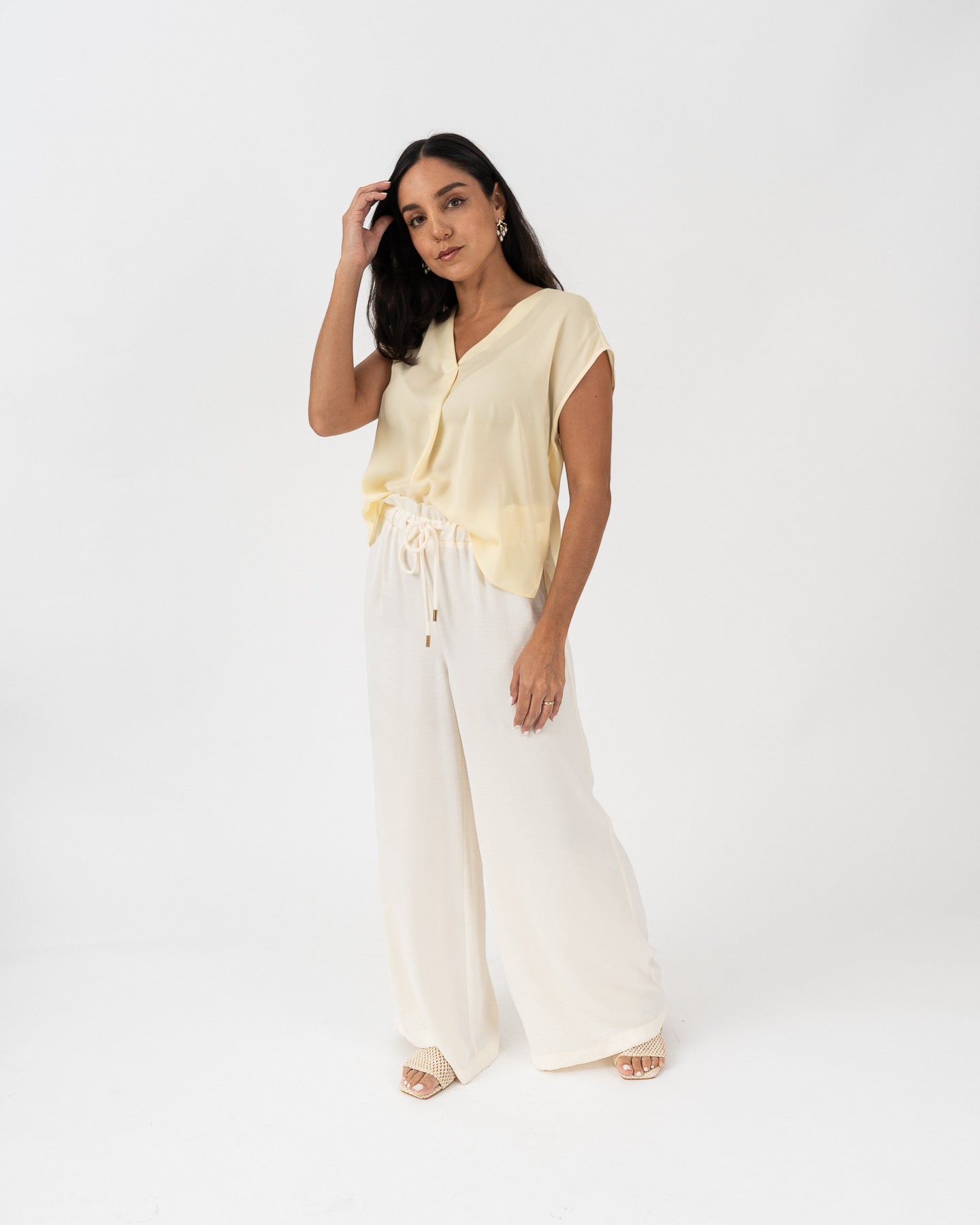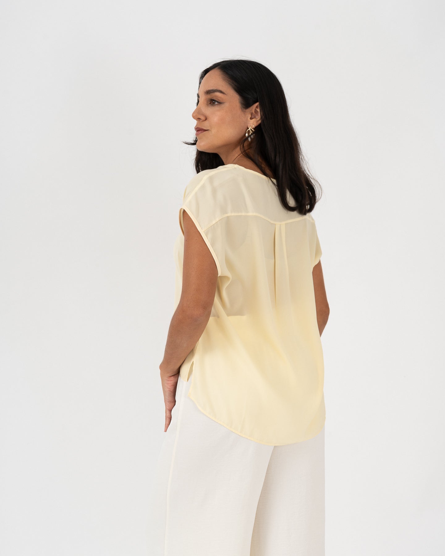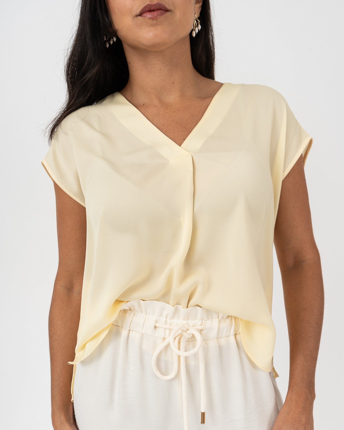 Kimono sleeve blouse with a V-neckline and a pleat at the center front and slits on the sides.