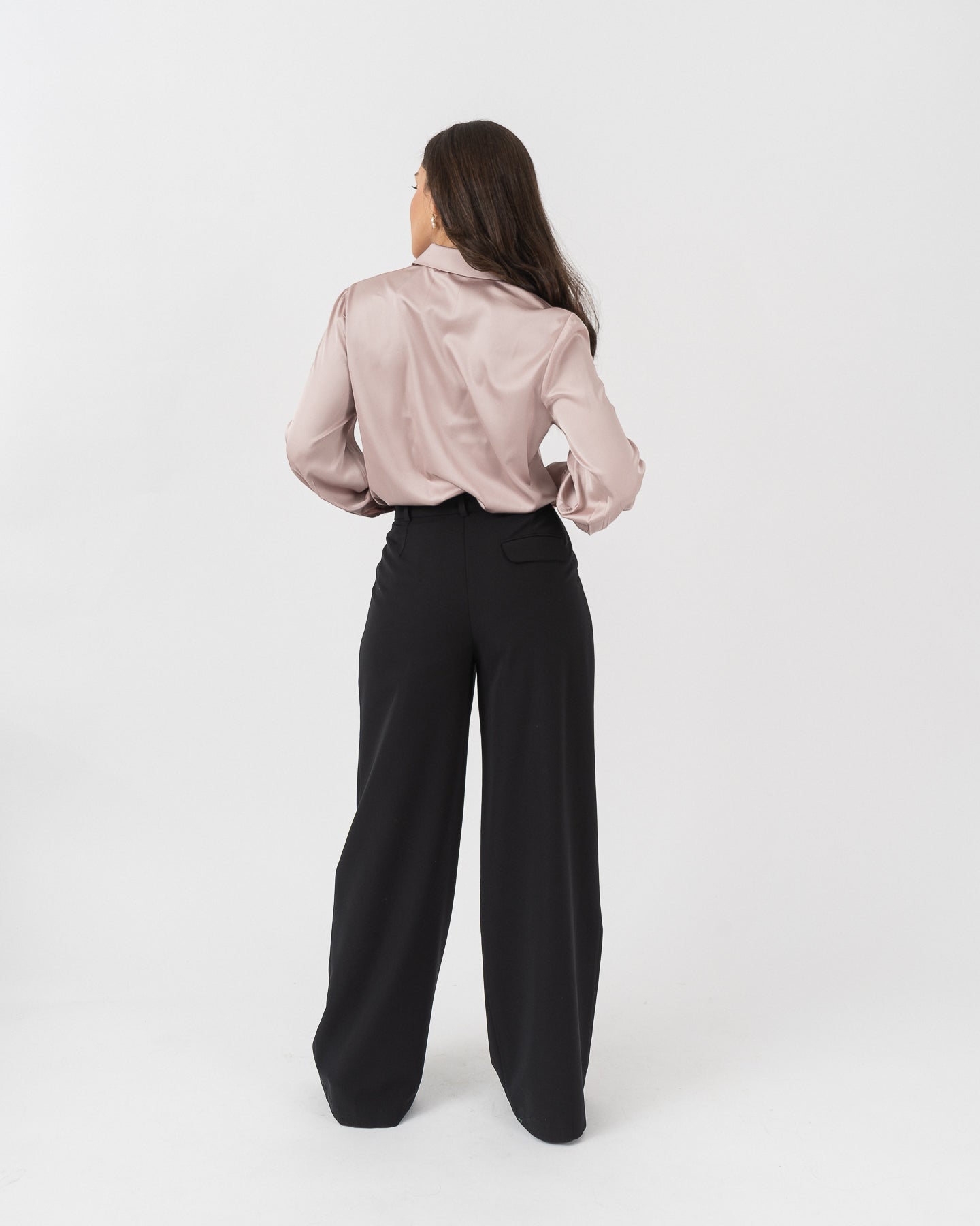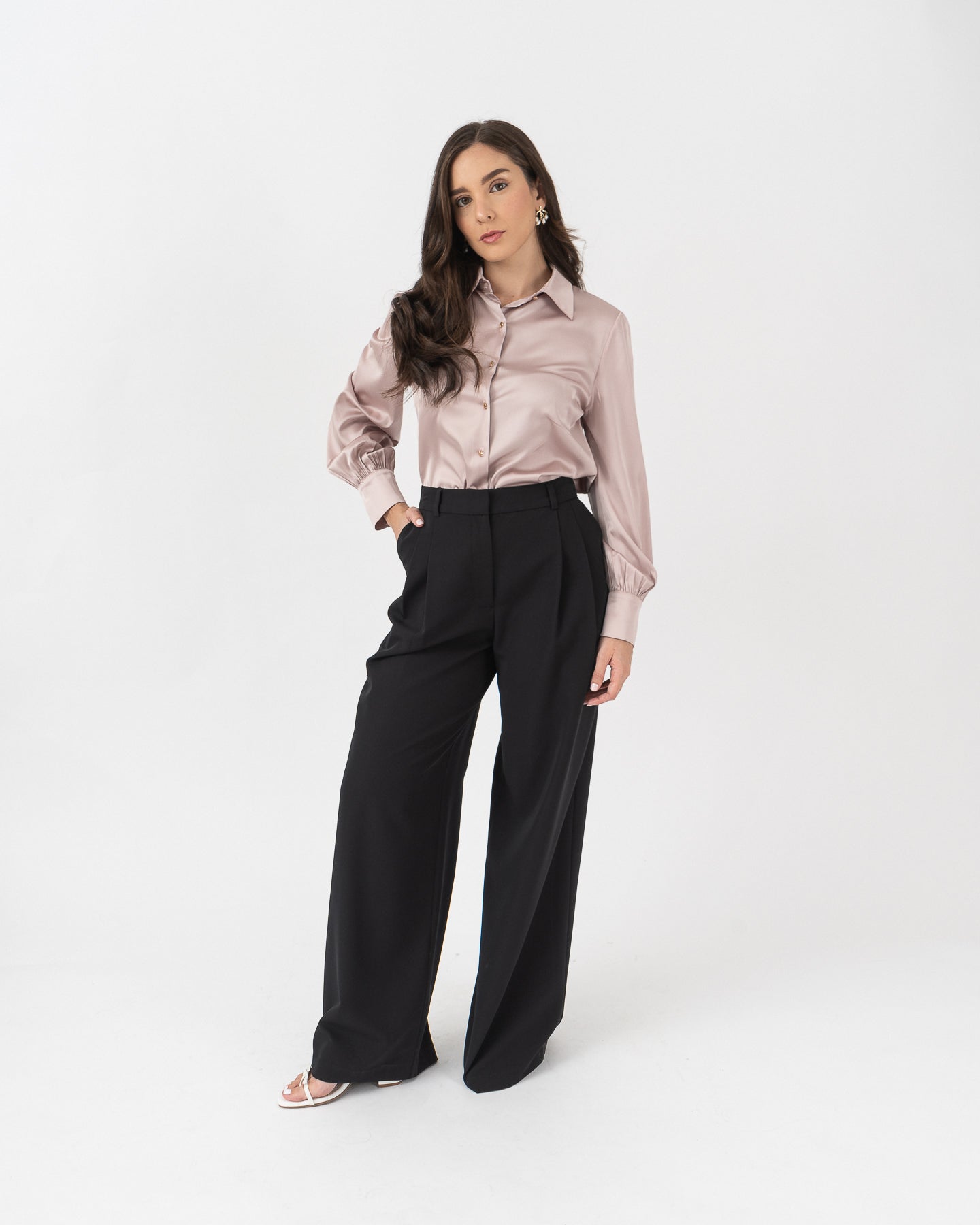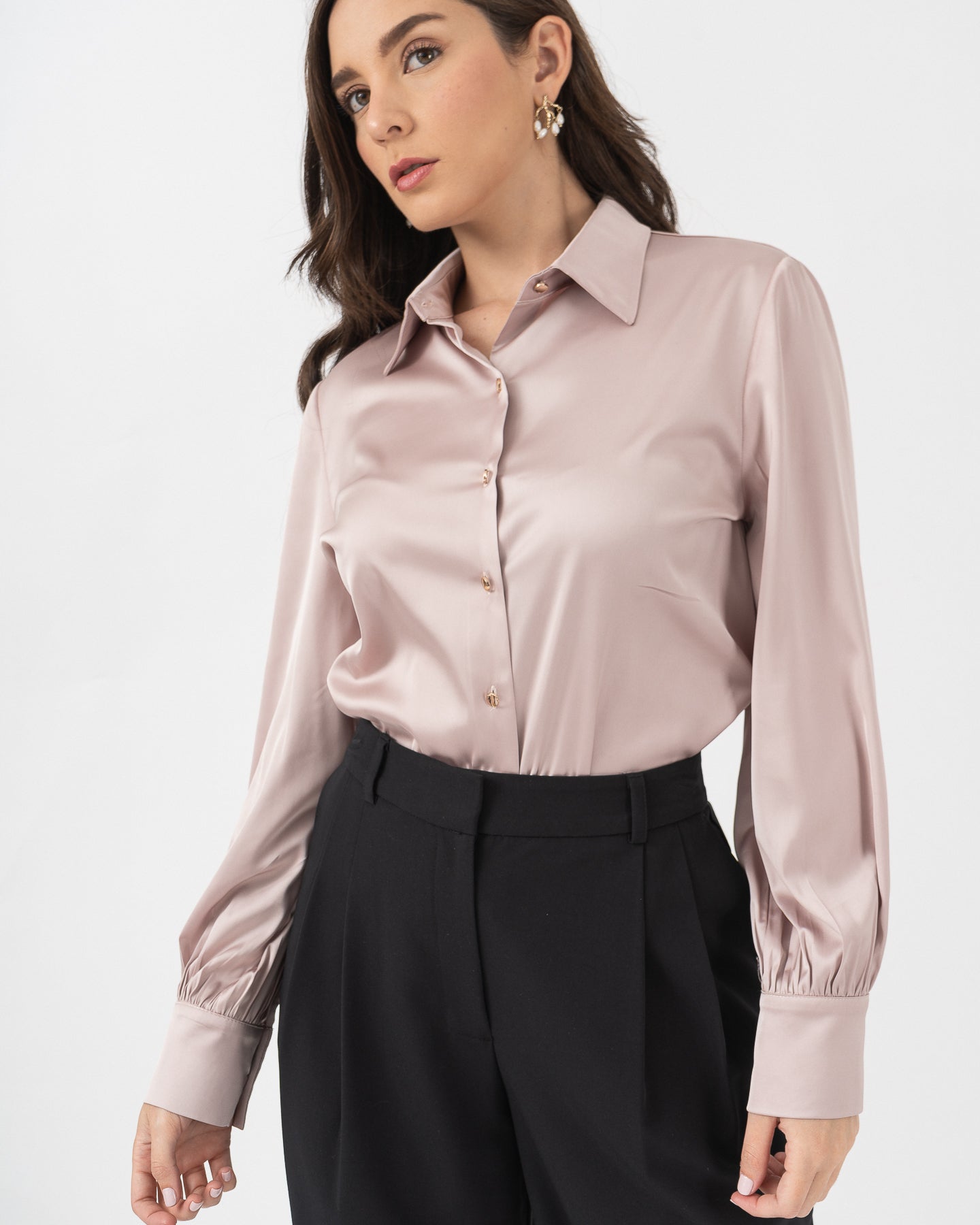 Long-sleeved shirt-collar blouse with functional cuffs. Gold button closure at the front.