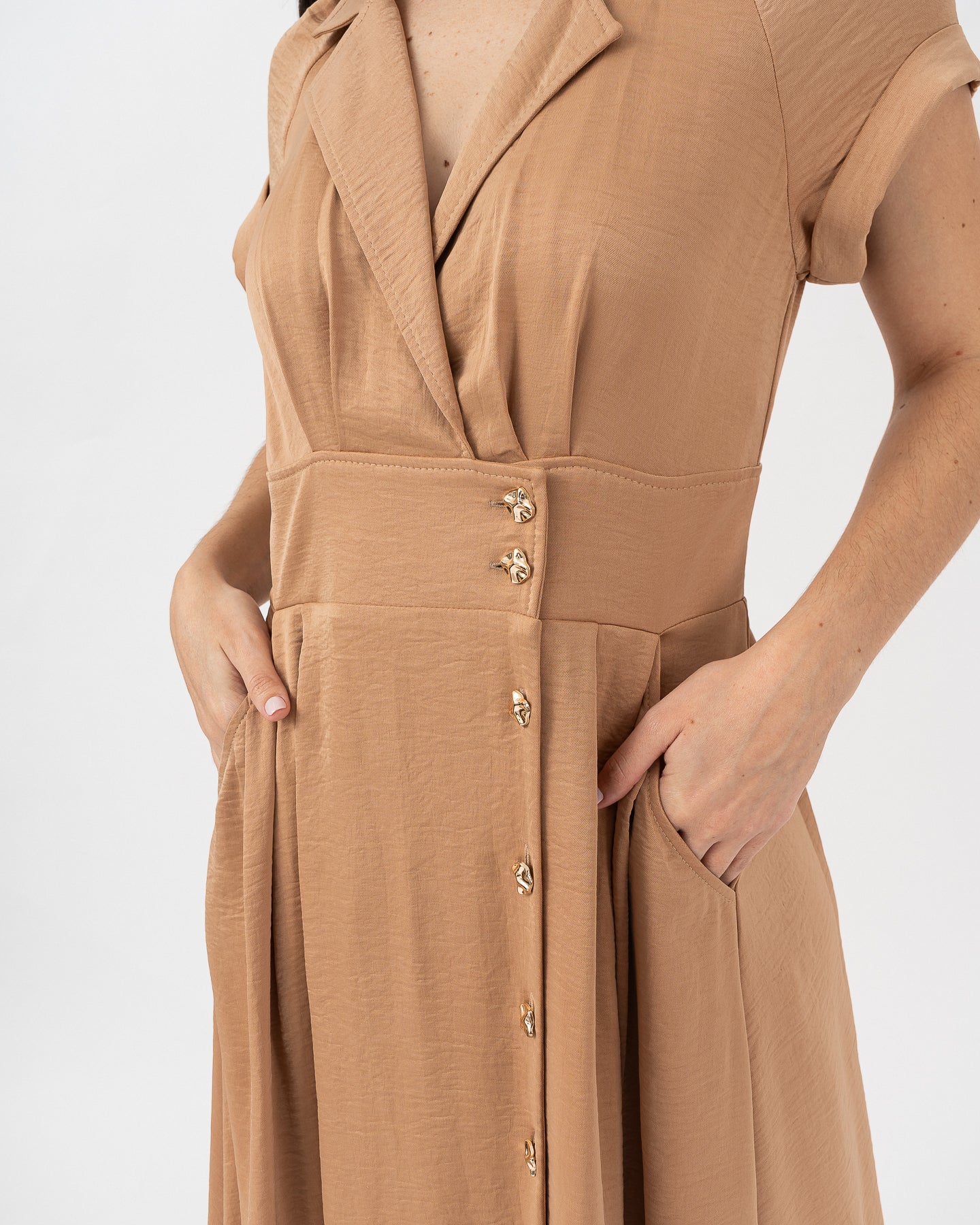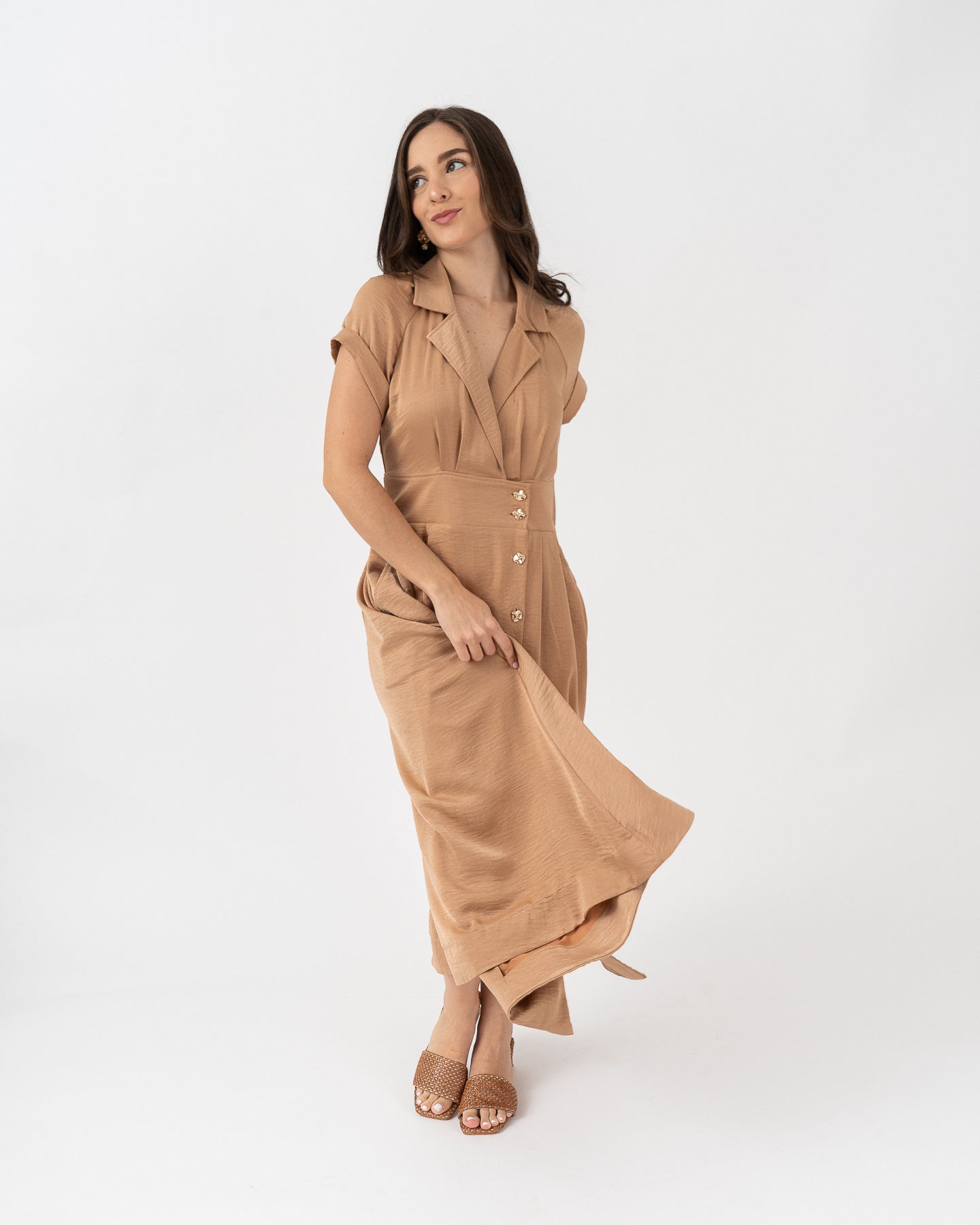 Asymmetrical dress with a lapel collar and raglan sleeves, functional gold buttons on the front crossover, and functional side pockets with contoured pleats.