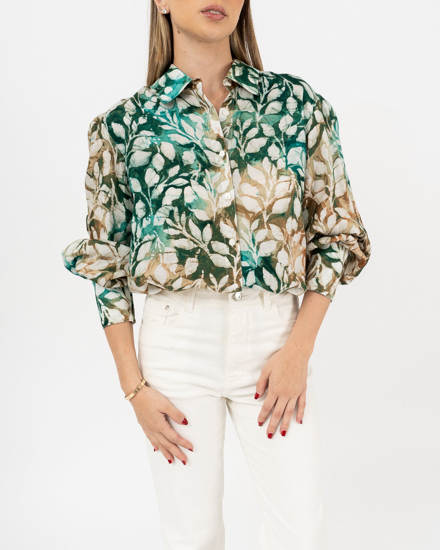 Long - sleeved blouse with volume , leaf print in green , brown and beige tones , with a shirt collar .