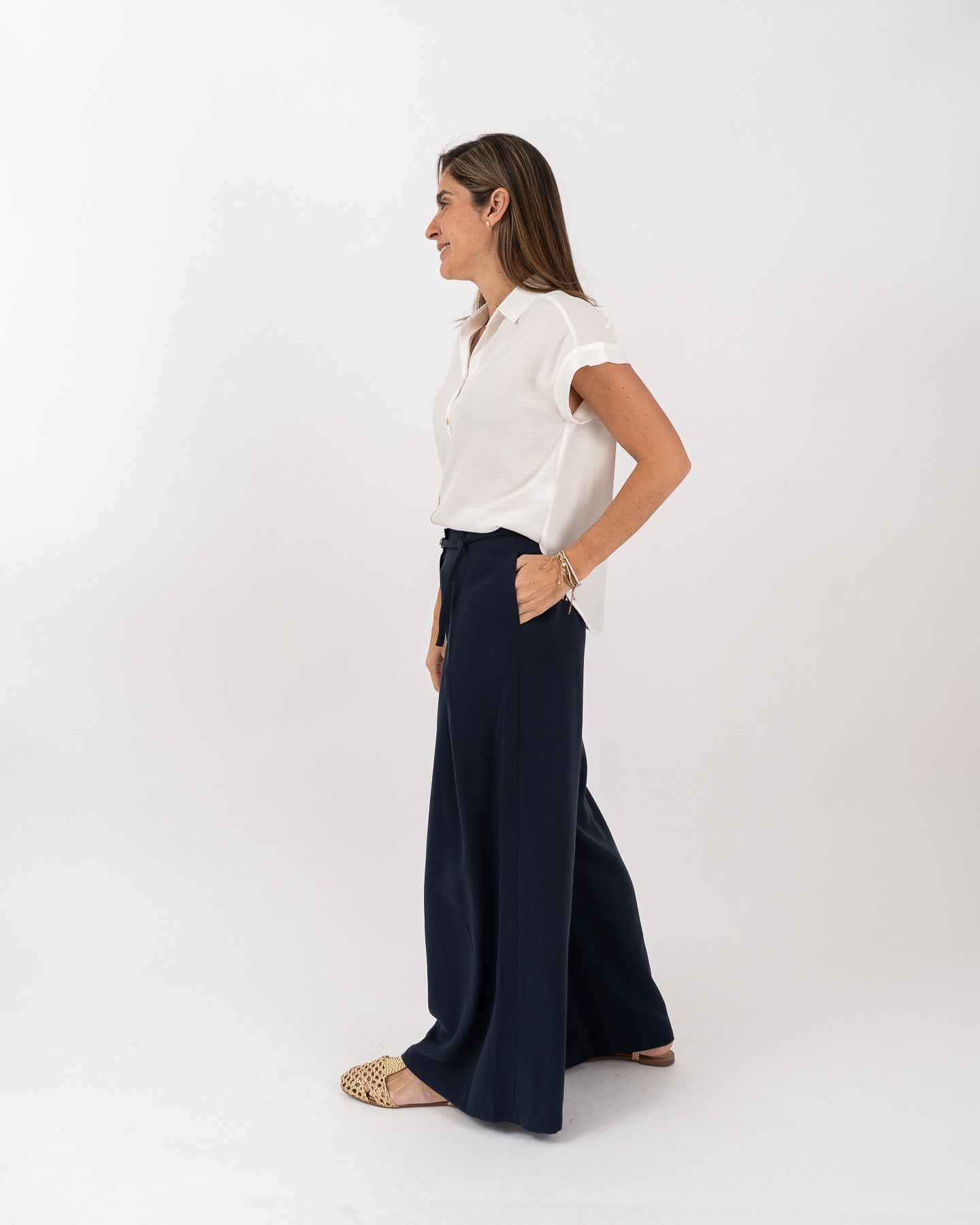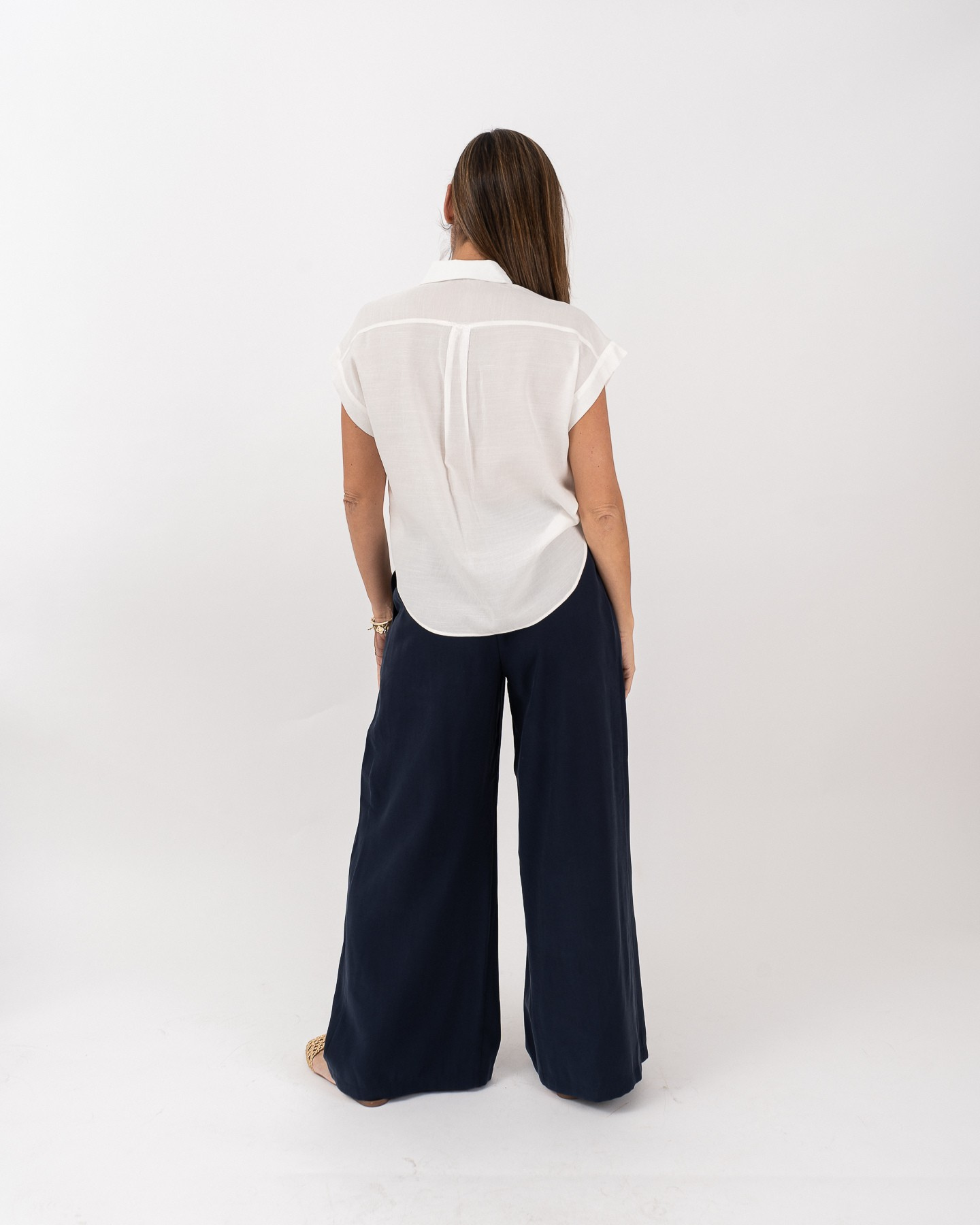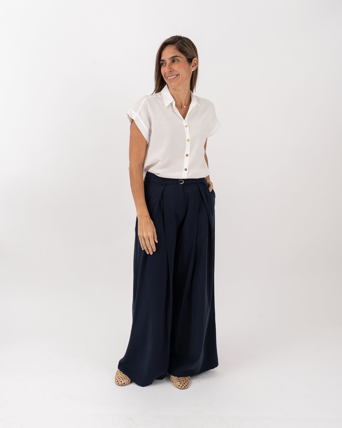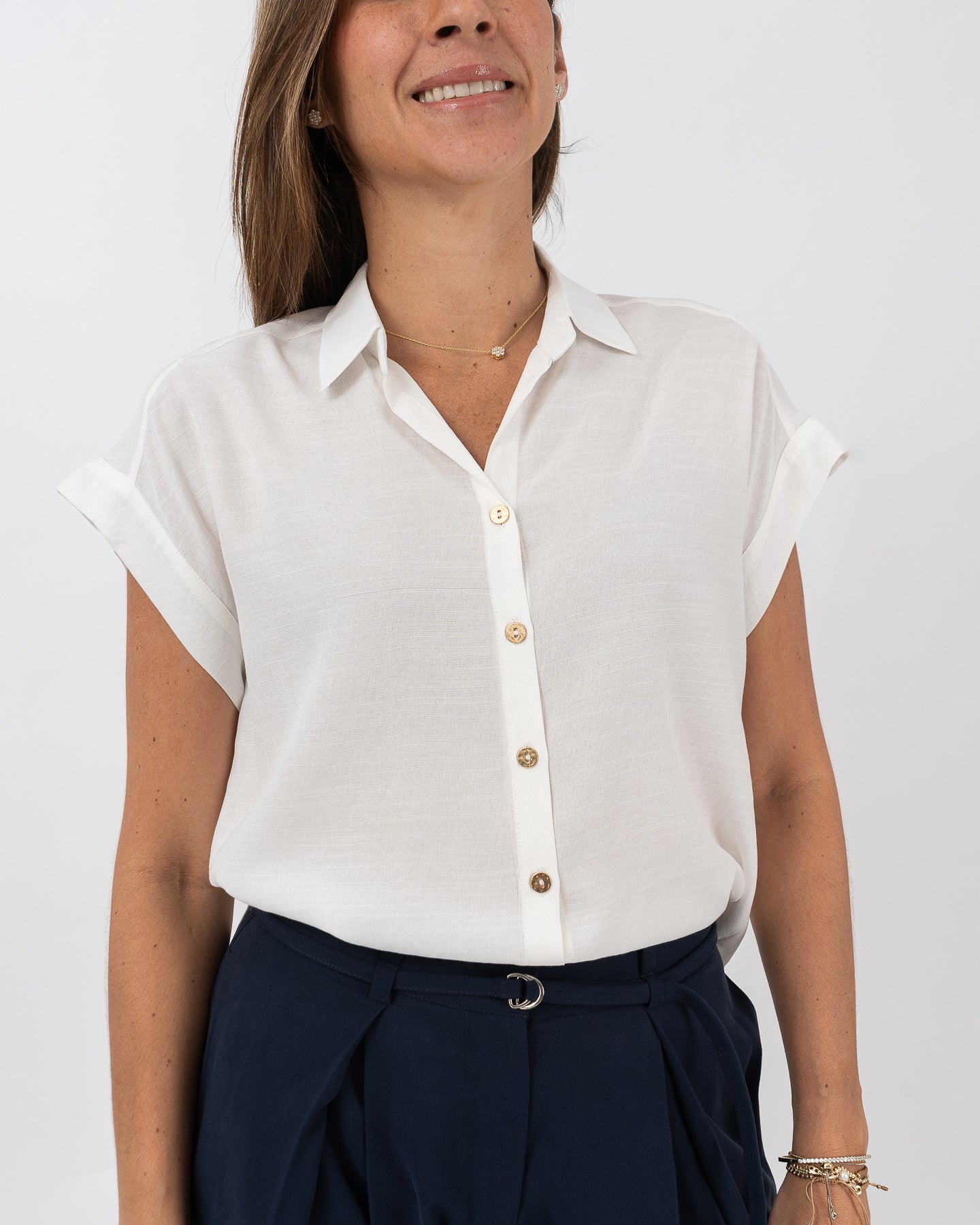 Kimono sleeve blouse with a shirt collar, front closure with a placket and golden buttons, back with shoulder pads and internal pleat.
