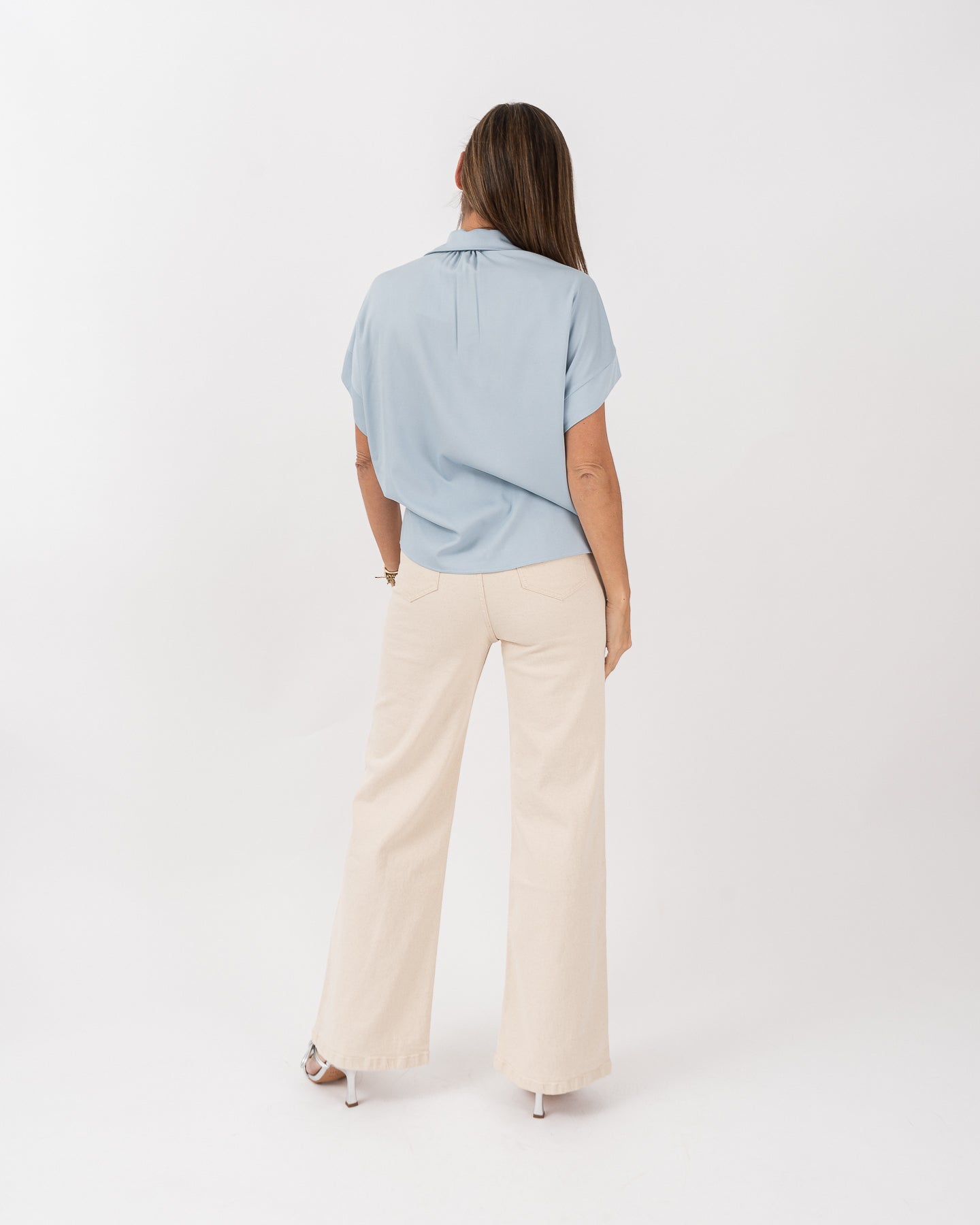 Kimono-sleeved shirt-collar blouse with a polo-style pouch and slight gathering at the back neckline.