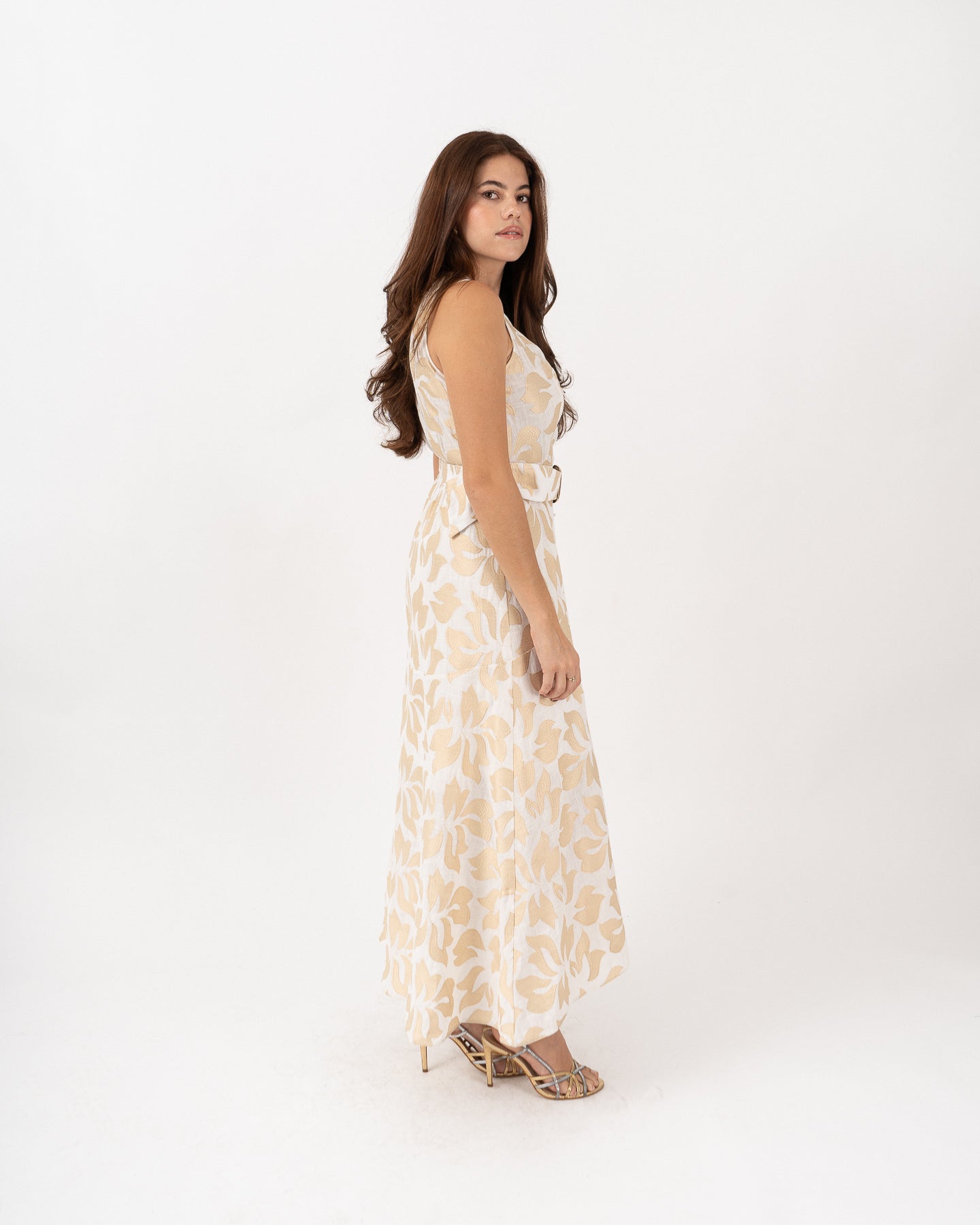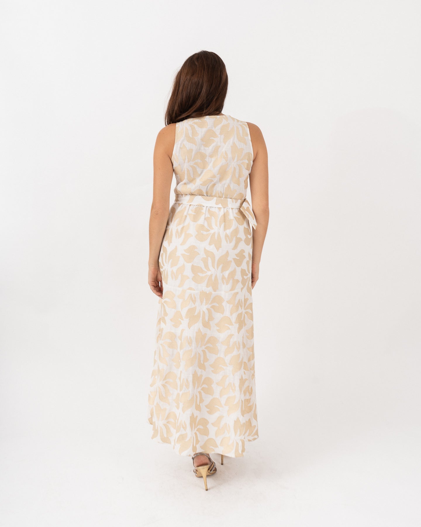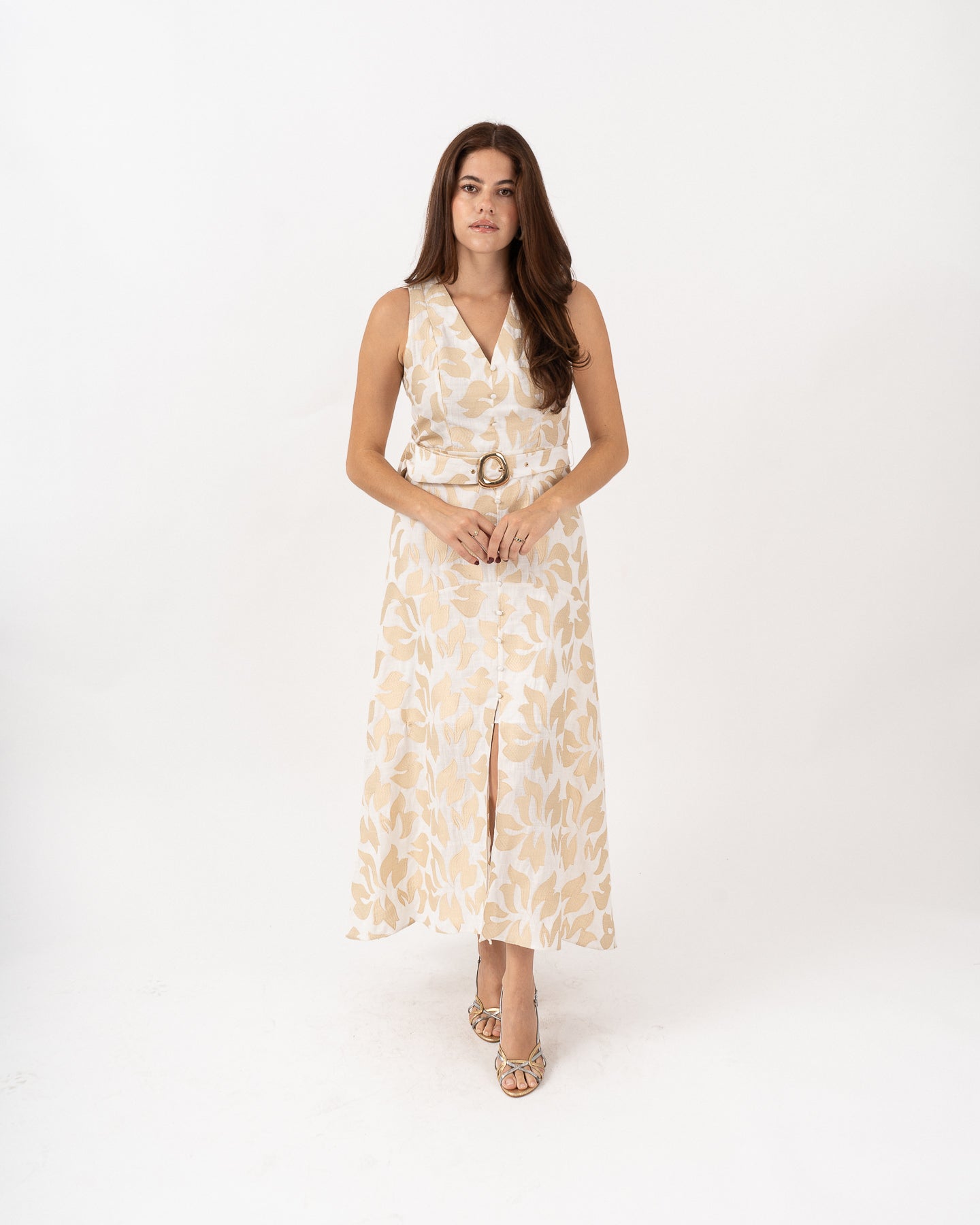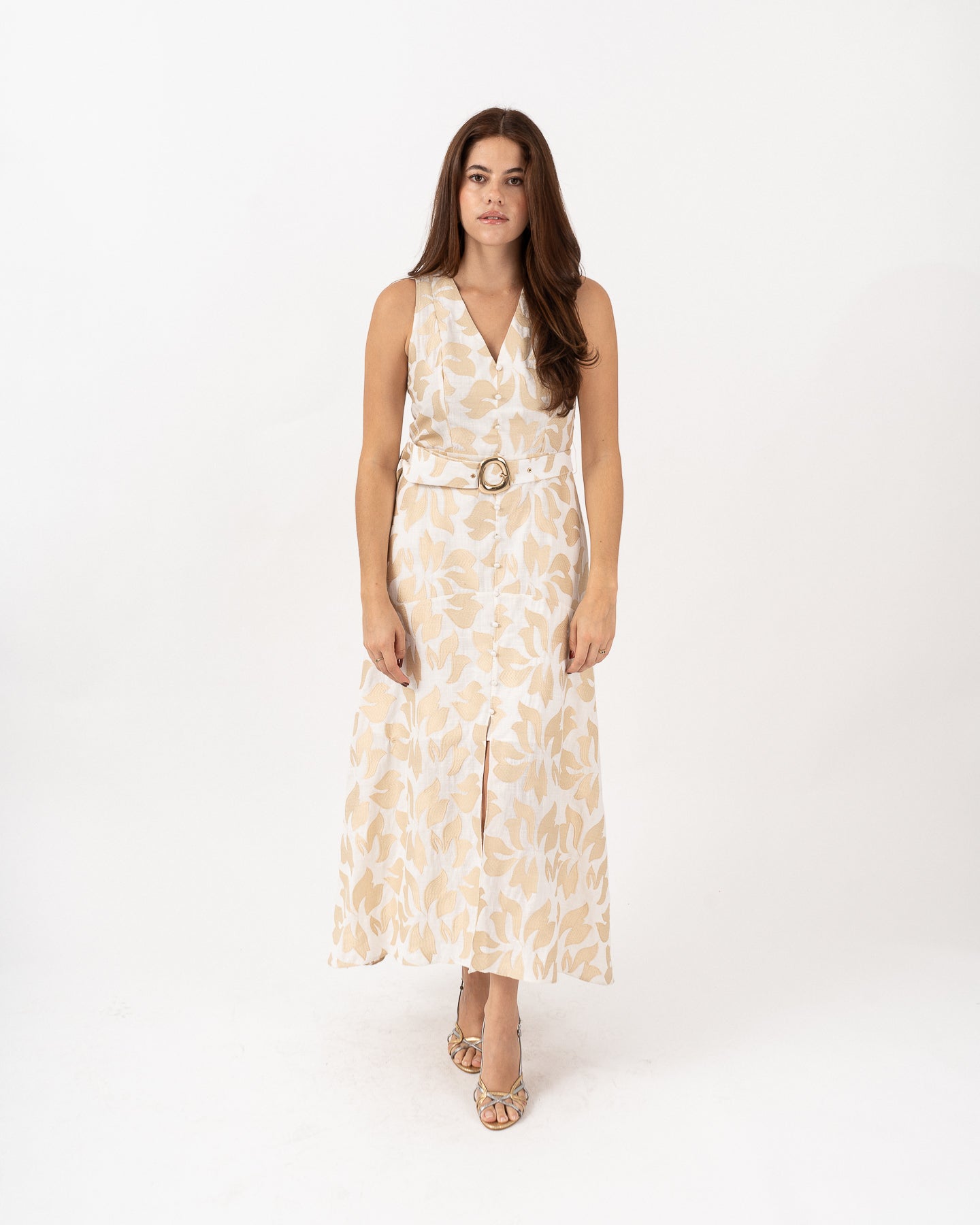 Sleeveless V-neck dress with an invisible side closure and a functional belt with a gold buckle. The center front is decorated with covered buttons.