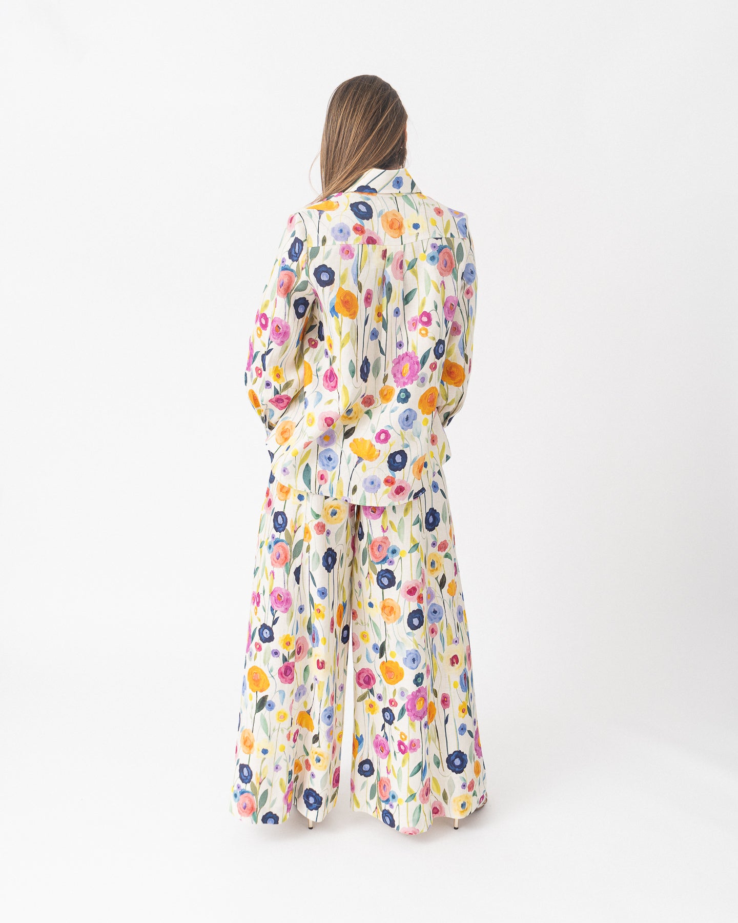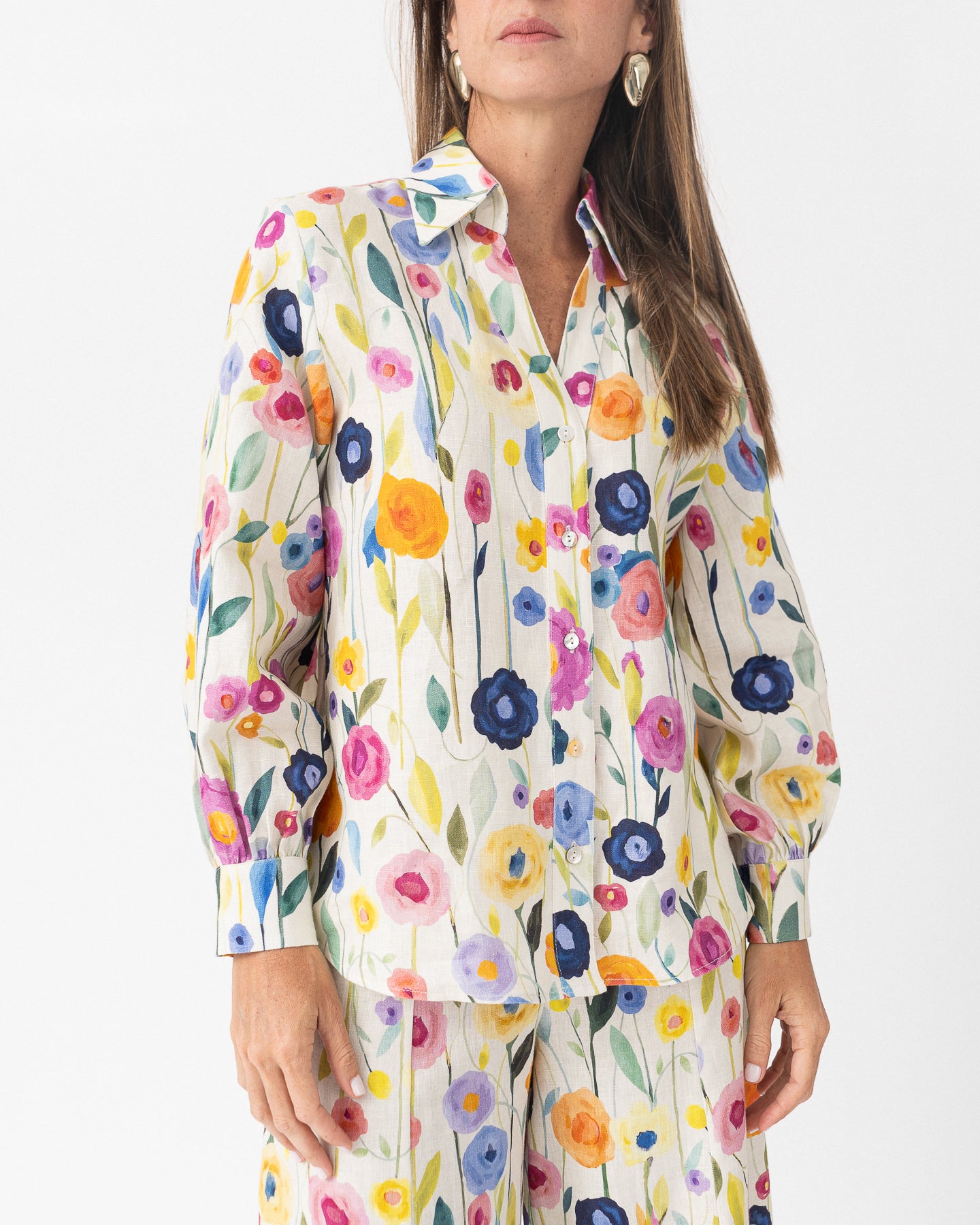 Semi-oversized blouse with a shirt collar and puffed sleeves with functional cuffs.