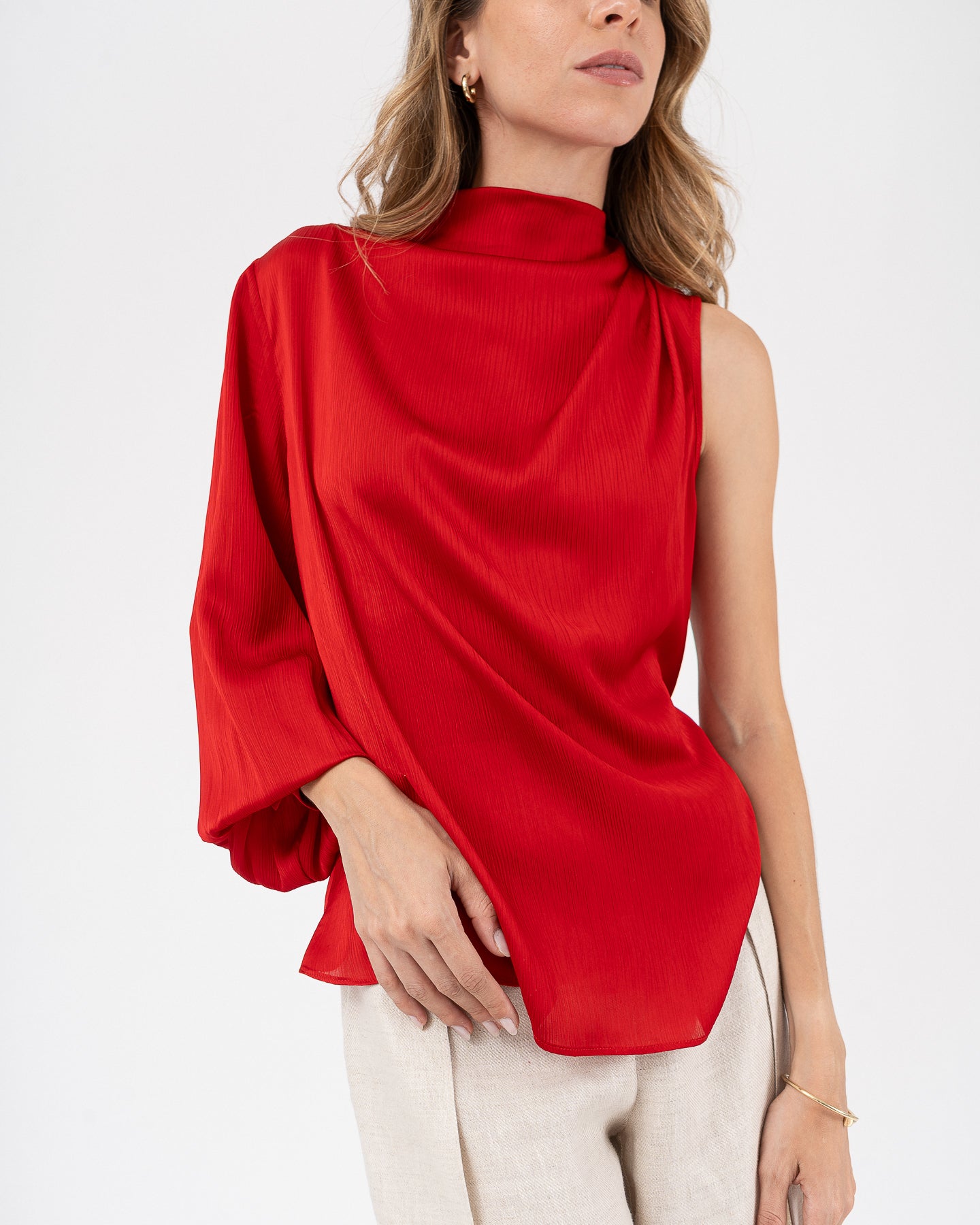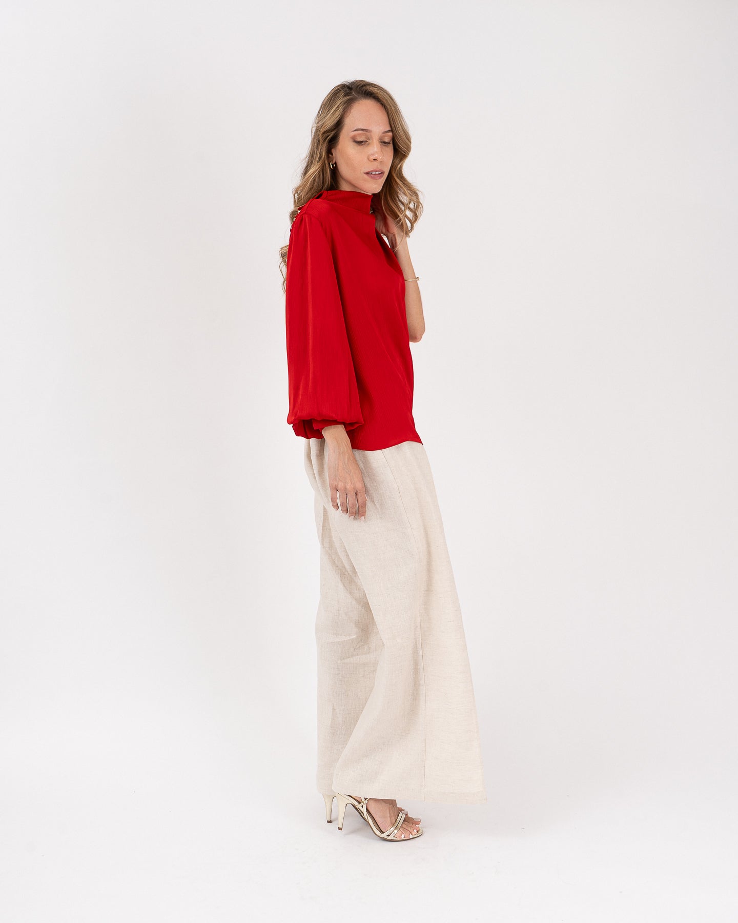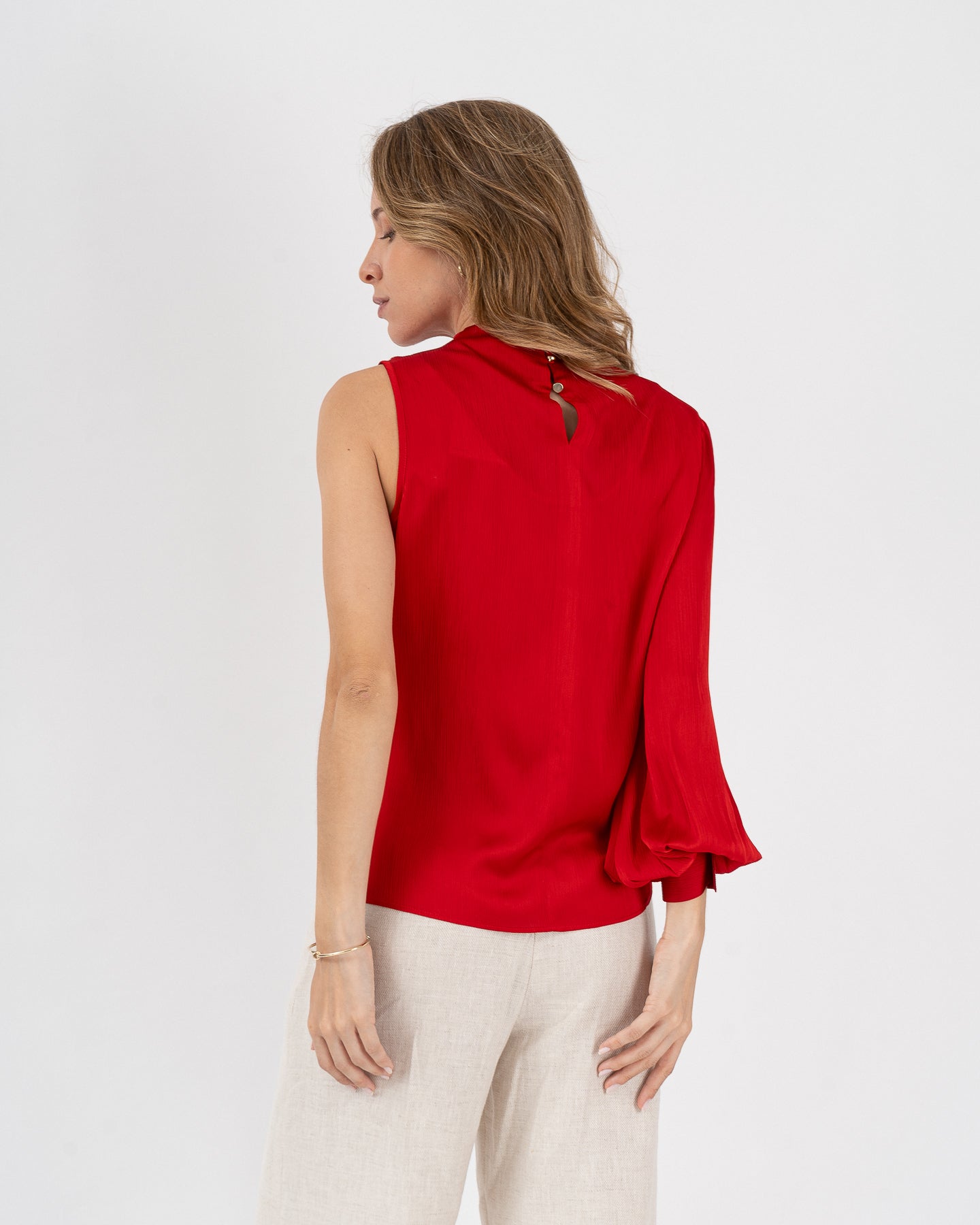 Blusa asimétrica de cuello alto con tablones en hombro izquierdo y manga derecha con puño funcional. Botones dorados en centro posterior.