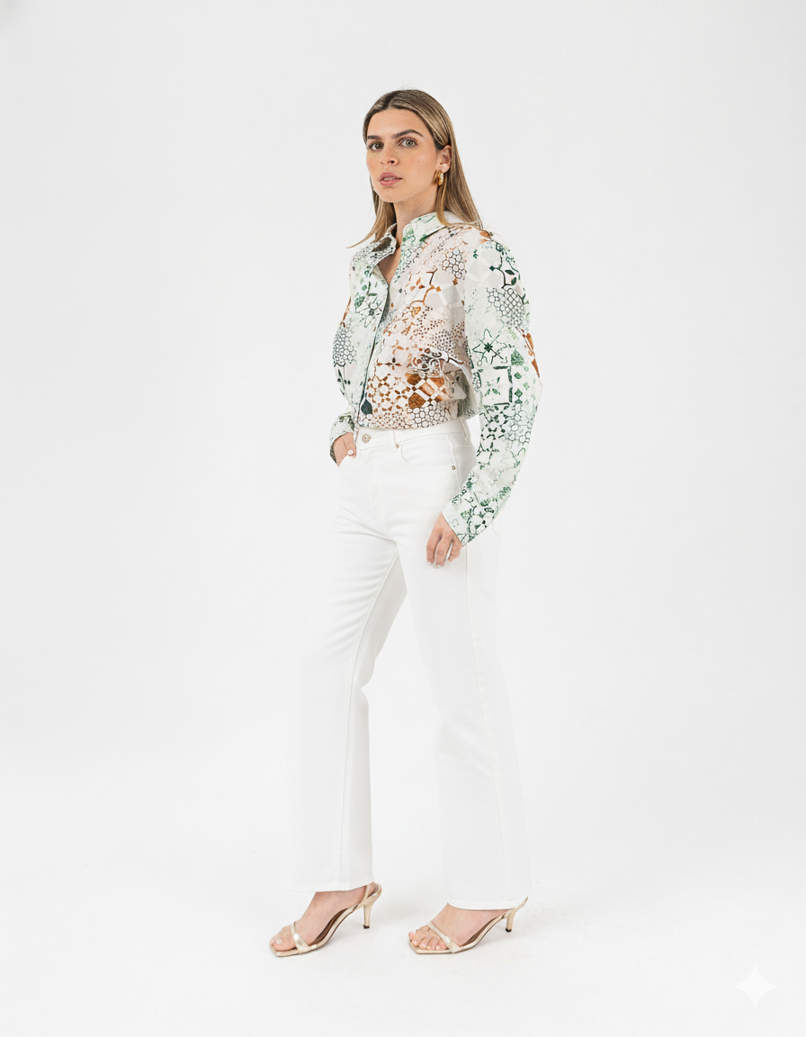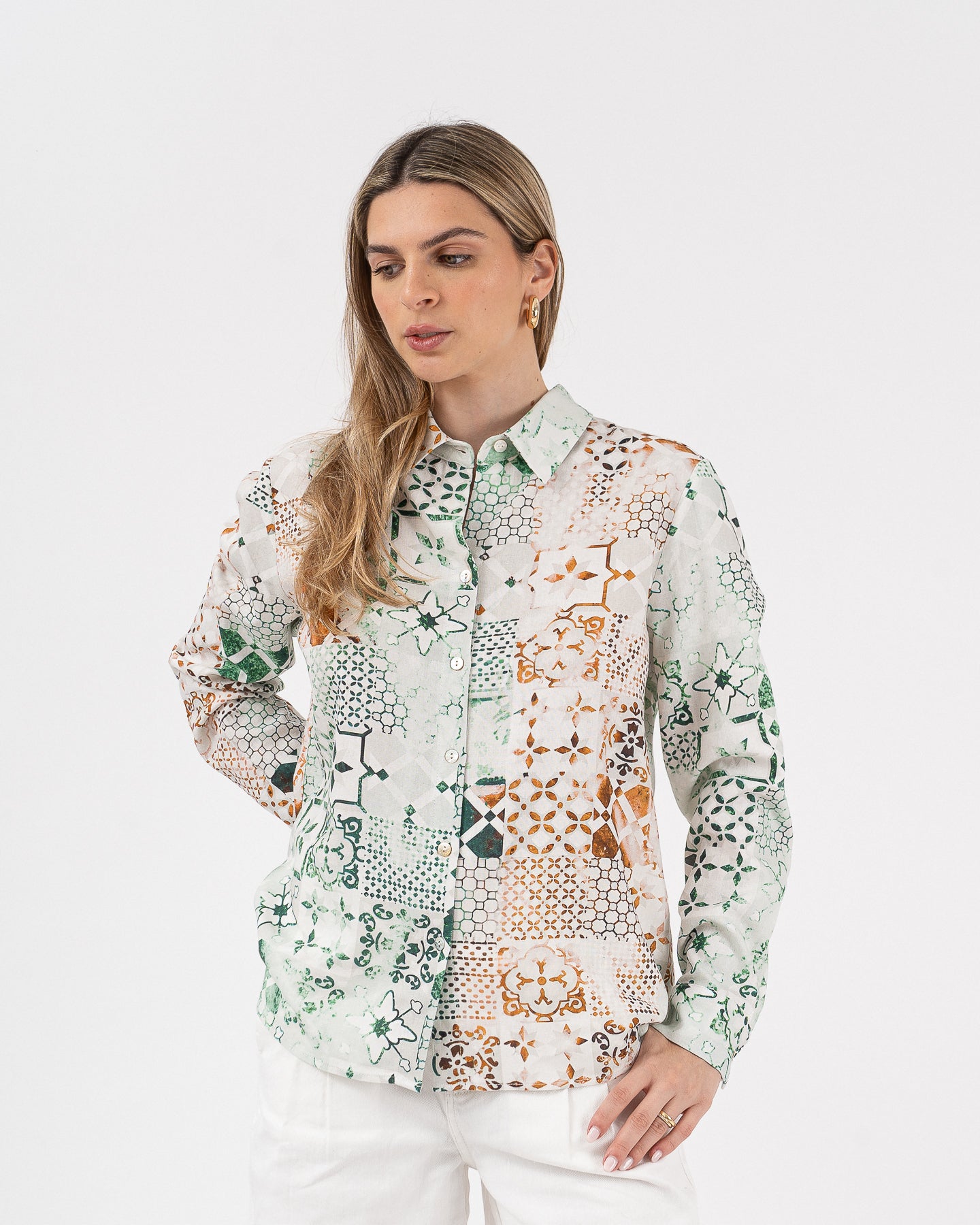 Blusa cuello camisero manga larga con puños, cierre frontal delantero con botones funcionales.