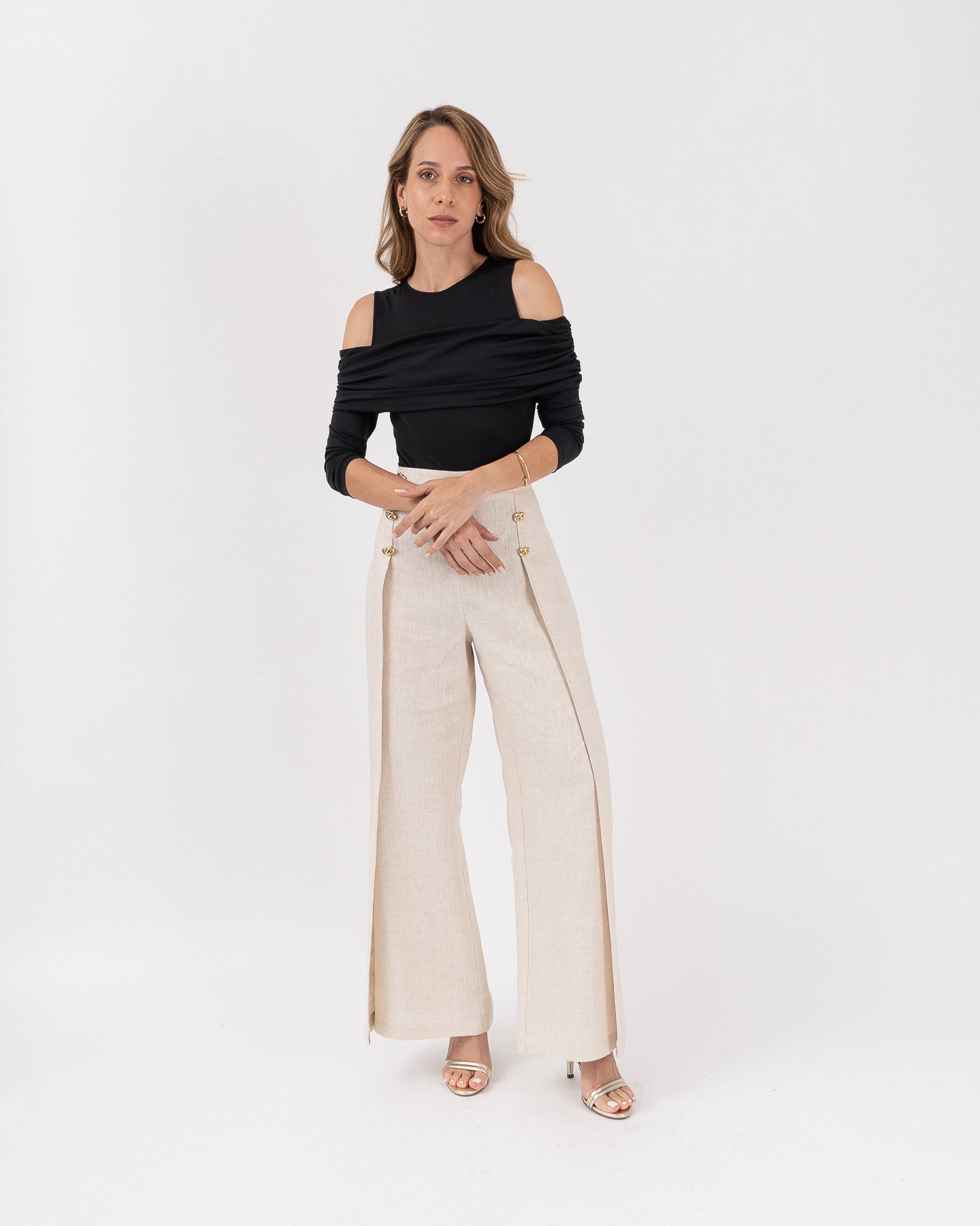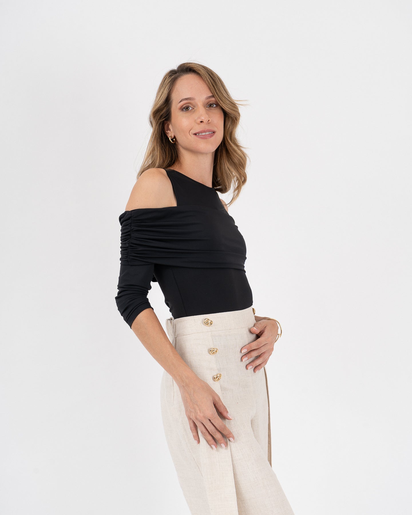 Body escote redondo, hombros descubiertos con manga larga y solapa recogida en costados. Cierre interno con broches metálicos a presión.