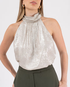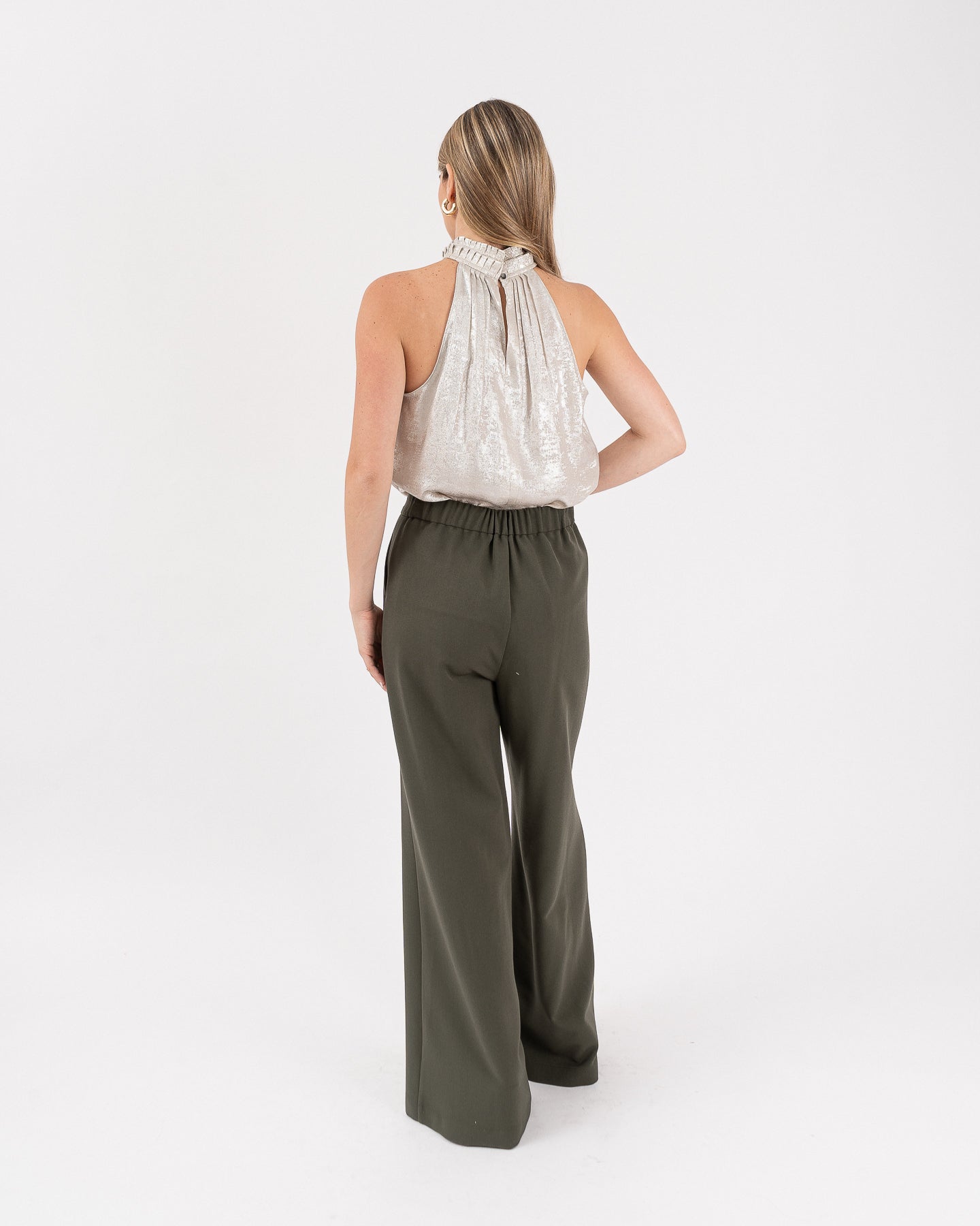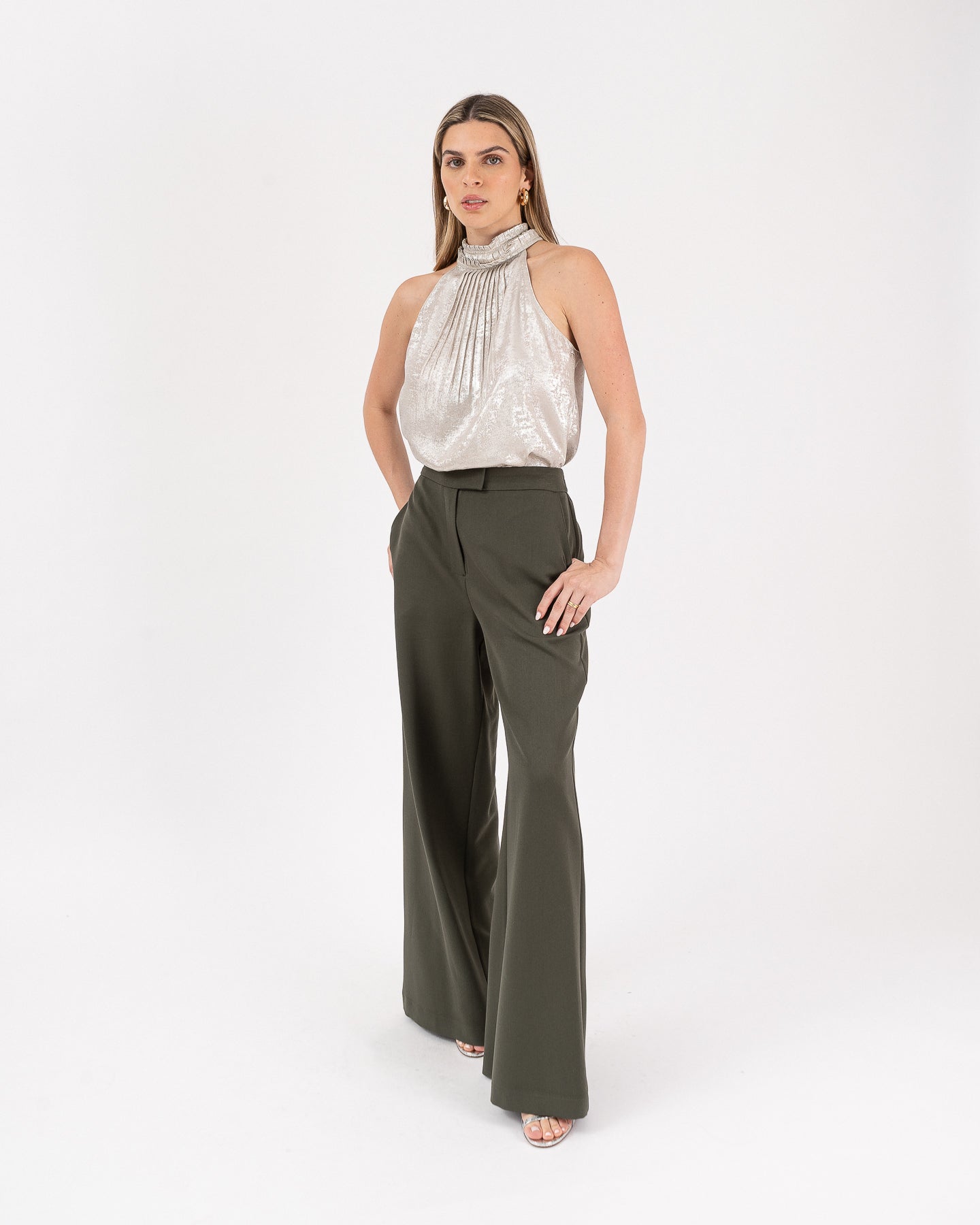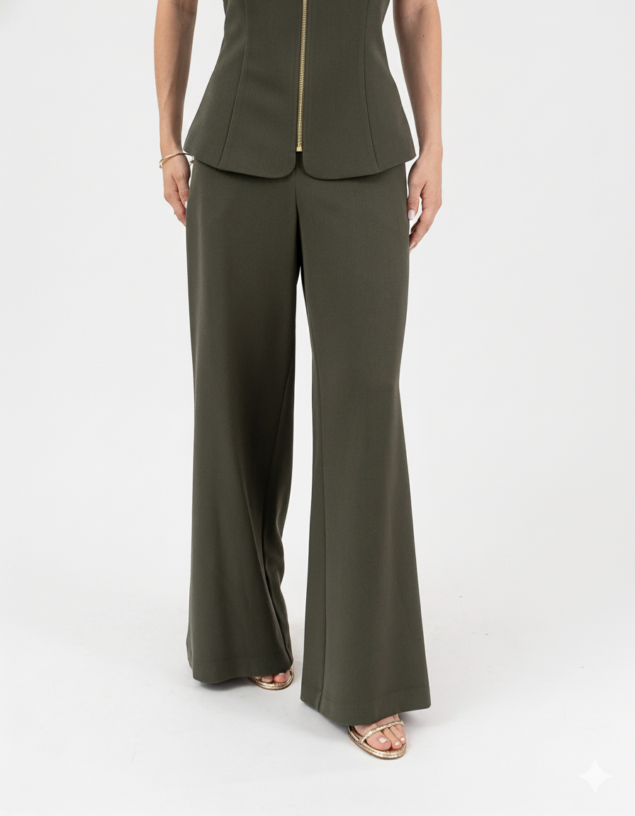 Pantalón de tiro alto con pretina cruzada y bragueta funcional.