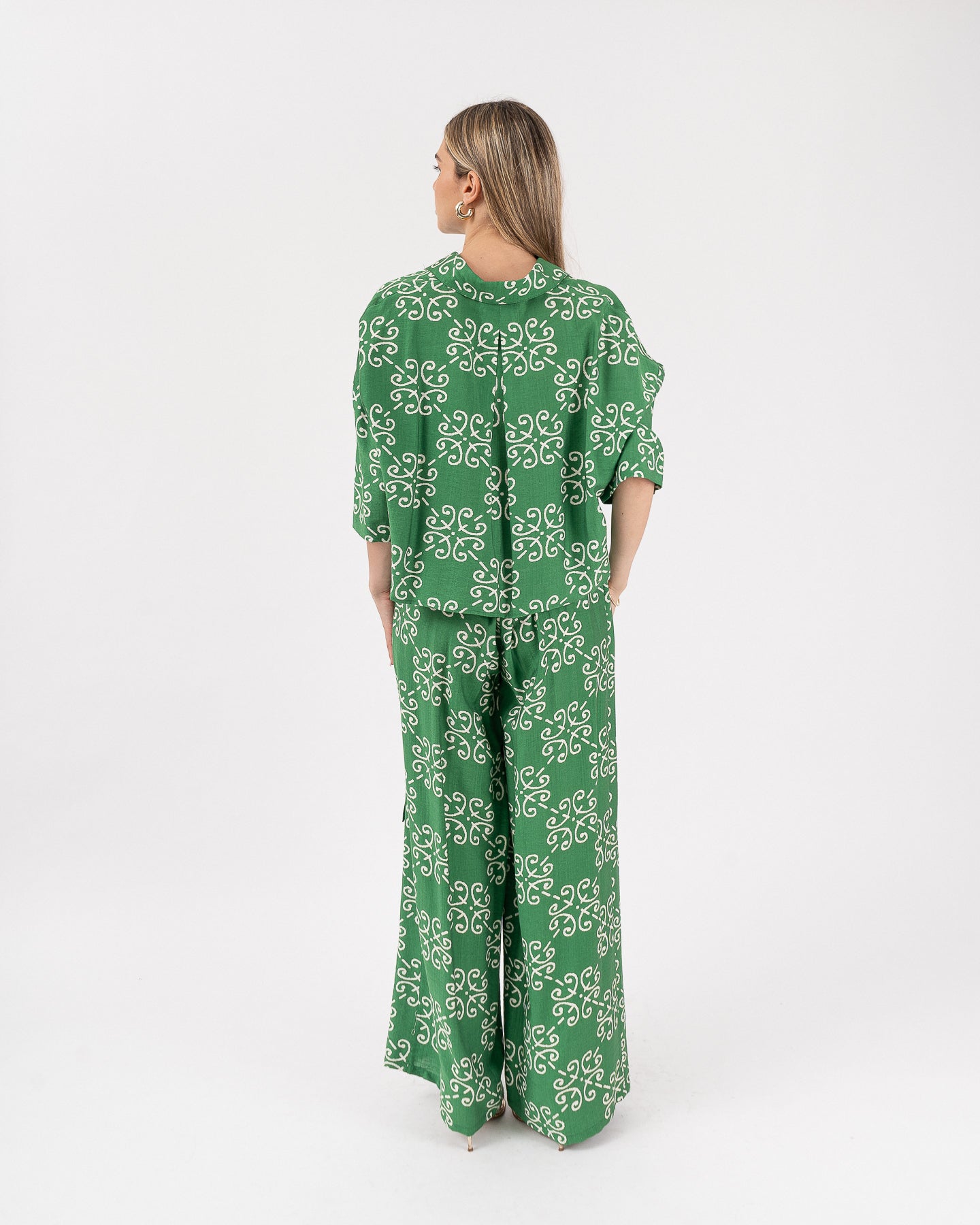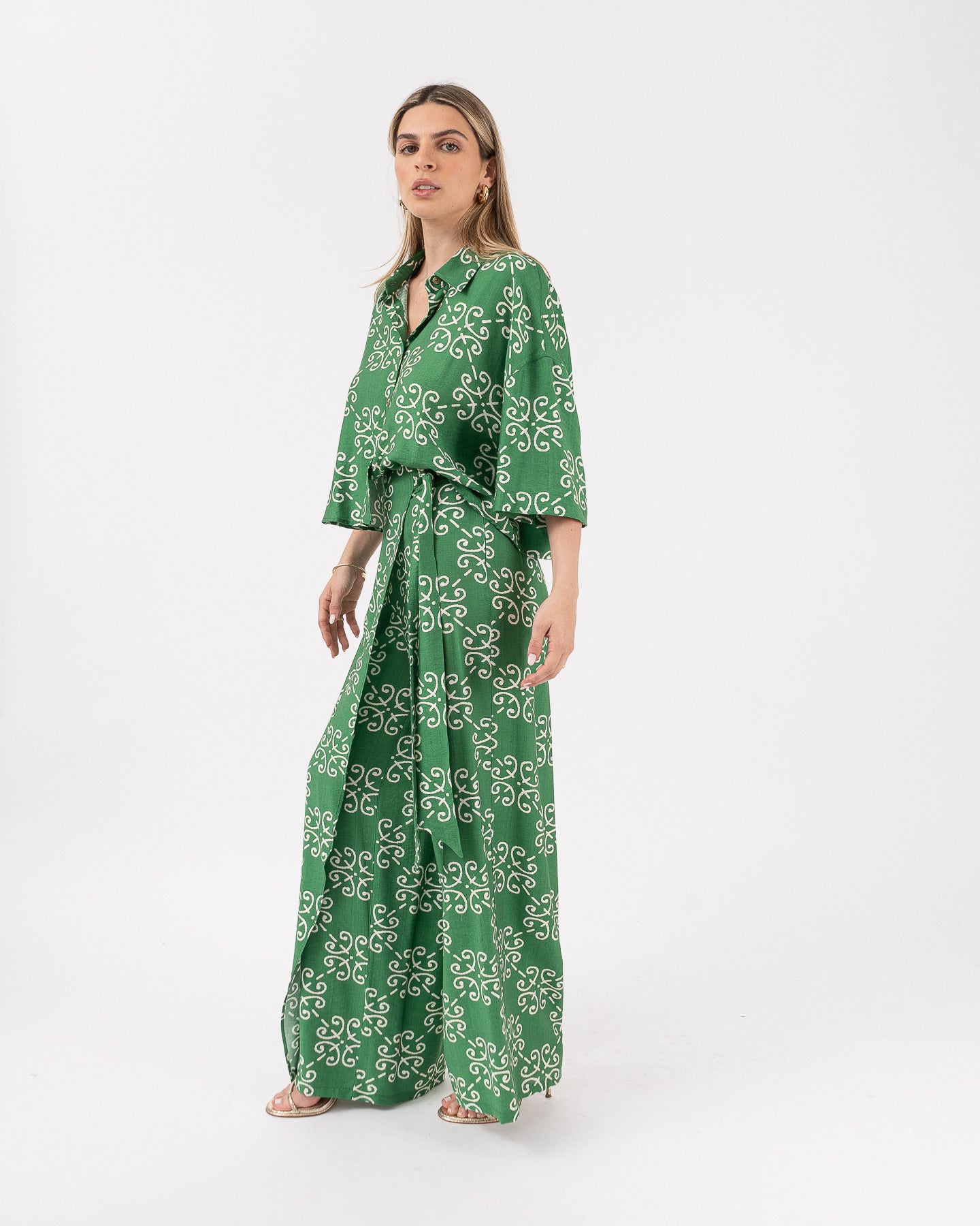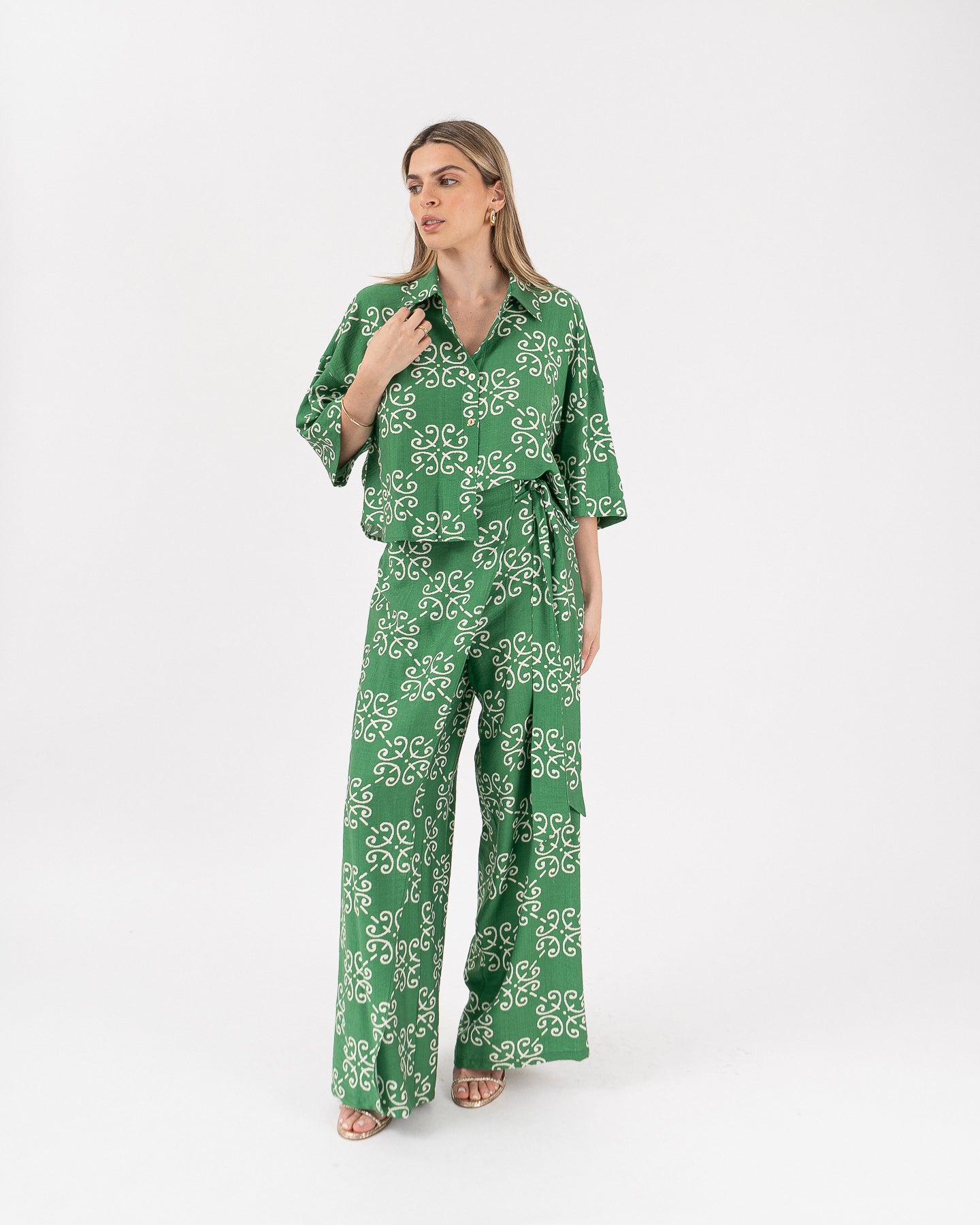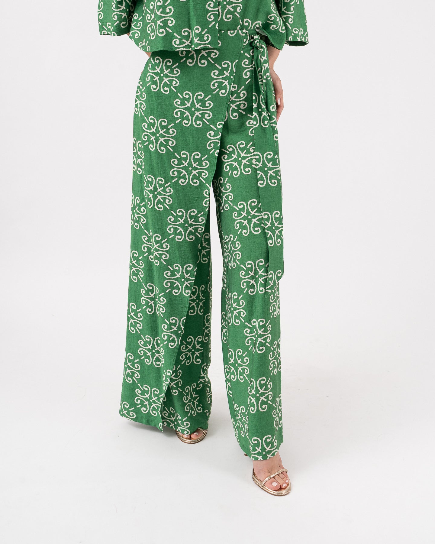 Pantalón de tiro alto con elástico pasado en cintura posterior, cierre invisible en costado izquierdo, capa delantera con tira de amarre.