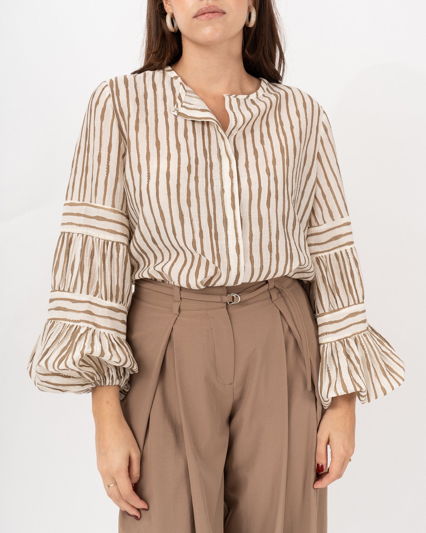 Round neck blouse with hidden pocket and wide sleeves with slits, elastic around the cuffs.