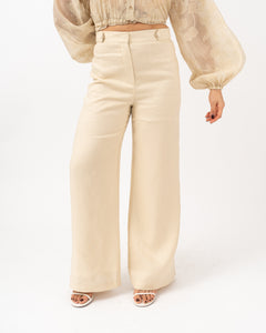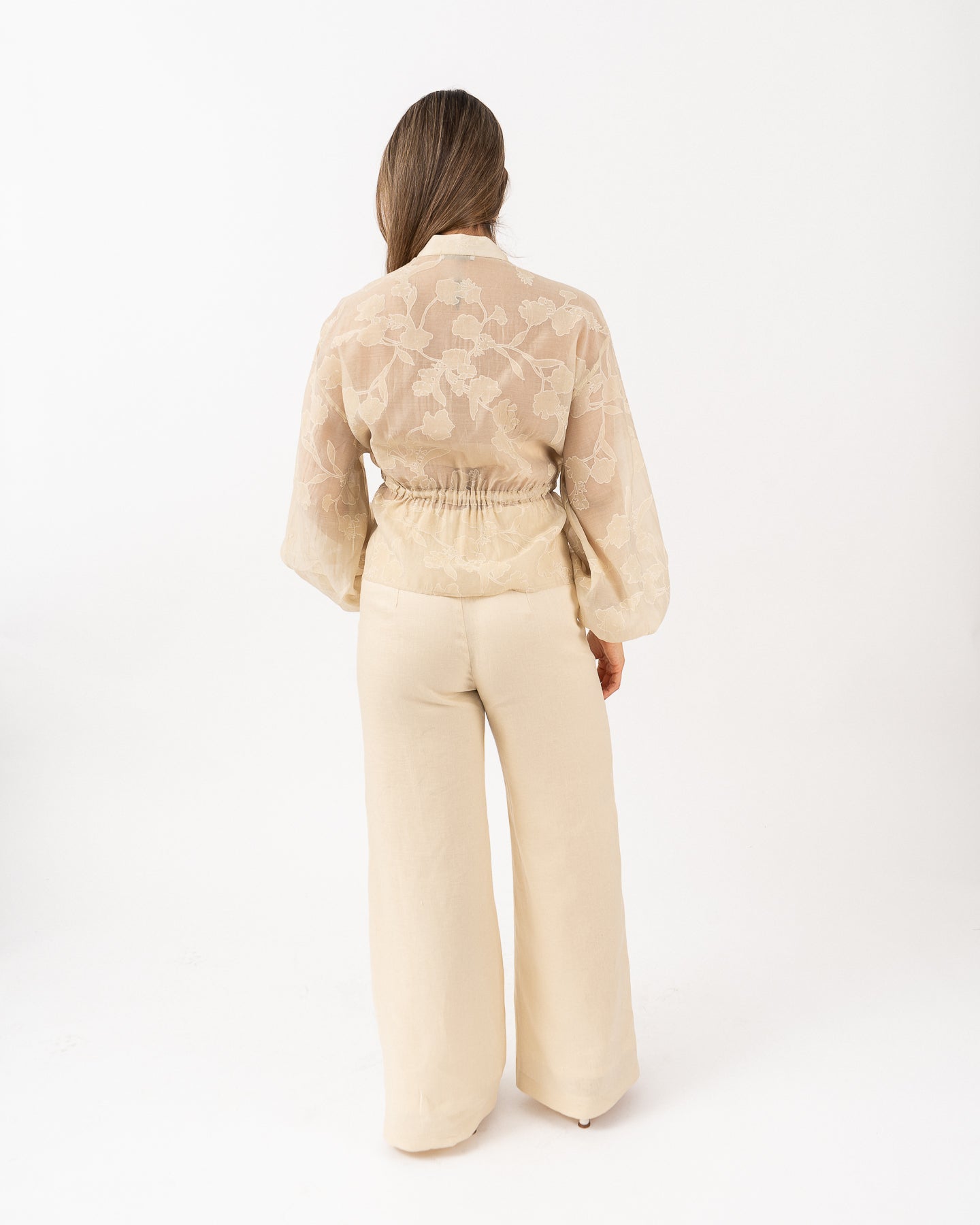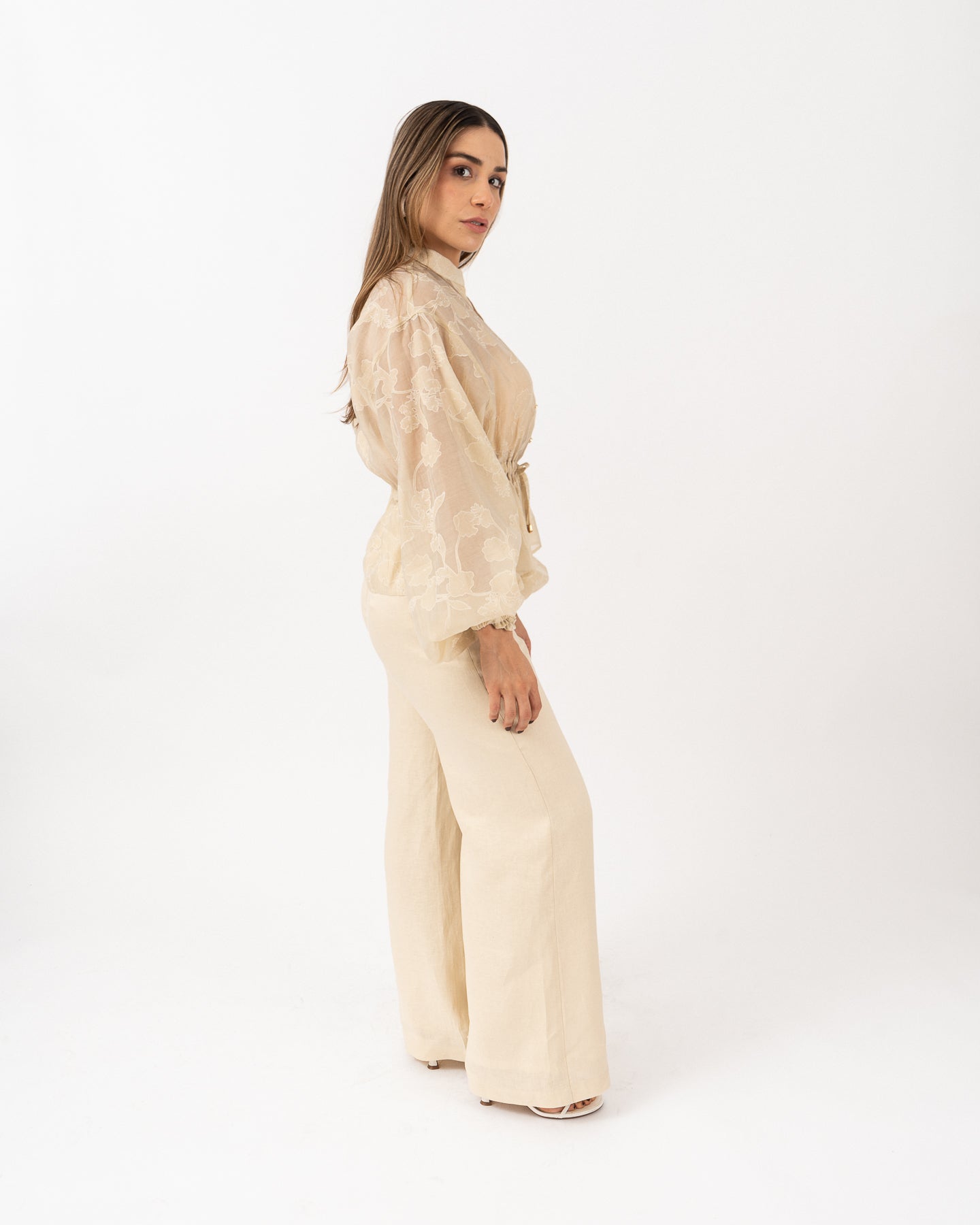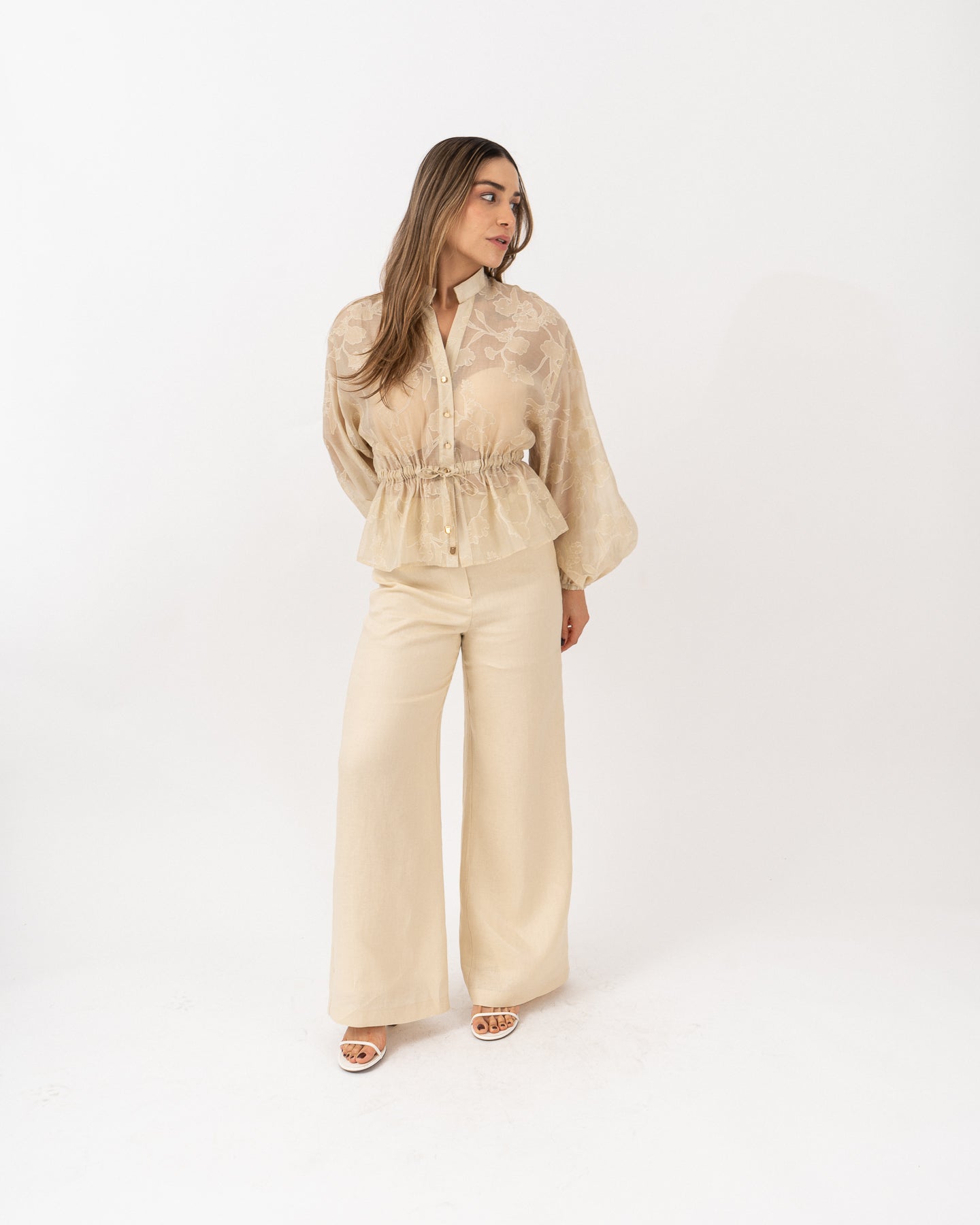 Neru-neck blouse with puffed sleeves and elastic cuffs, gold-button front closure, and waist-adjusting straps with gold tips.