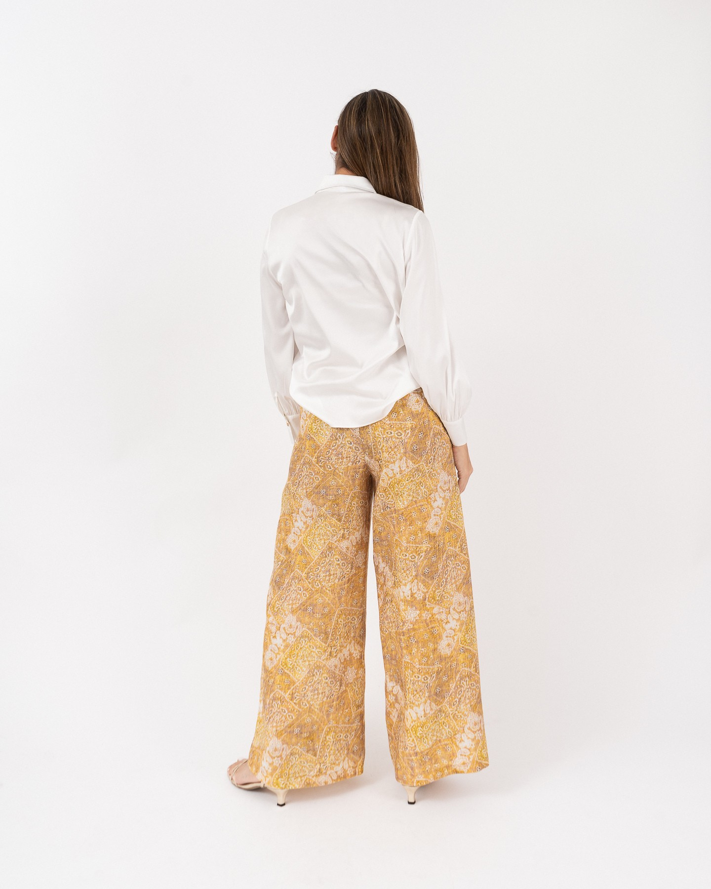 Long-sleeved shirt-collar blouse with functional cuffs. Gold button closure at the front.
