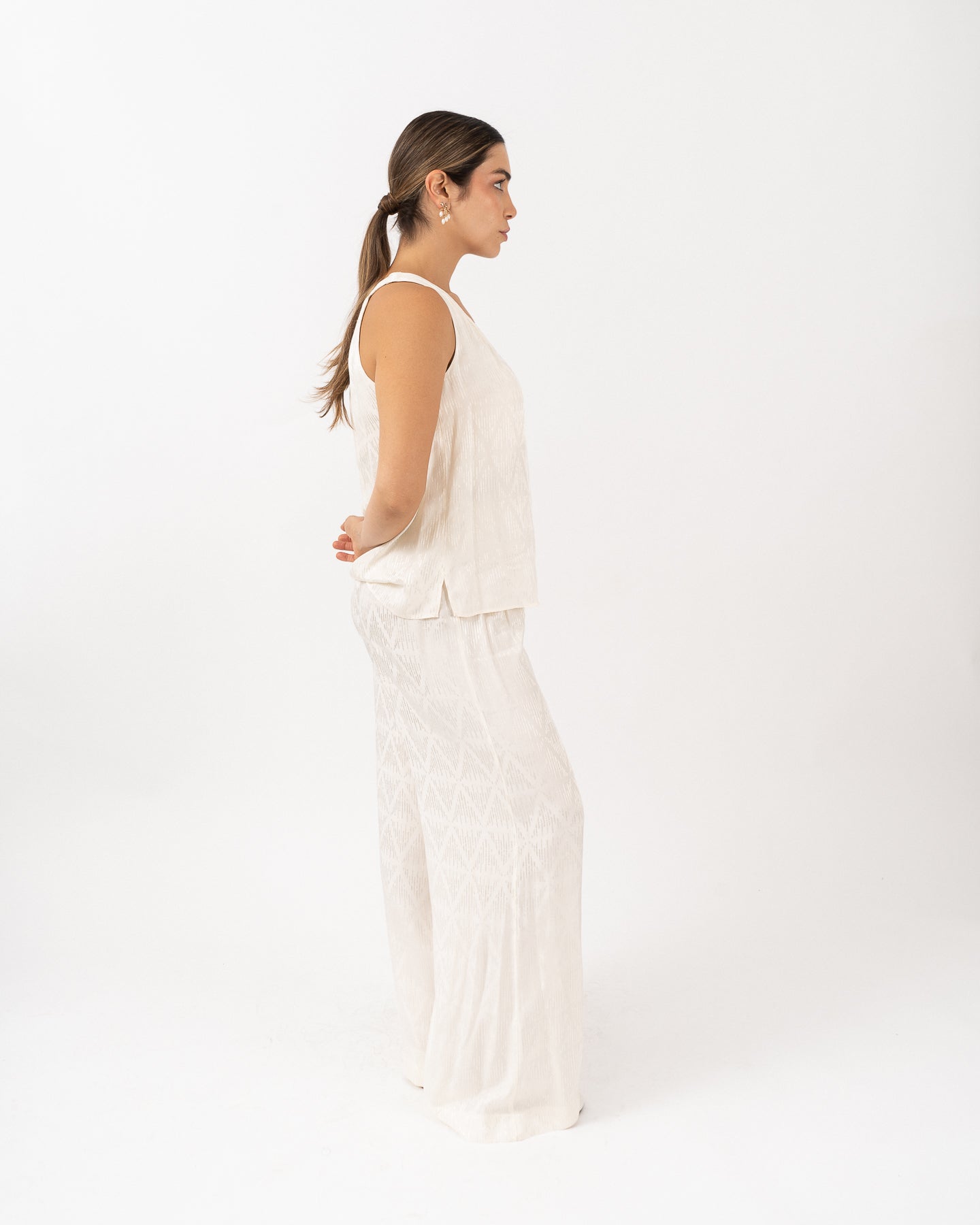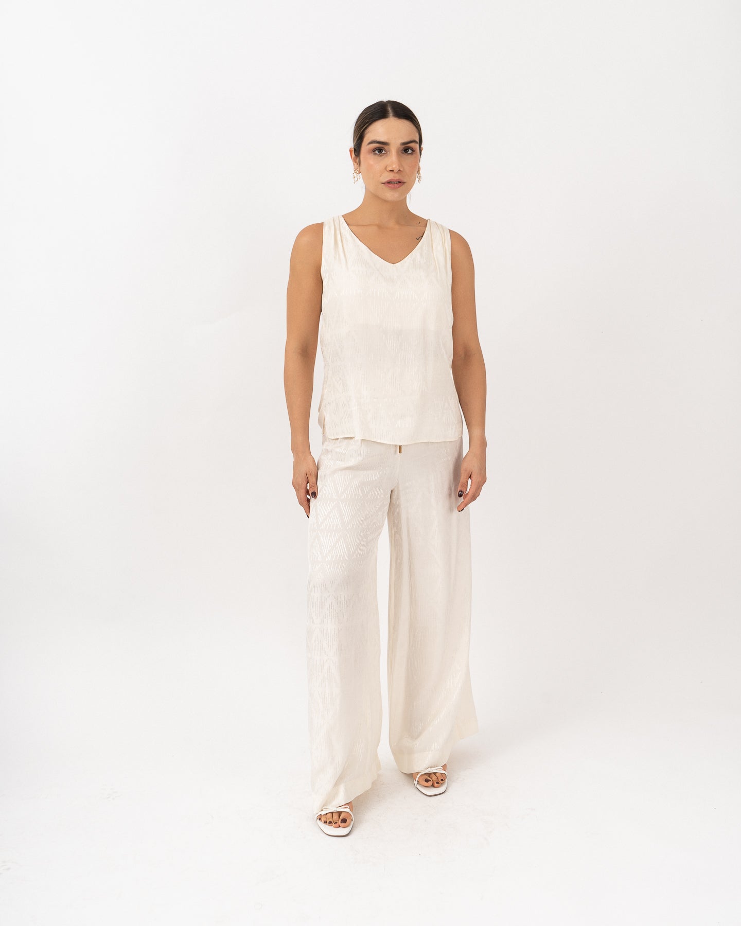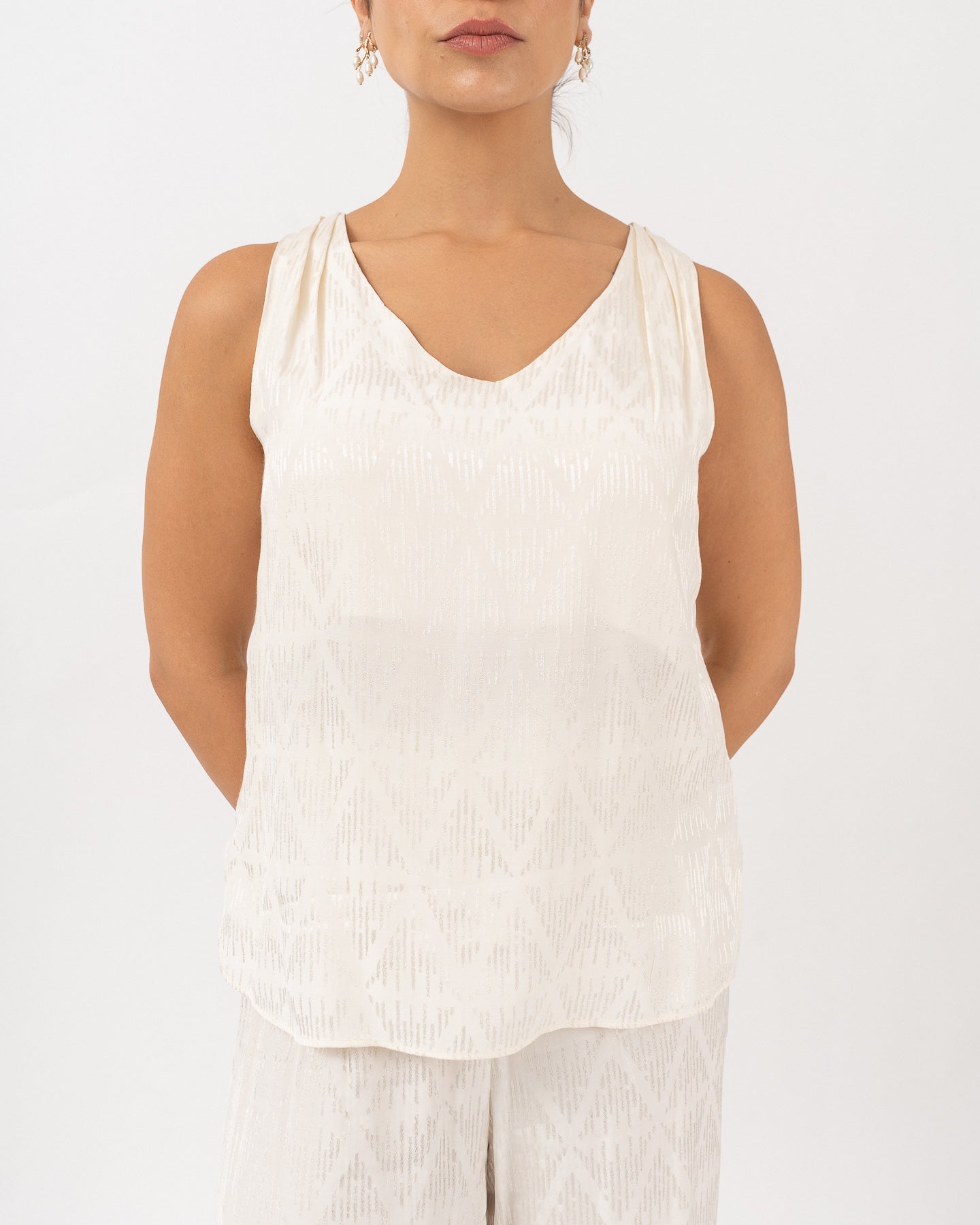 Blouse with lined neckline and armholes, V-neckline with slight gathering at the back and slits on the sides.