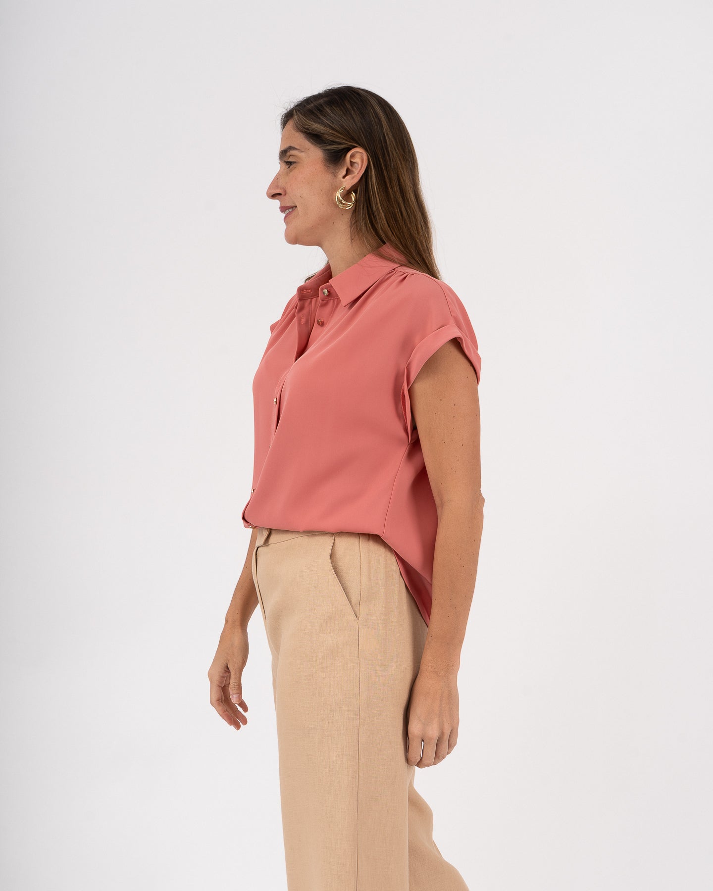 Kimono-sleeved shirt-collar blouse with a duster. Gold-tone button closure at the front.