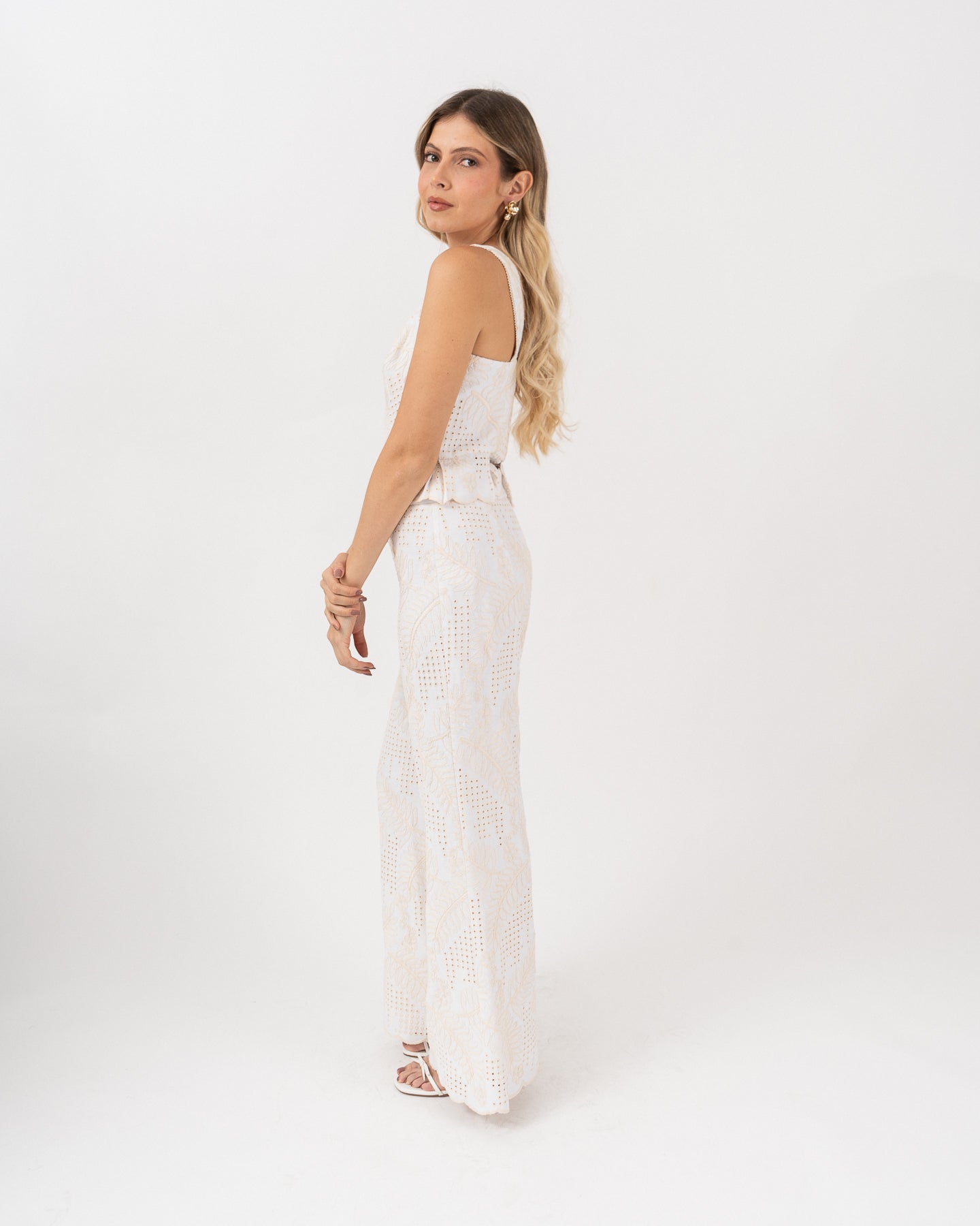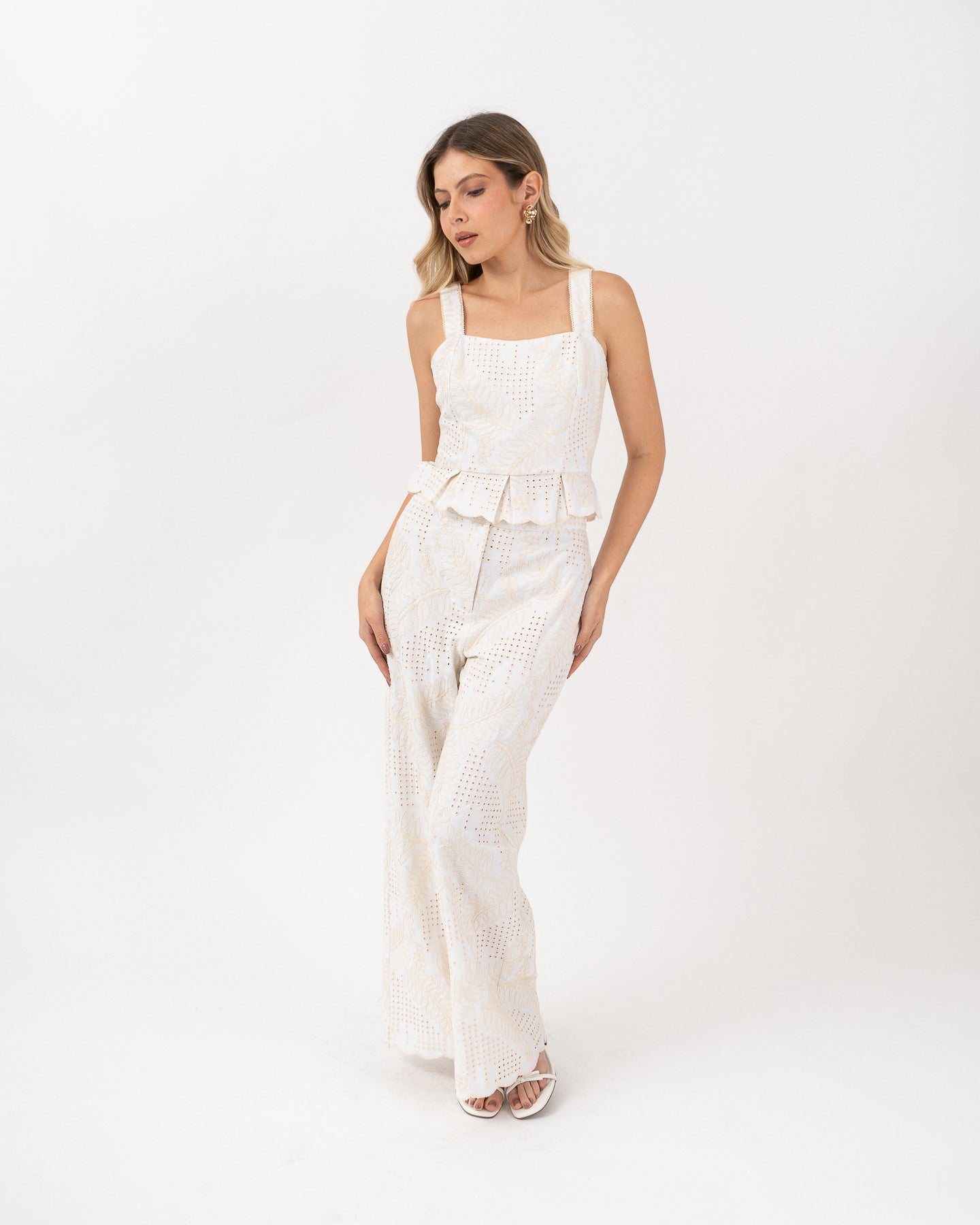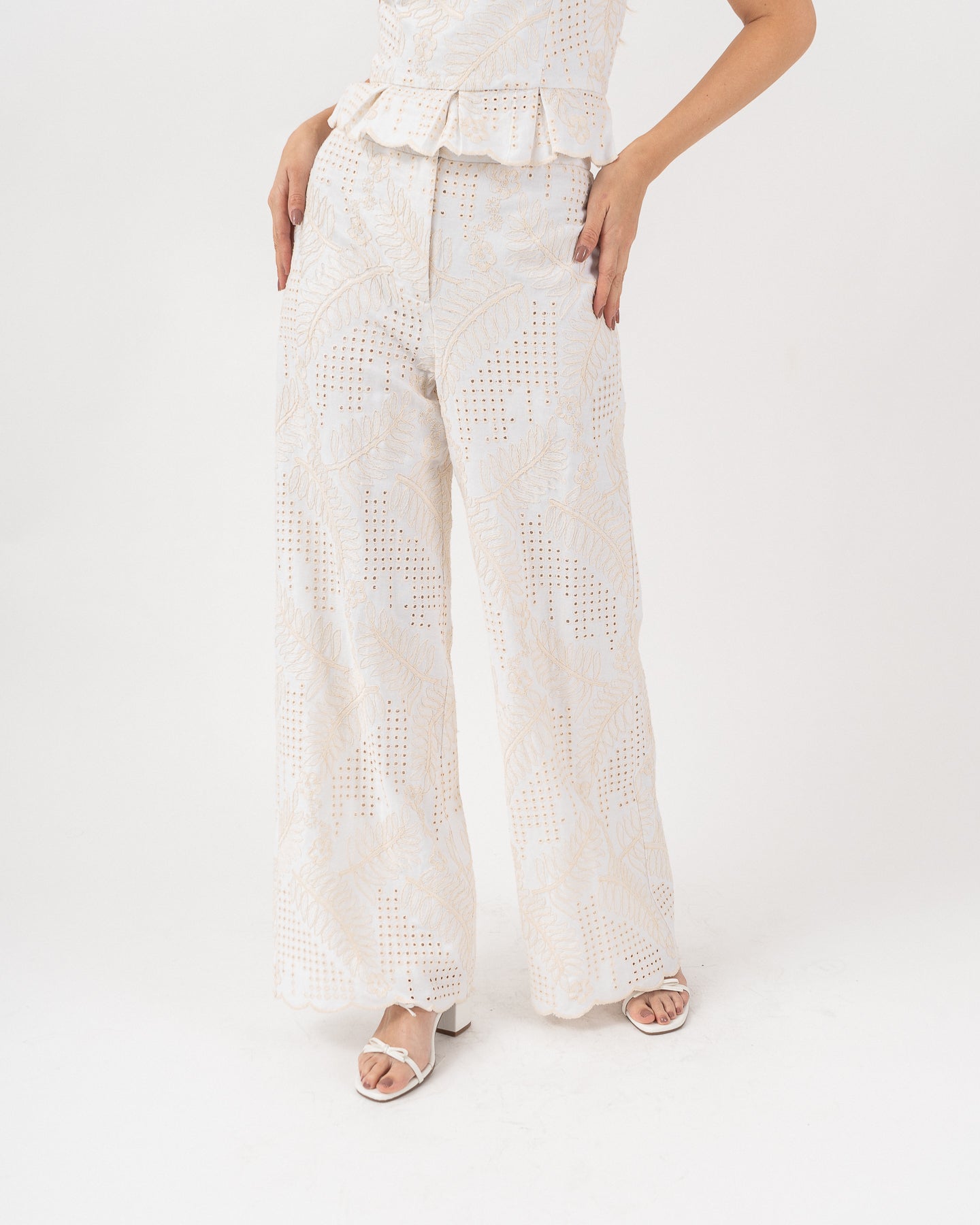 High-waisted, lined trousers with a waistband and functional fly. Ankle boots with embroidered detail.
