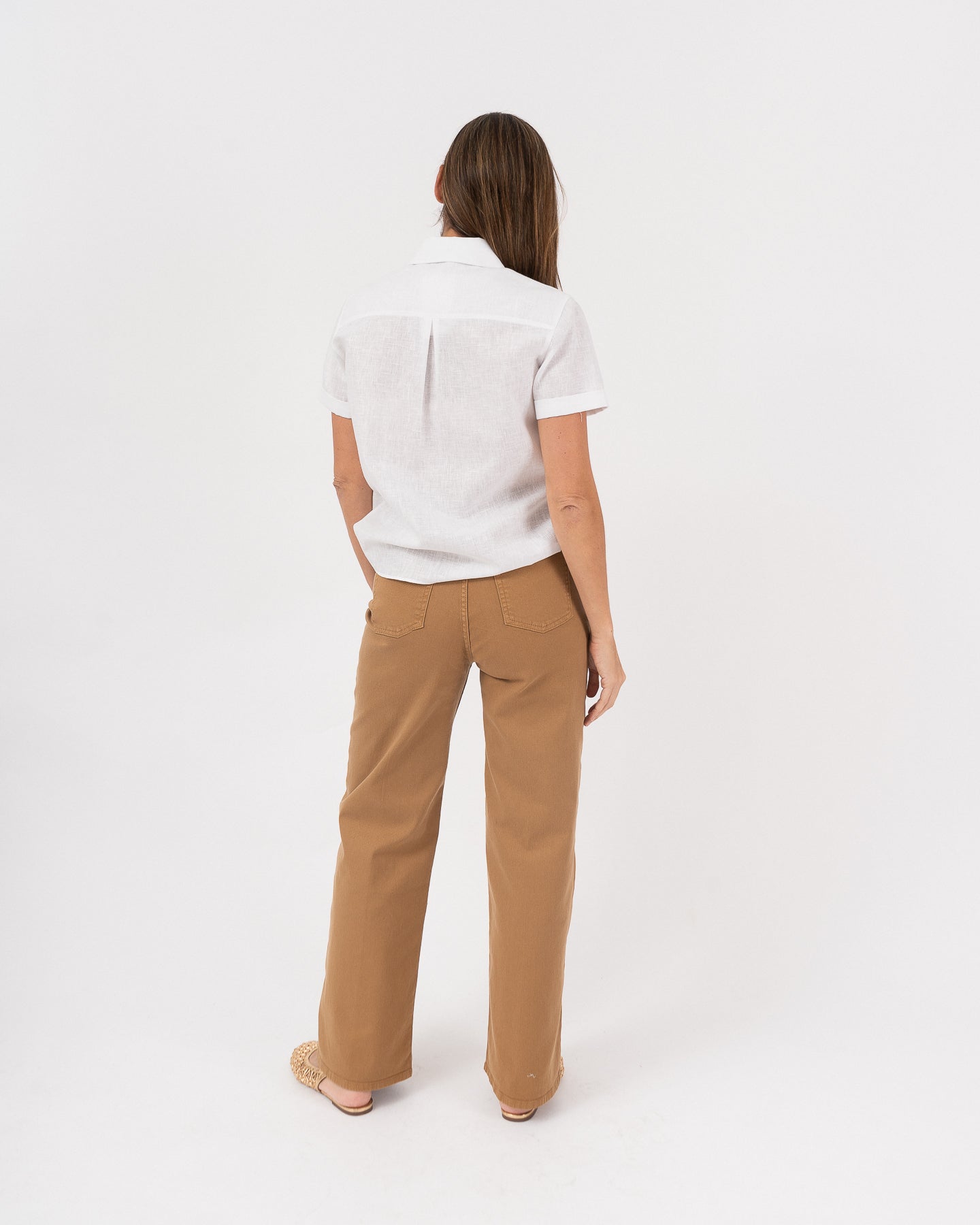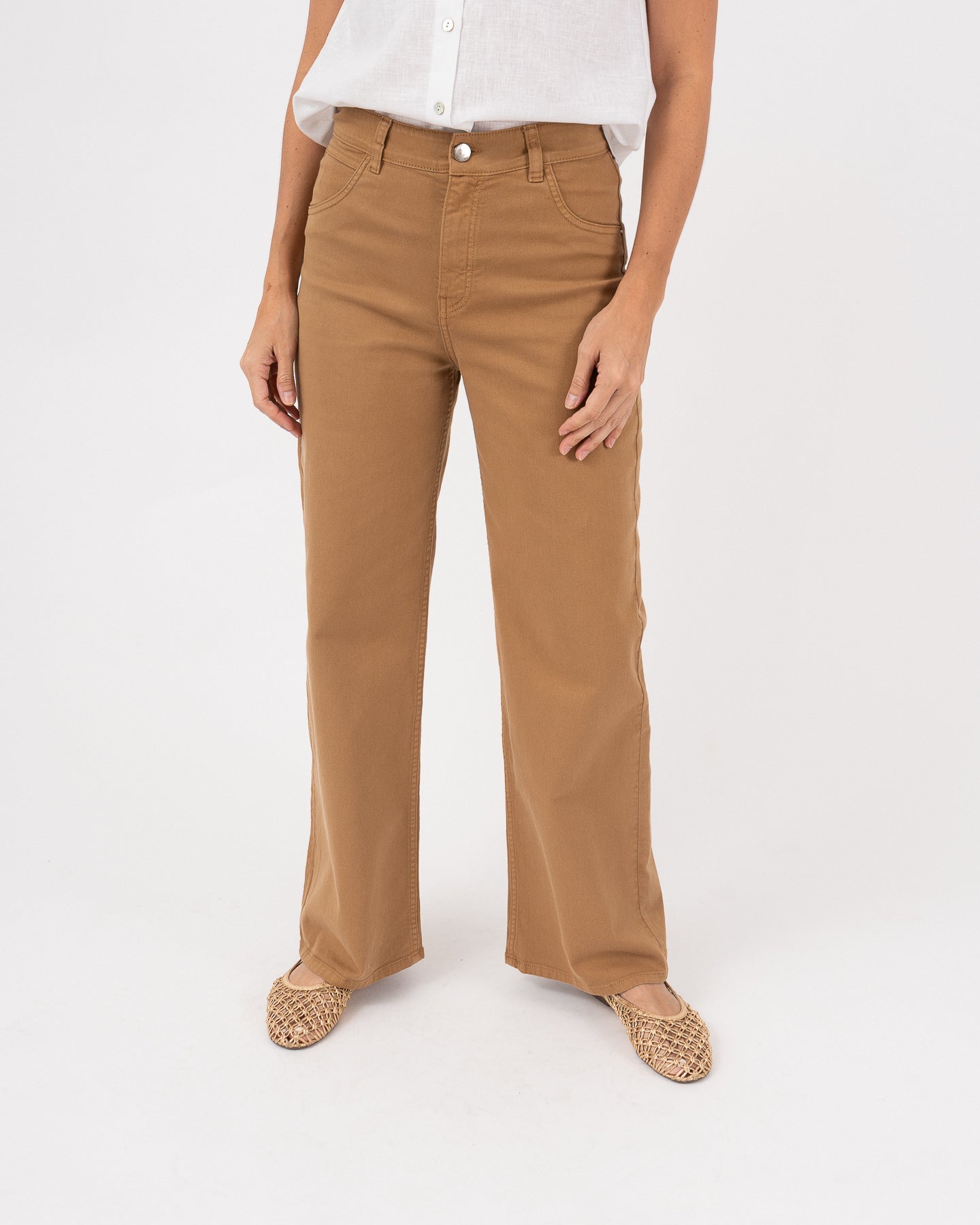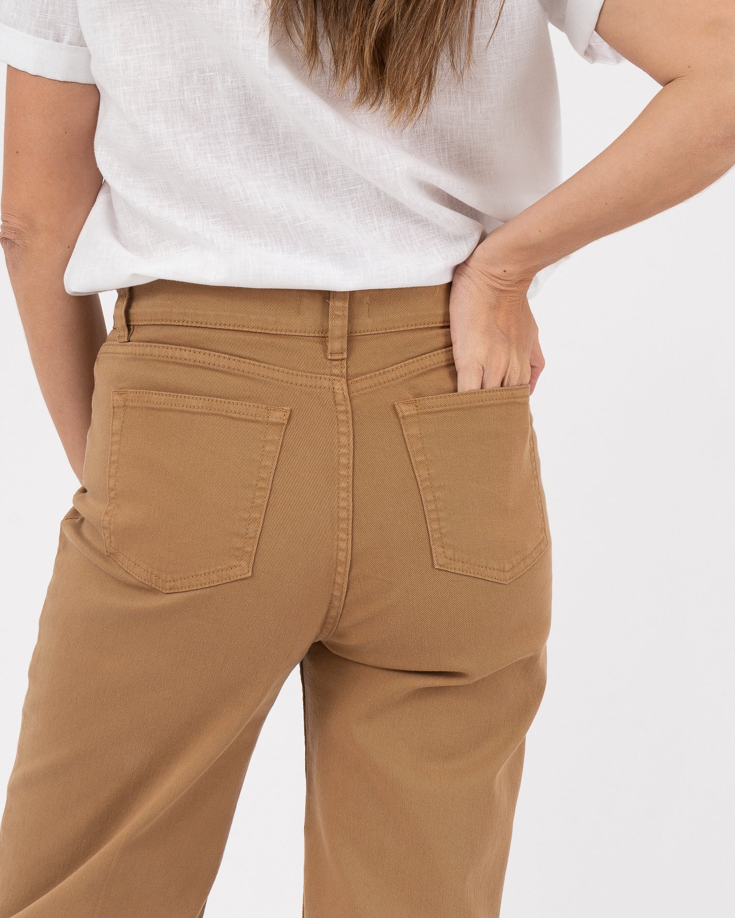 Camel-colored high-waisted denim pants with back pockets and hem detail