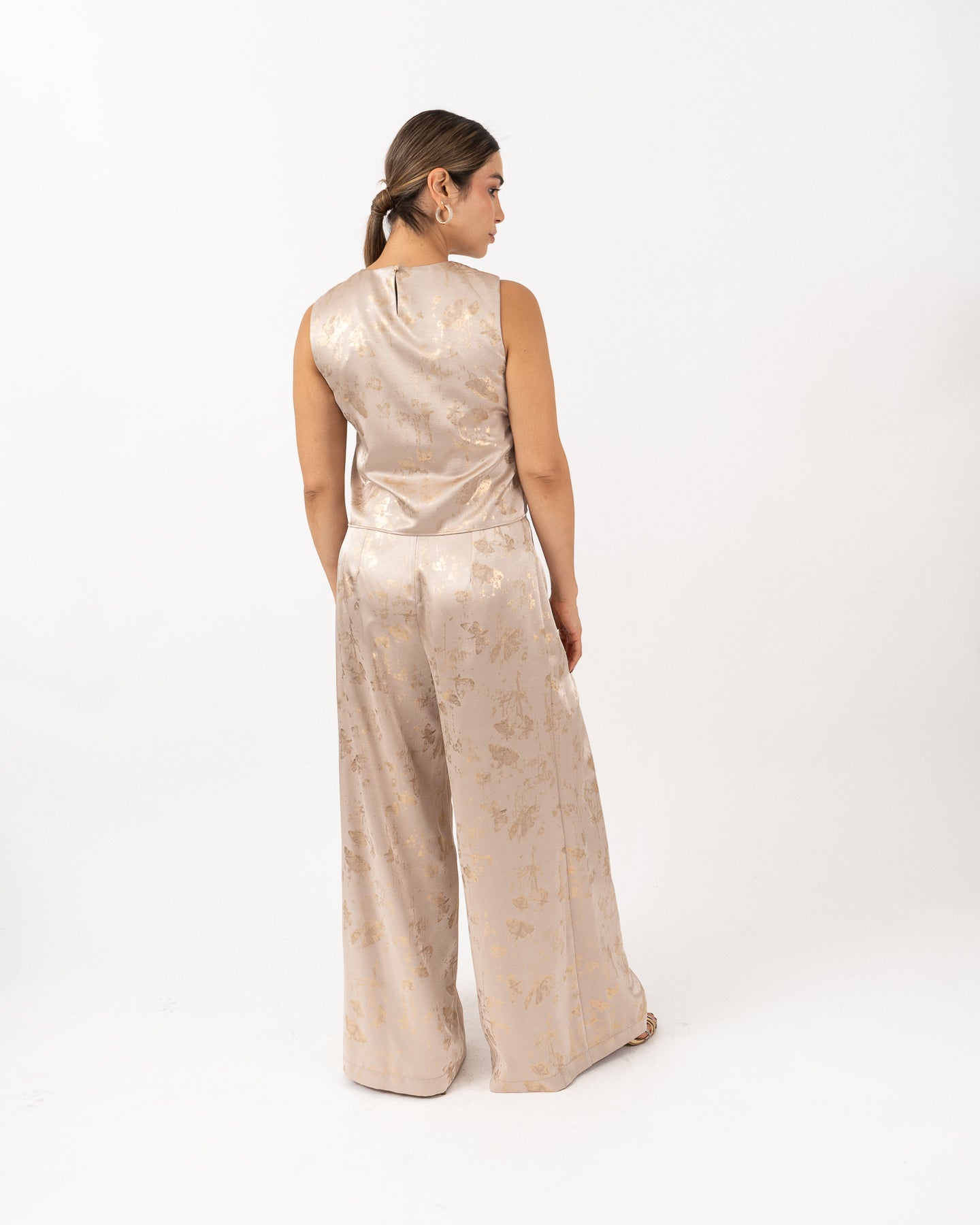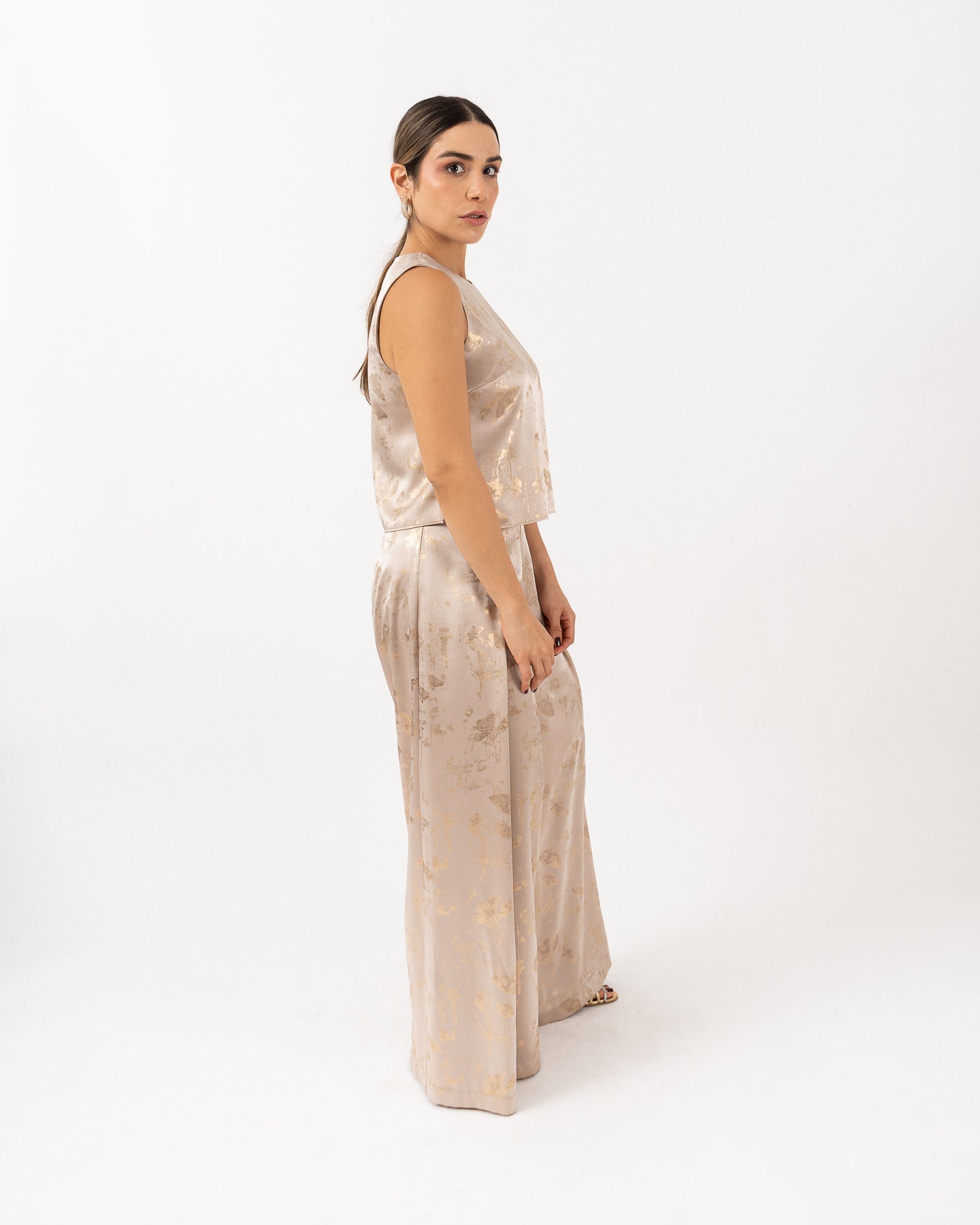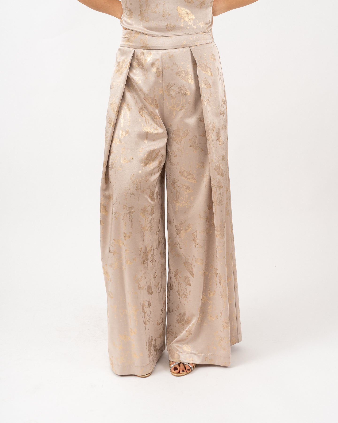 High-rise bullfighter trousers with a waistband and invisible zipper on the left side, wide pleats in the front.