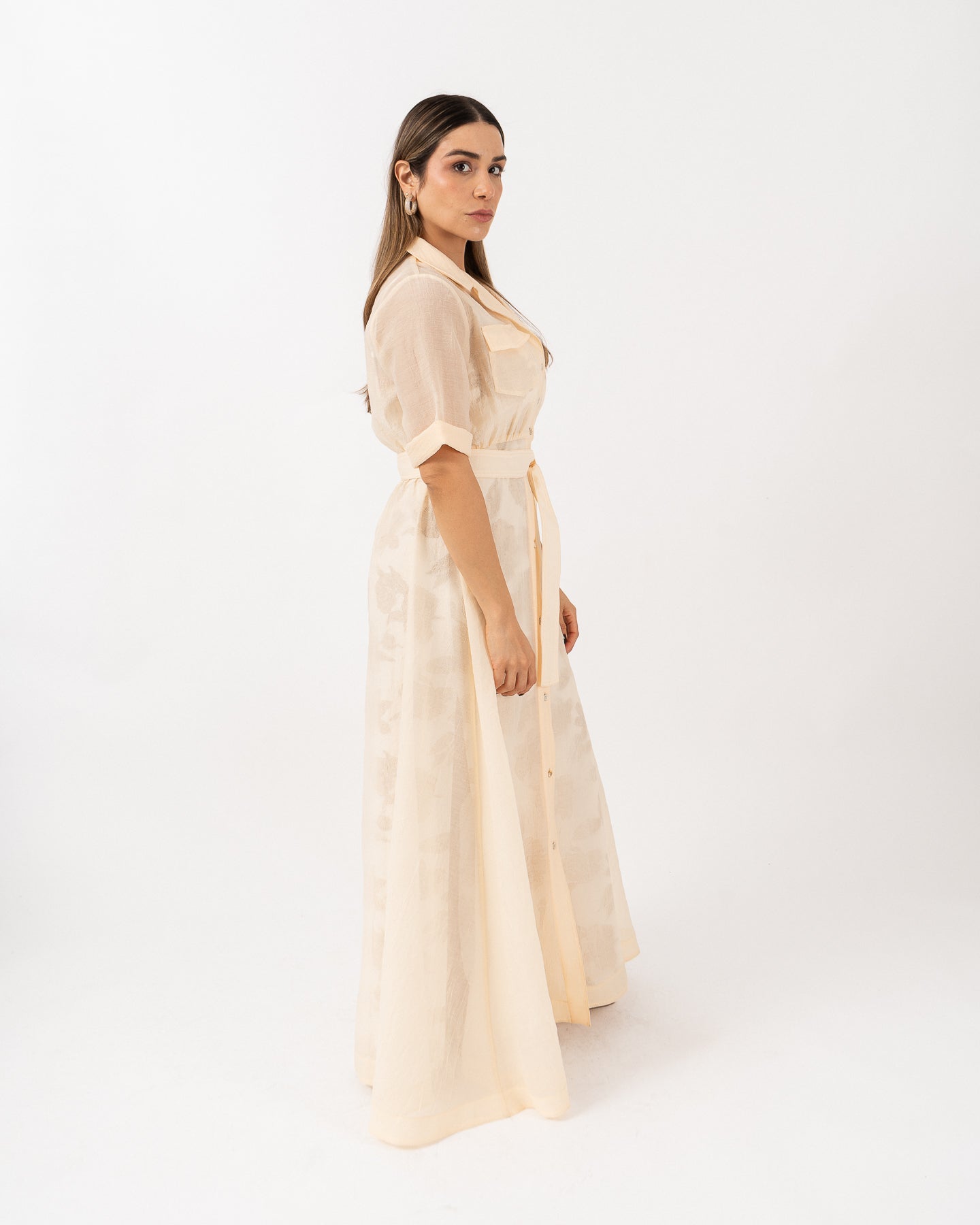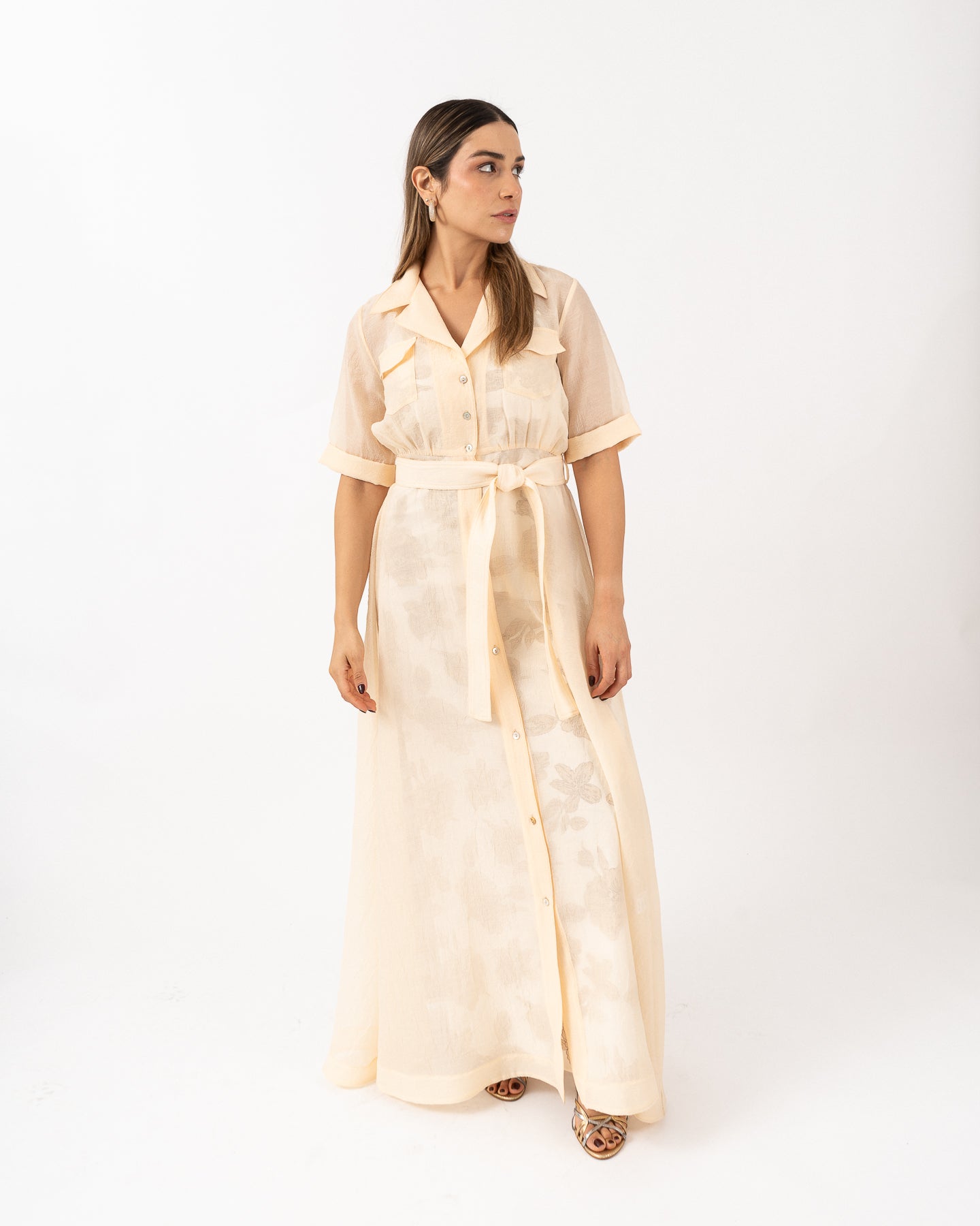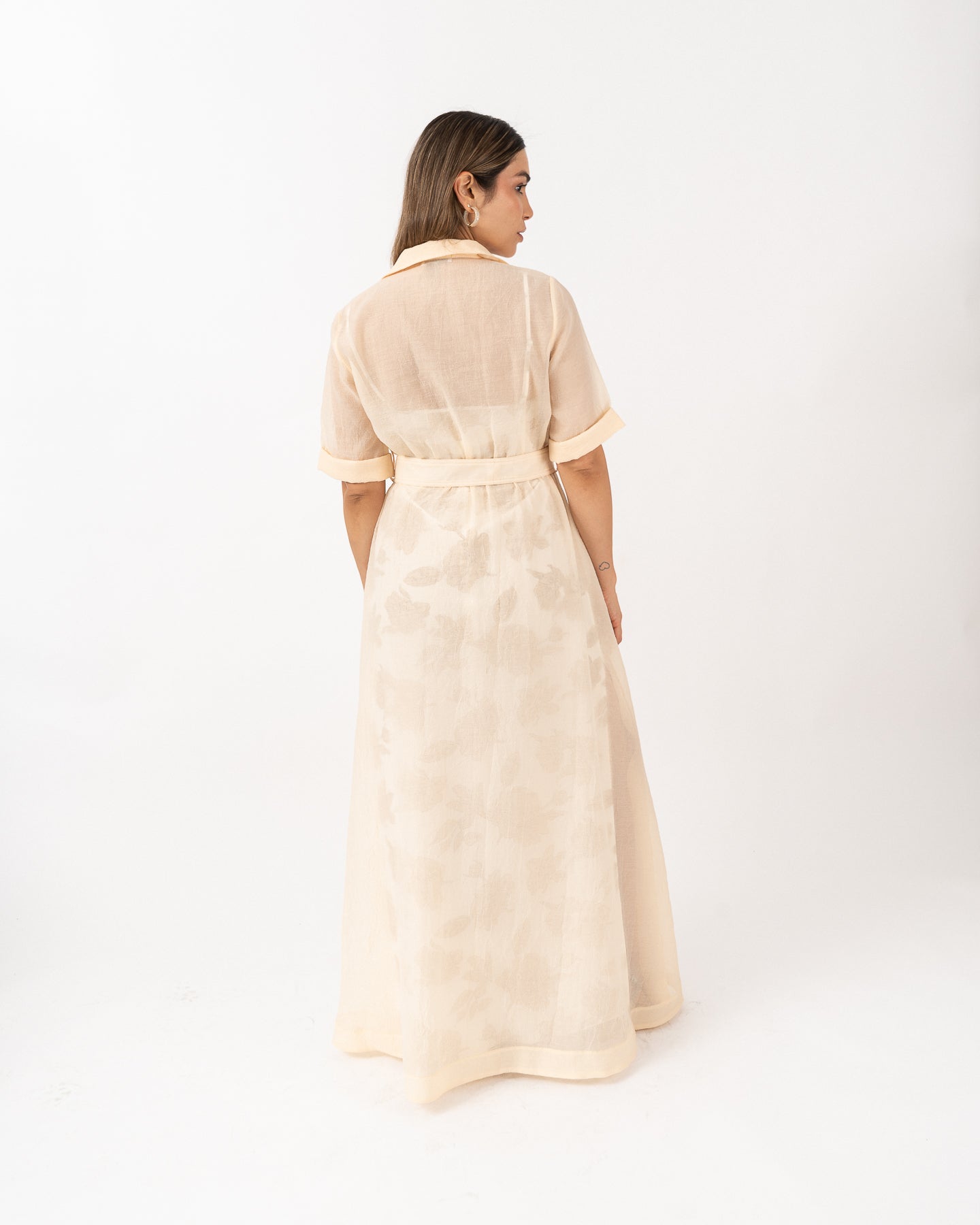 Lapel-neck dress with short sleeves and a duster jacket, functional front closure with shell buttons. Hemline with a ruffle trim and a tie strap for a snug fit at the waist. Printed underdress with straps, side slits, and an invisible zipper at the center back.