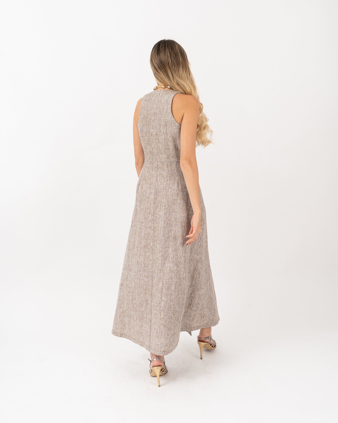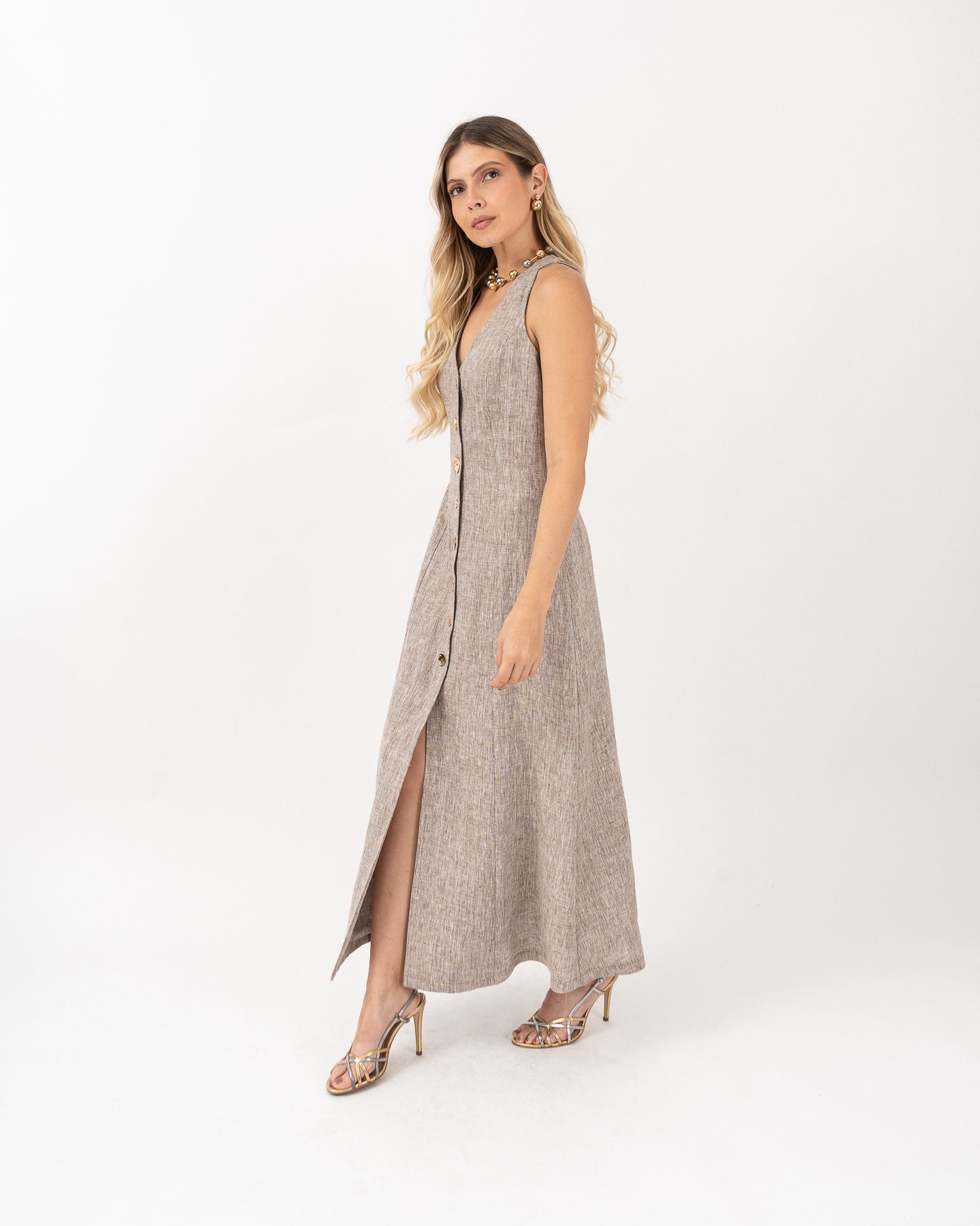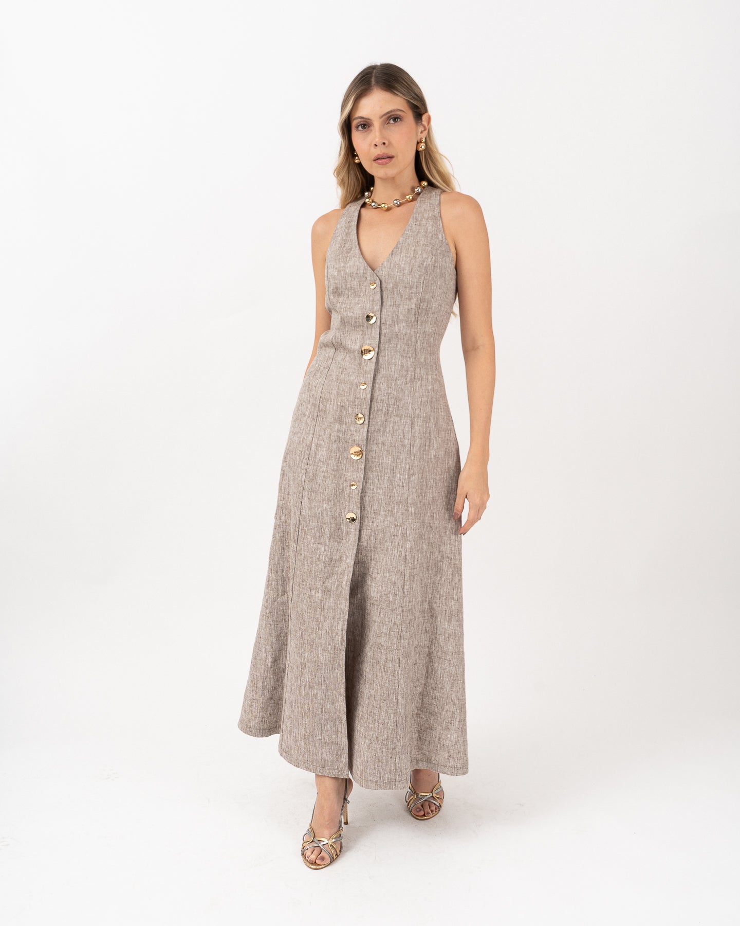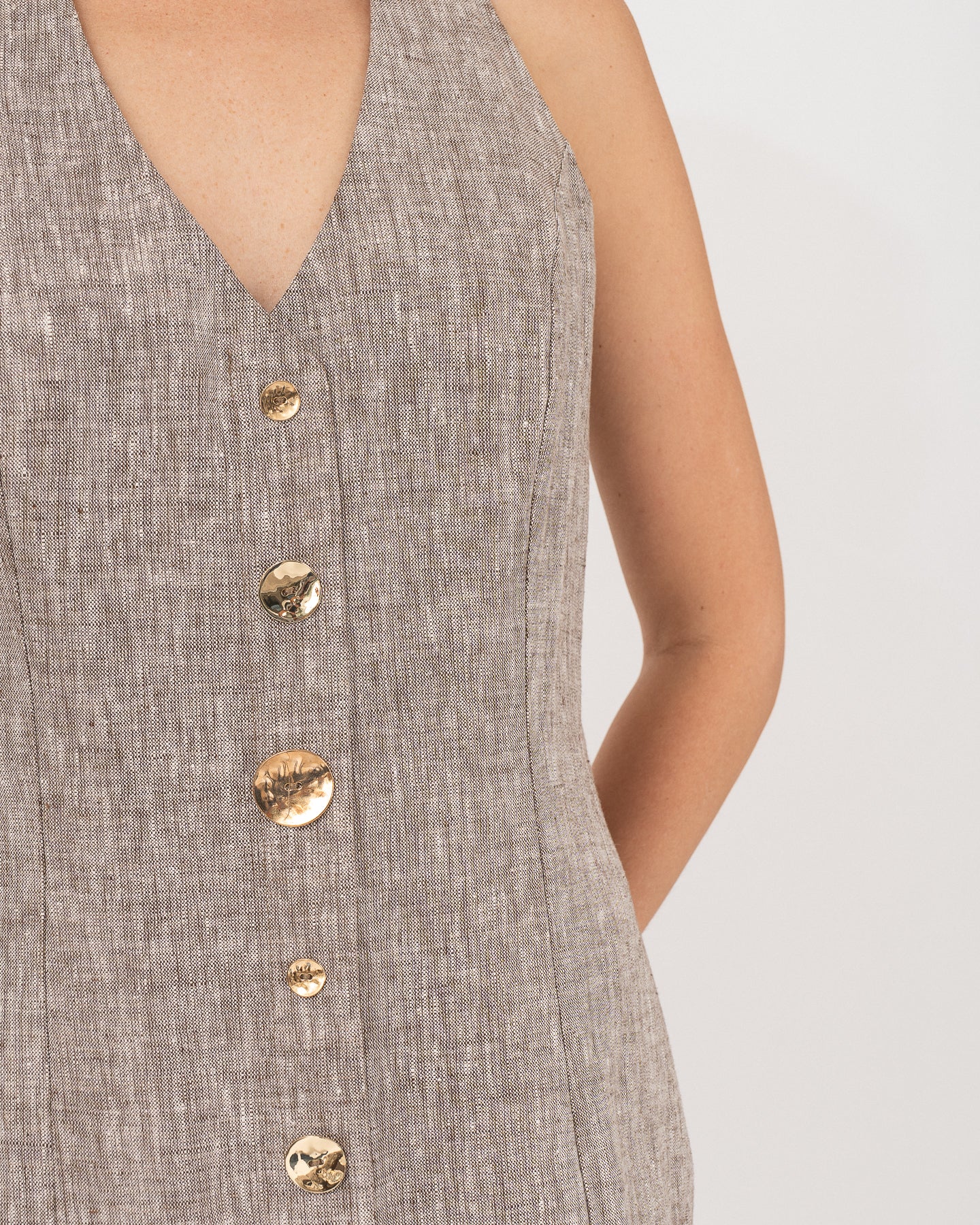 Midi dress with sleeveless V-neckline and decorative gold button detail, functional closure on the left side.